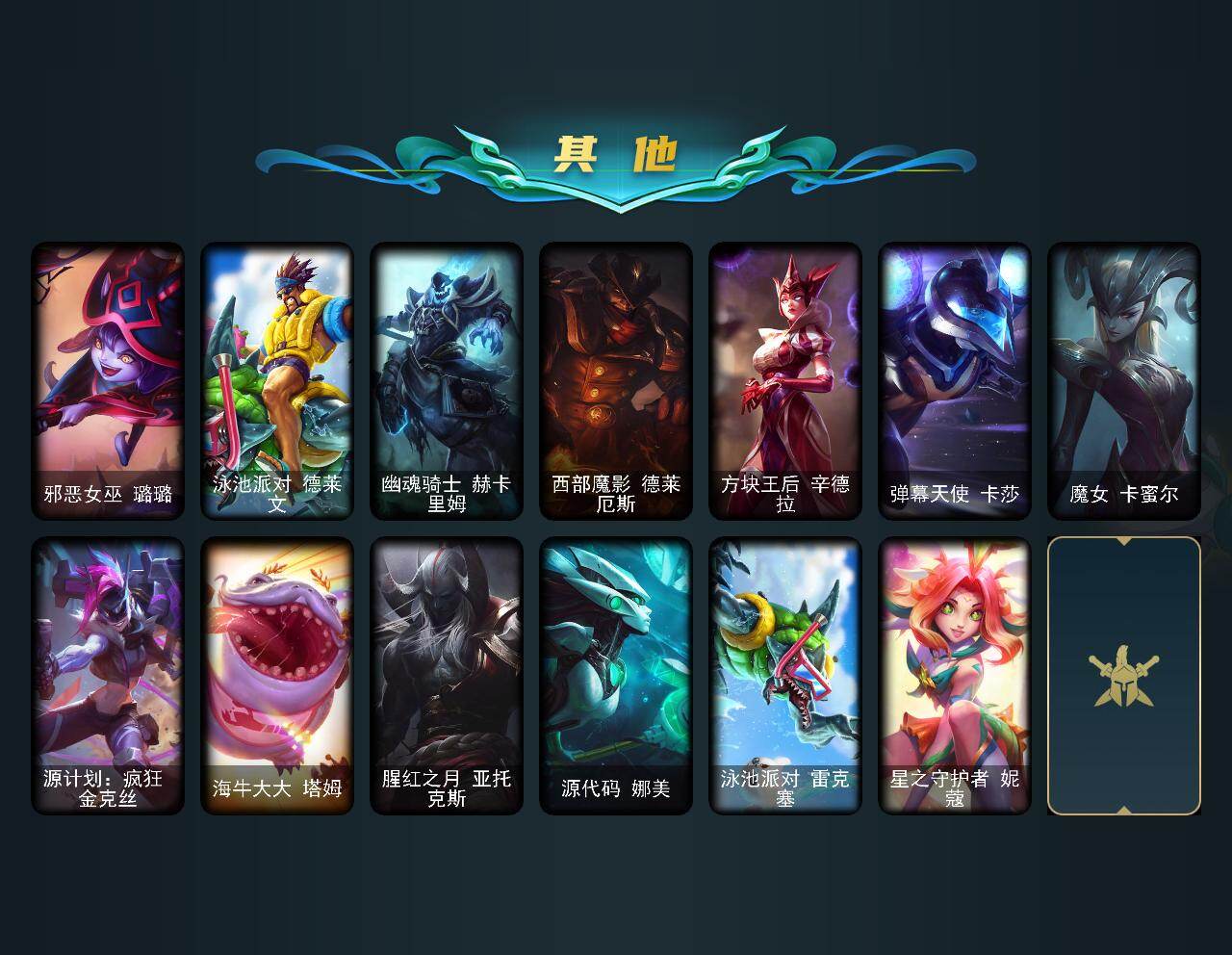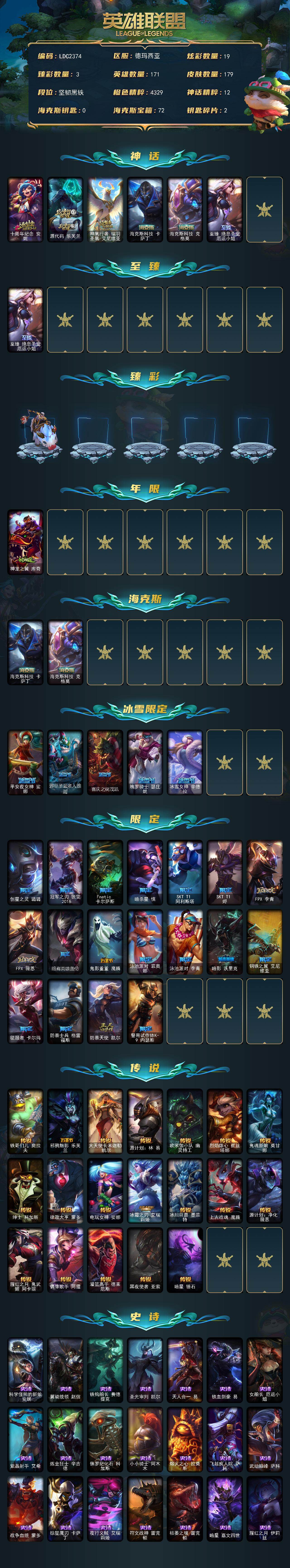 【LDC2374】171英雄/179皮肤/6神话/25限定/3臻彩/19炫彩/19传说/50史诗/未定级/十周年纪念安妮/源代码乐芙兰/神凰行者瑞羽圣凰艾尼维亚/海克斯科技卡萨丁/海克斯科技克格莫/至臻绝息圣堂厄运小姐/无畏骑士瑟庄妮赤子初心/星之守护者奥莉安娜未来之光/魔女阿卡丽虚荣/神龙之翼库奇/平安夜女神娑娜/邪恶圣诞老人维迦/喜庆之树茂凯/魄罗骑士瑟庄妮/冰雪女神辛德拉/创星之灵璐璐/冠军之刃锐雯2016/Fnatic卡尔萨斯/暗杀星慎/SKTT1阿利斯塔/SKTT1烬/FPX李青/FP