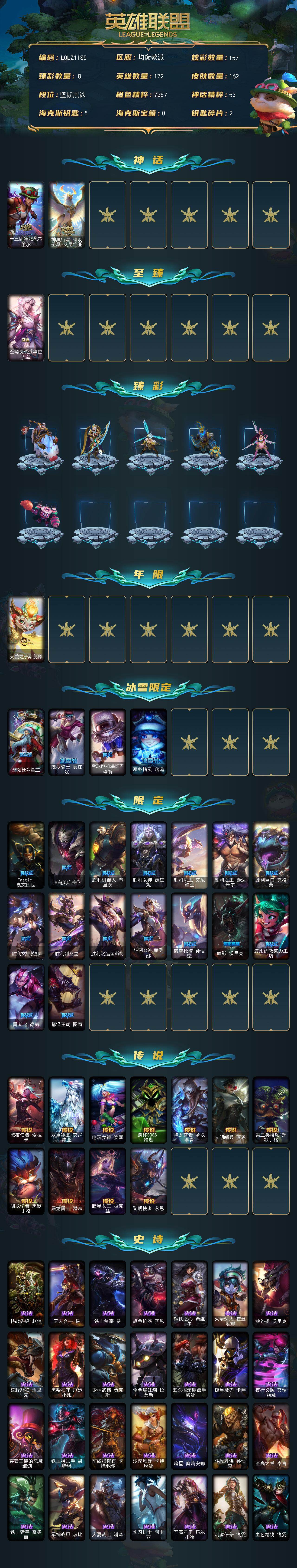 【LOLZ1185】172英雄/162皮肤/3神话/22限定/8臻彩/157炫彩/11传说/34史诗/未定级账号等级:359/十五周年纪念希维尔/神凰行者瑞羽圣凰艾尼维亚/至臻灵魂莲华拉克丝/无畏骑士瑟庄妮赤子初心/冠军之箭艾希凯旋圣装/冰霜之刃艾瑞莉娅炫金/冠军典狱长锤石凯旋圣装/玉剑传说舞剑仙承影/可爱可爱粉红红布里茨/春晖神女艾希玉露金风/魔女阿卡丽虚荣/天龙之子斯莫德/圣诞狂欢基兰/魄罗骑士瑟庄妮/雪球也能爆炸吉格斯/寒冬精灵璐璐/Fnatic嘉文四世/暗裔英雄盖伦/胜利机器人布里茨/胜