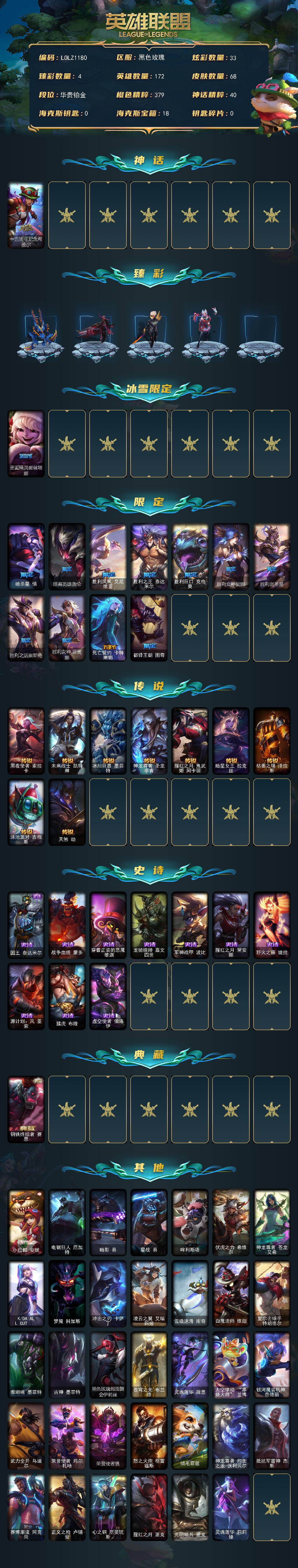 172英雄/68皮肤/1神话/13限定/4臻彩/33炫彩/9传说/10史诗/铂金账号等级:474/十五周年纪念希维尔