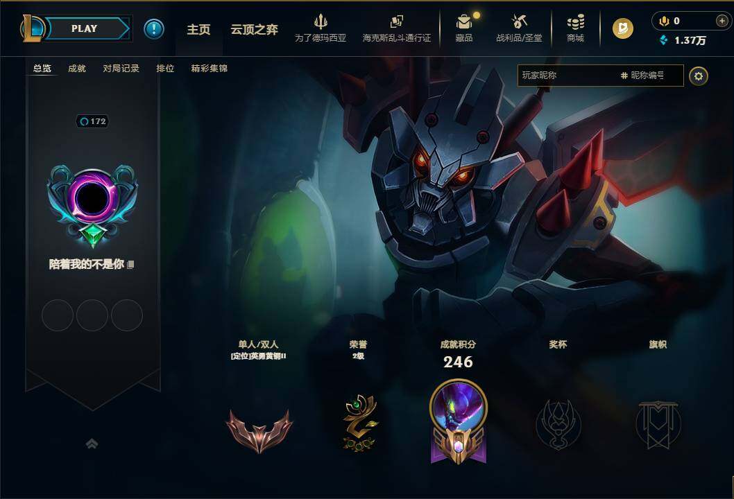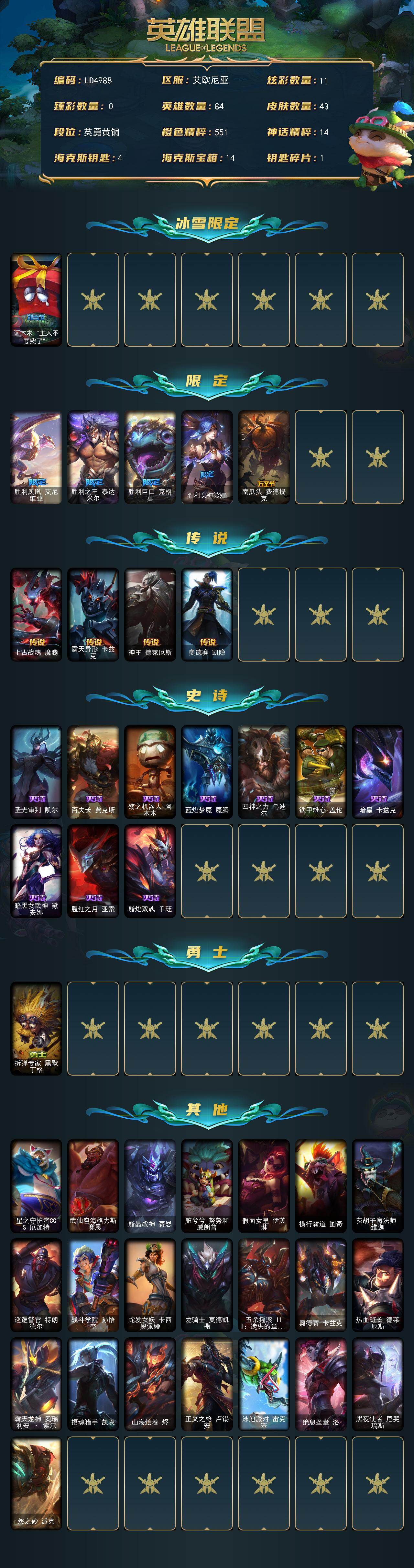 84英雄/43皮肤/6限定/11炫彩/4传说/10史诗/青铜账号等级:172/