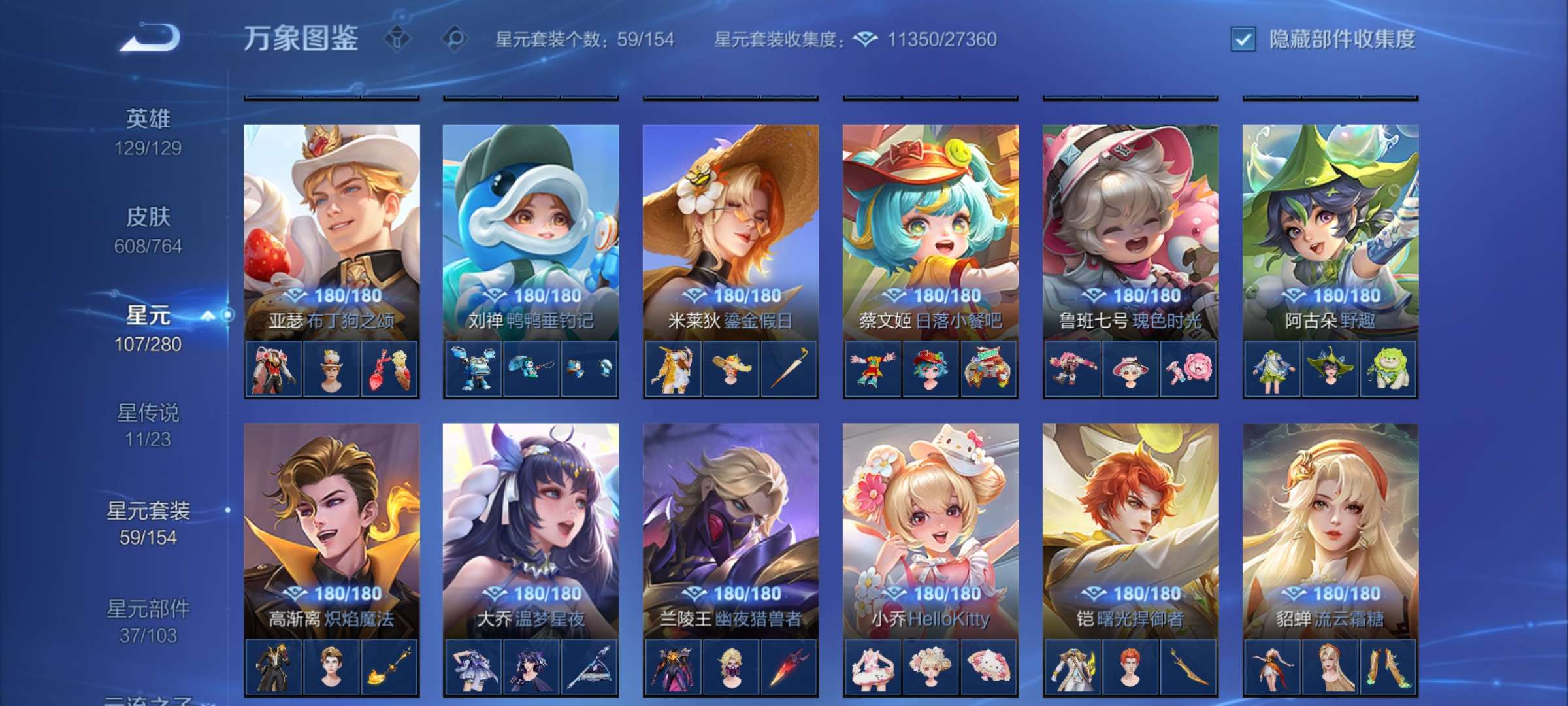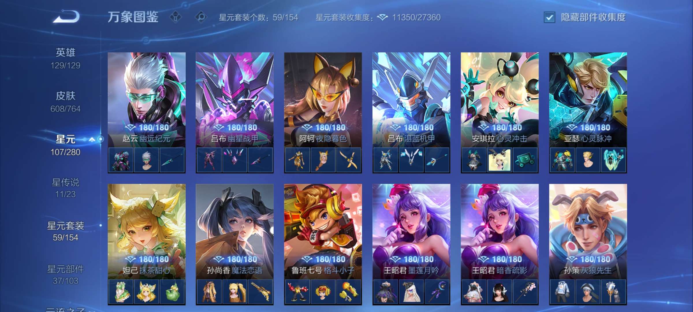 一手号:13典藏11星传说、还有1颗水晶未用;皮肤戳戳1237、皮肤碎片1401天幕9个累计充值7万