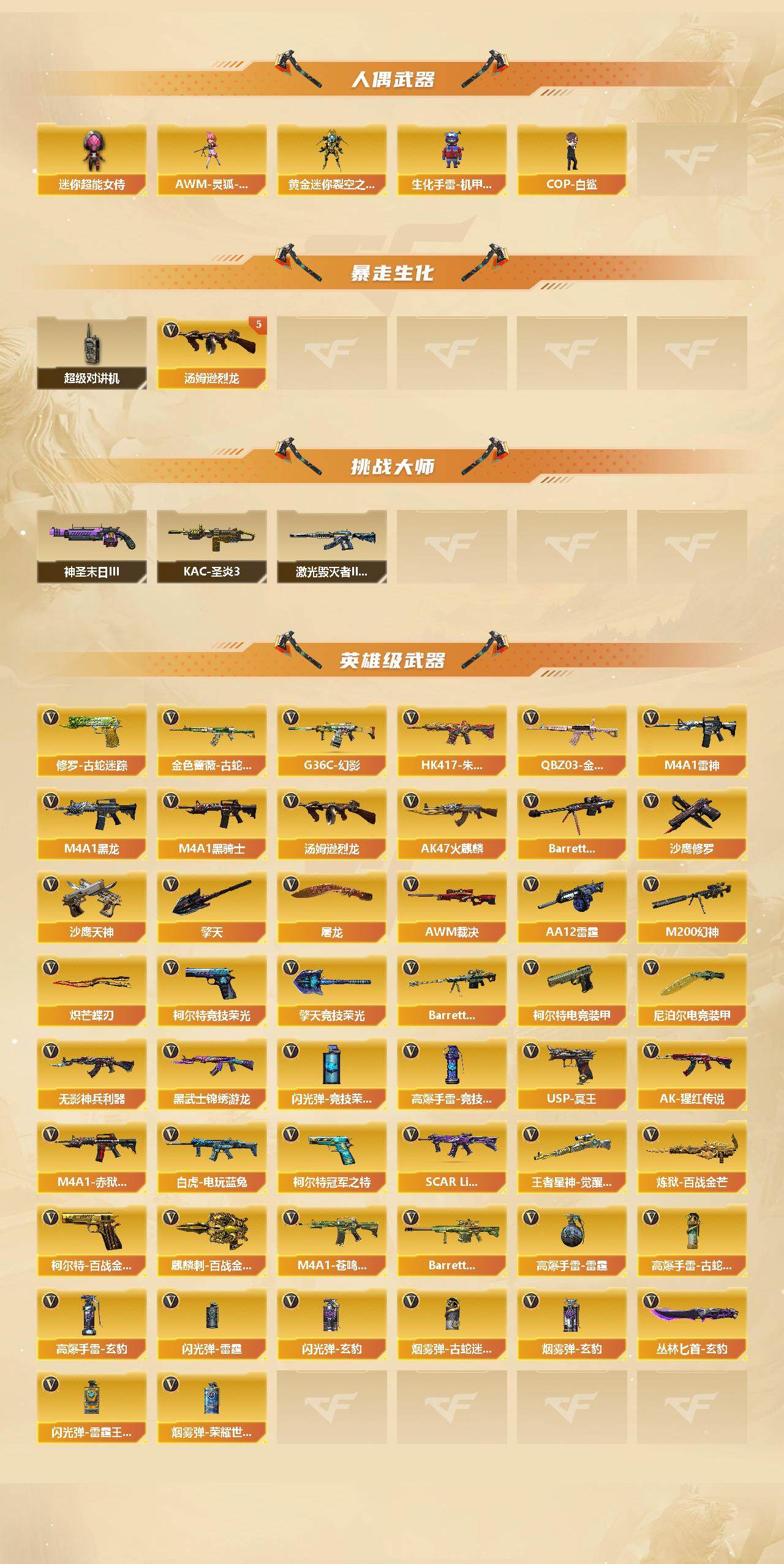 【热门武器】:传说暗裔,传说辉光,G36C-幻影,QBZ03-金色蔷薇,HK417-朱雀,M200-幻神,金色蔷薇-古蛇迷踪,修罗-古蛇迷踪,白虎-电玩蓝兔,柯尔特-冠军之特*2,M4A1-黑骑士*2,汤姆逊-烈龙*5,羊驼玩偶,COP-白鲨,沙鹰-修罗,Knife-冠军之刃,炽芒蝶刃,炽芒蝶刃-破浪逐光 皮肤,黄金猫猫手套-白鲨