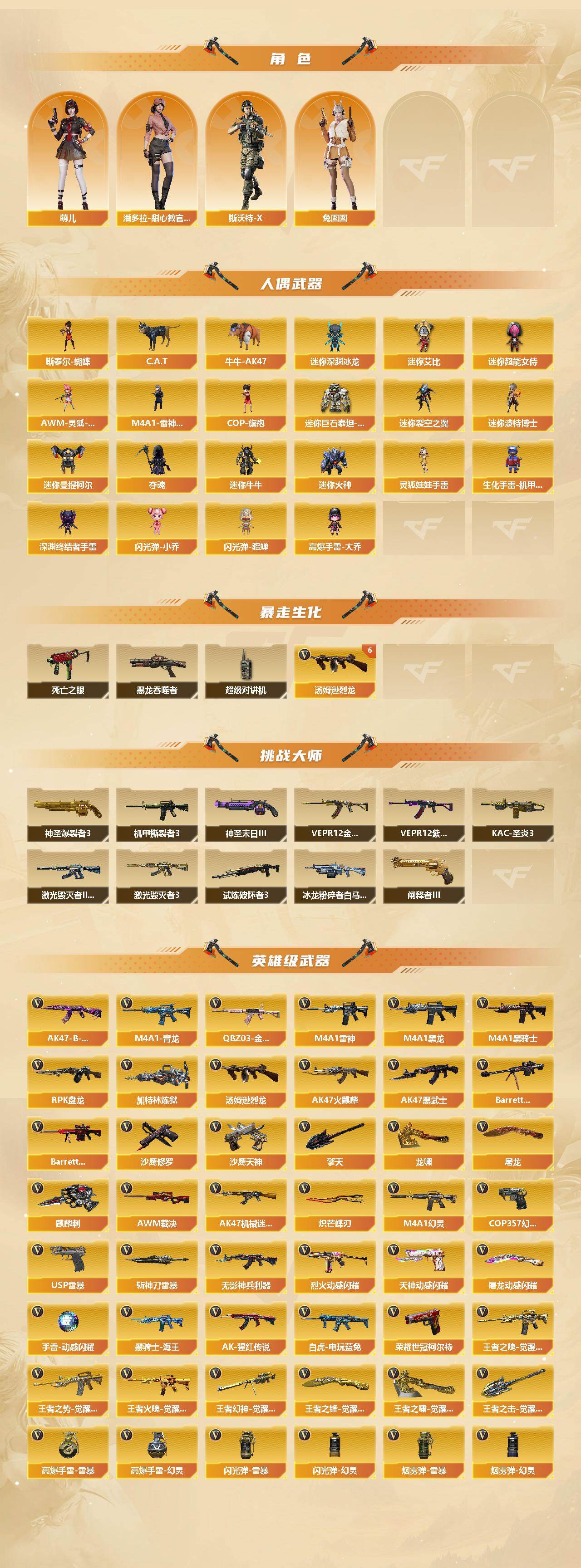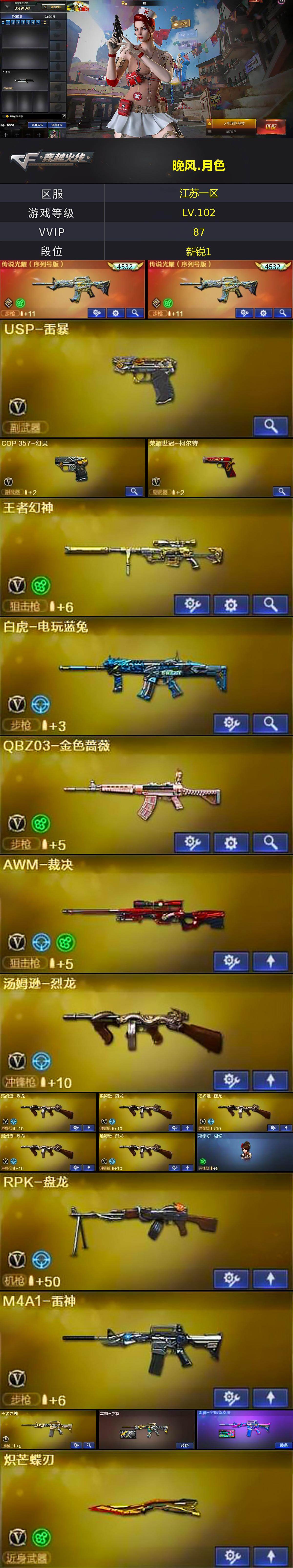 【热门武器】:传说光耀,QBZ03-金色蔷薇,M4A1-青龙,死亡之眼,白虎-电玩蓝兔,荣耀世冠-柯尔特,C.A.T,牛牛-AK47,M4A1-黑骑士*3,汤姆逊-烈龙*6,RPK-盘龙,加特林-炼狱*2,斯泰尔-蝴蝶,USP-雷暴,COP 357-幻灵,沙鹰-修罗*4,炽芒蝶刃