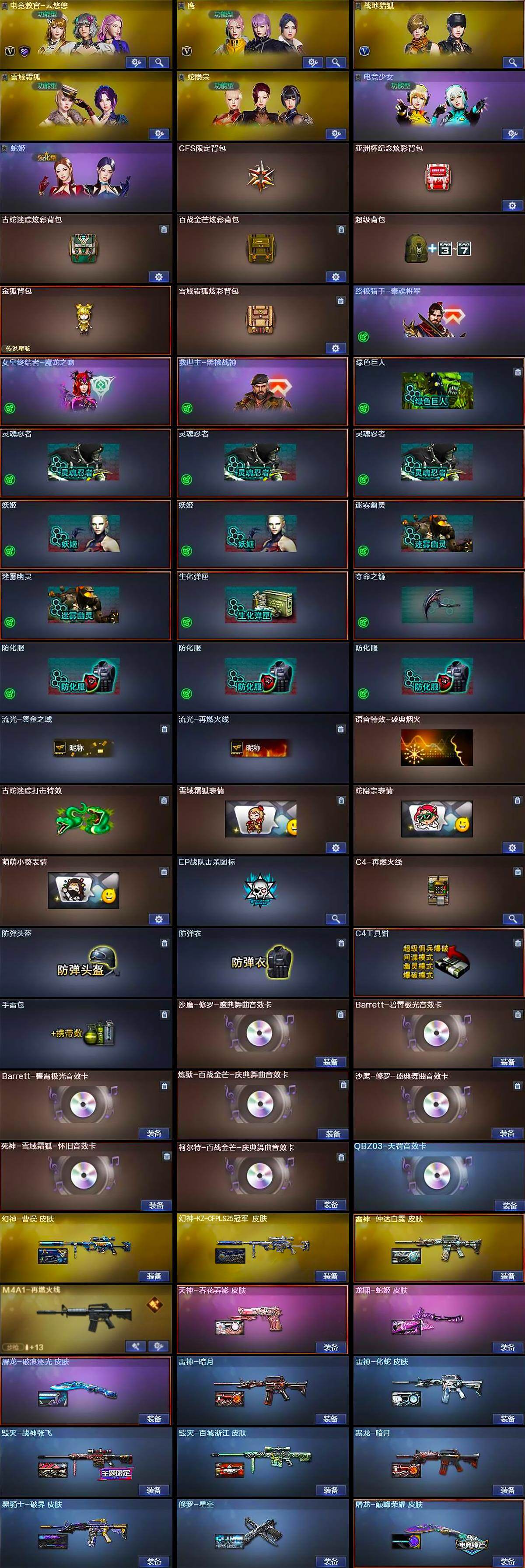 【音效卡】:QBZ03-天罚音效卡,沙鹰-修罗-盛典舞曲音效卡*2,Barrett-碧霄极光音效卡*2,炼狱-百战金芒-庆典舞曲音效卡,死神-雪域霜狐-怀旧音效卡,柯尔特-百战金芒-庆典舞曲音效卡