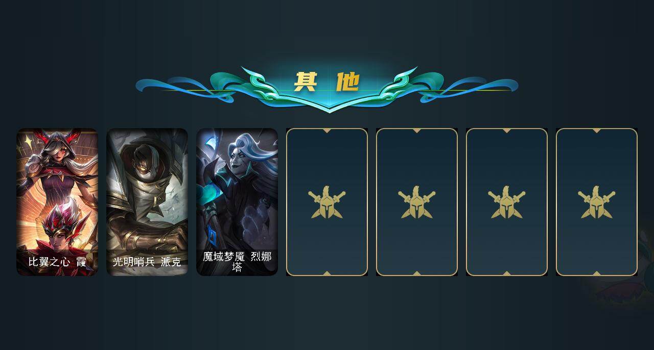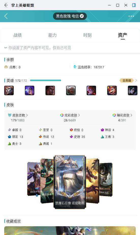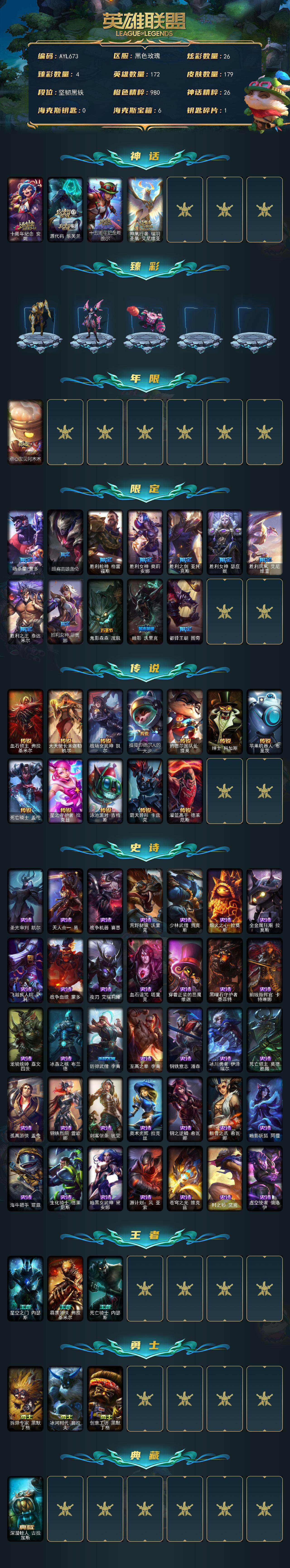 未定级段位-172英雄-179皮肤-26炫彩-0终极-4神话-13限定-12传说-35史诗