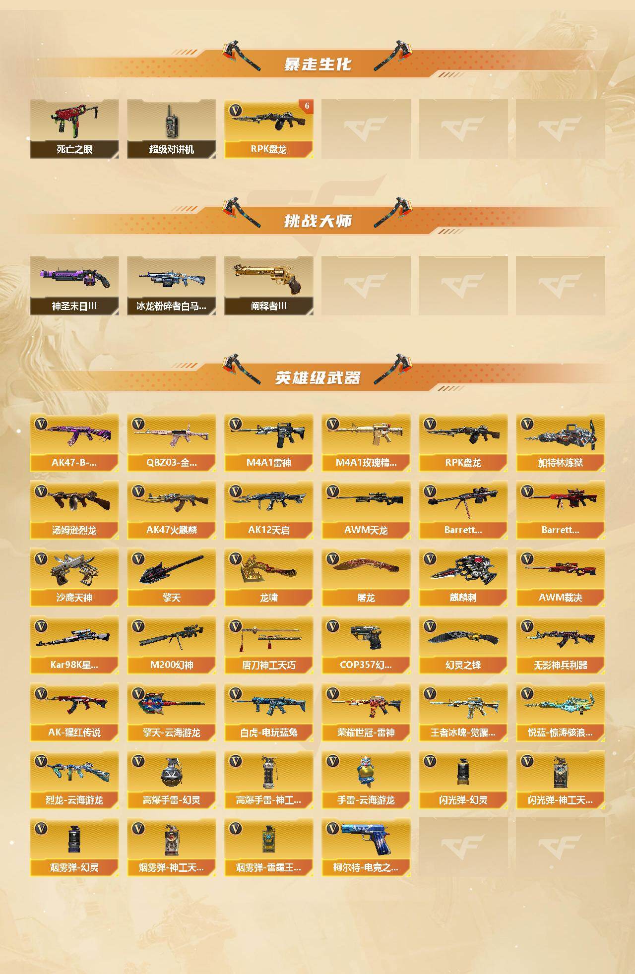 【热门武器】:传说光耀,QBZ03-金色蔷薇*3,M200-幻神,死亡之眼,荣耀世冠-雷神,白虎-电玩蓝兔,Kar98K-星神,汤姆逊-烈龙,RPK-盘龙*6,加特林-炼狱,雷神-小红,毁灭-孙三炮,COP 357-幻灵,黄金猫猫手套-白鲨