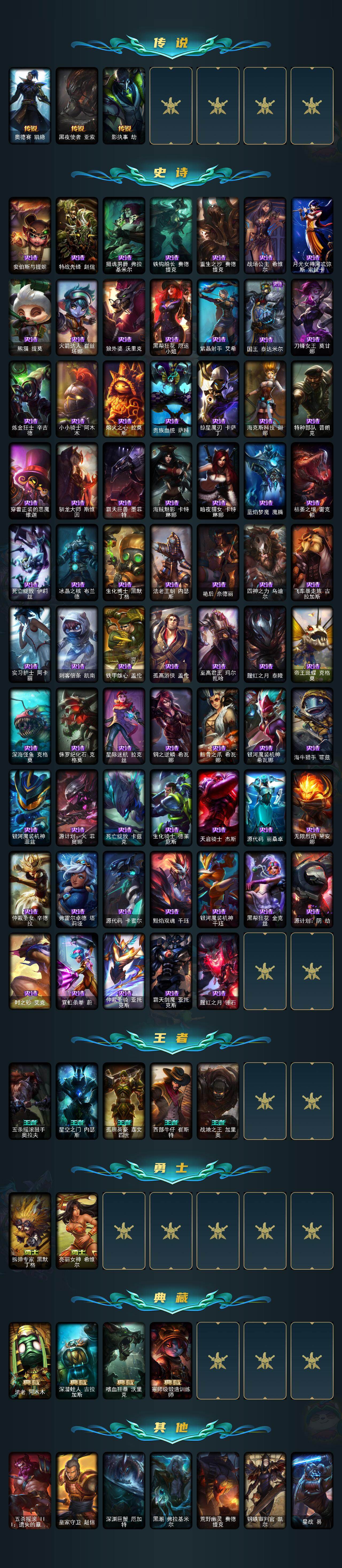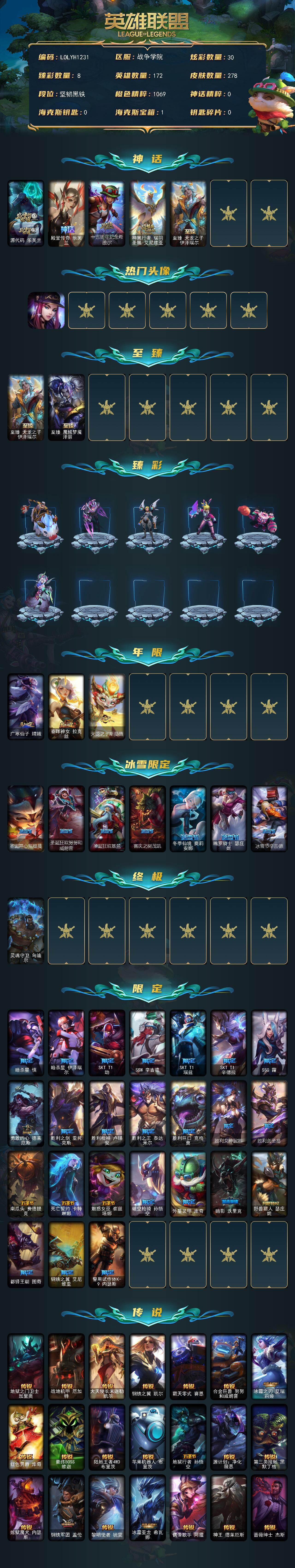 172英雄/278皮肤/1终极/6神话/34限定/8臻彩/30炫彩/24传说/68史诗/未定级/
