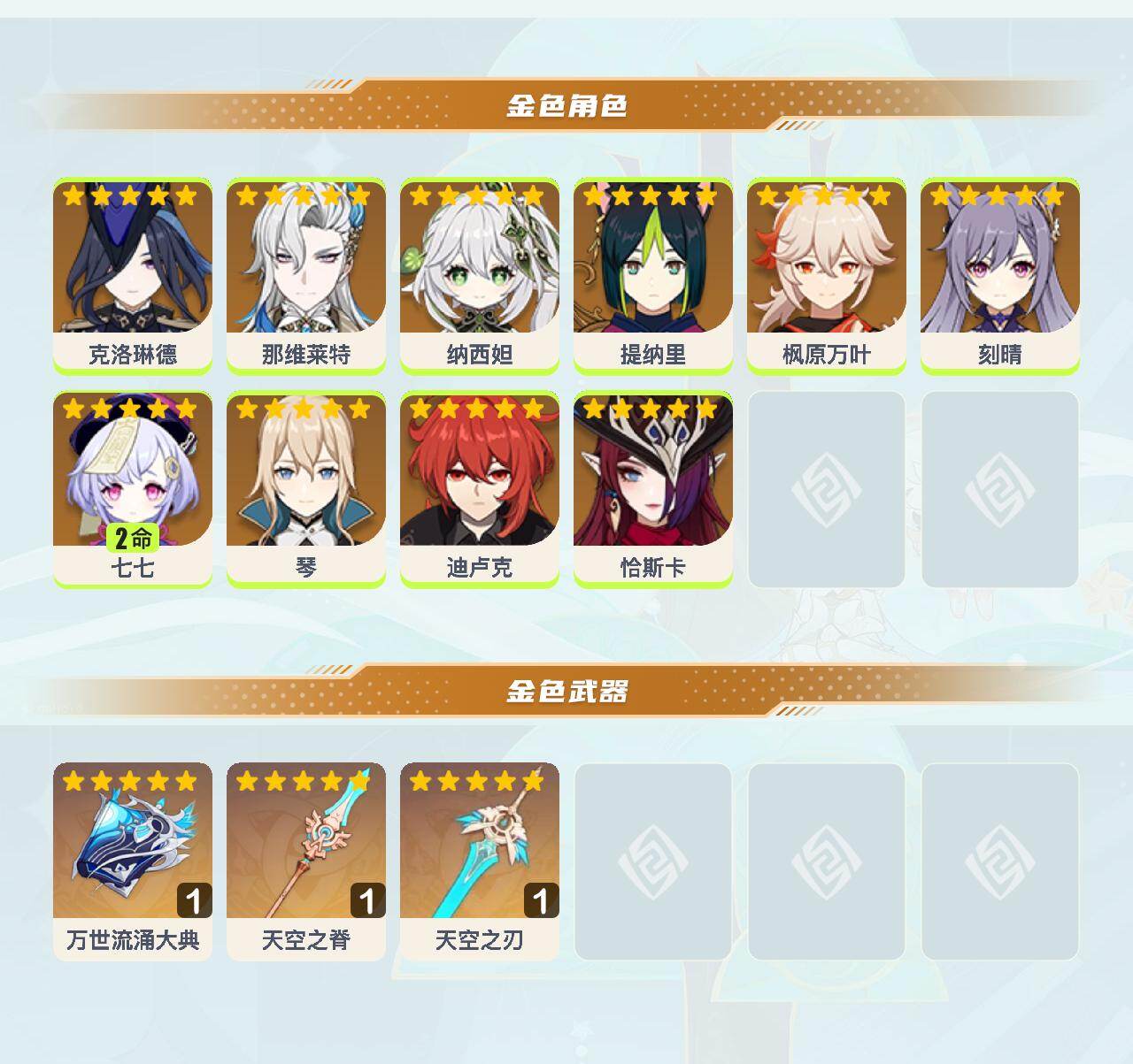 【YSN2334】56级/15黄/女主/10个五星角色/3个五星武器/枫原万叶/克洛琳德/恰斯卡/纳西妲/2命七七/迪卢克/琴/刻晴/提纳里/那维莱特/万世流涌大典/天空之刃/天空之脊