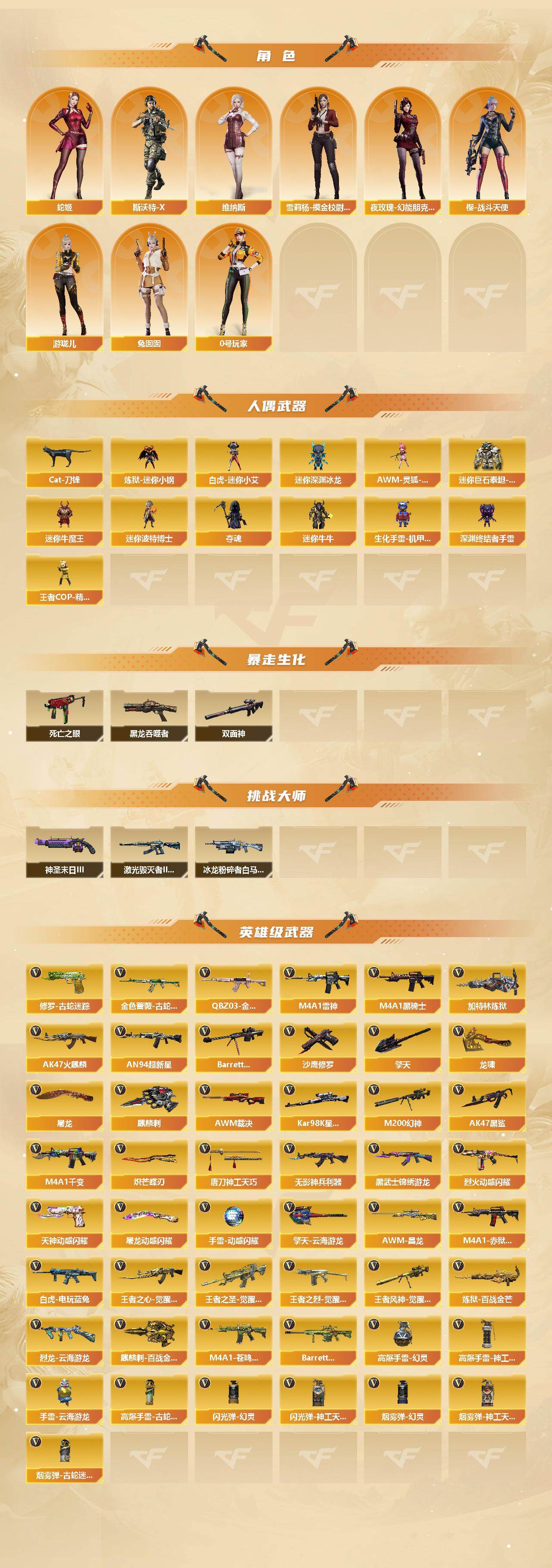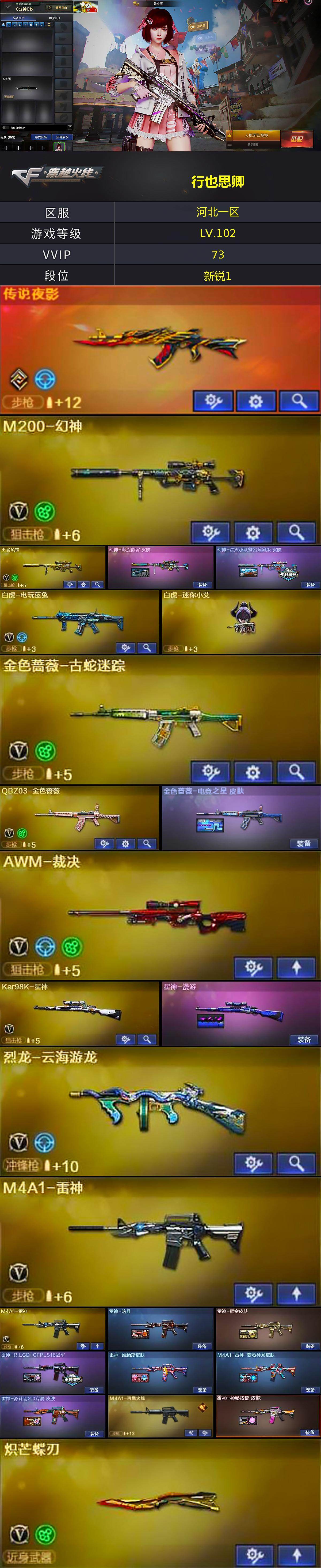 【热门武器】:传说夜影,QBZ03-金色蔷薇,M200-幻神,金色蔷薇-古蛇迷踪,修罗-古蛇迷踪,死亡之眼,白虎-电玩蓝兔,Kar98K-星神,Cat-刀锋,炼狱-迷你小钢,M4A1-黑骑士,加特林-炼狱*3,沙鹰-修罗*4,炽芒蝶刃,金刚伞