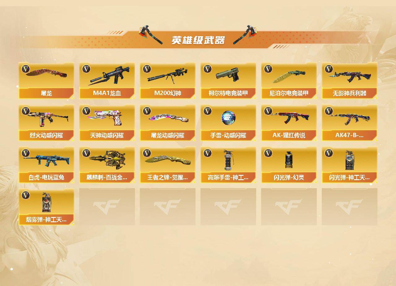 【皮肤】:M200-幻神-荣耀世冠白鲨,金色蔷薇-电竞之星 皮肤,裁决-过载 皮肤,雷神-虎将,M4A1-战神赵云,M4A1-再燃火线,火麒麟-雷神*2,火麒麟-华夏之心,火麒麟-心