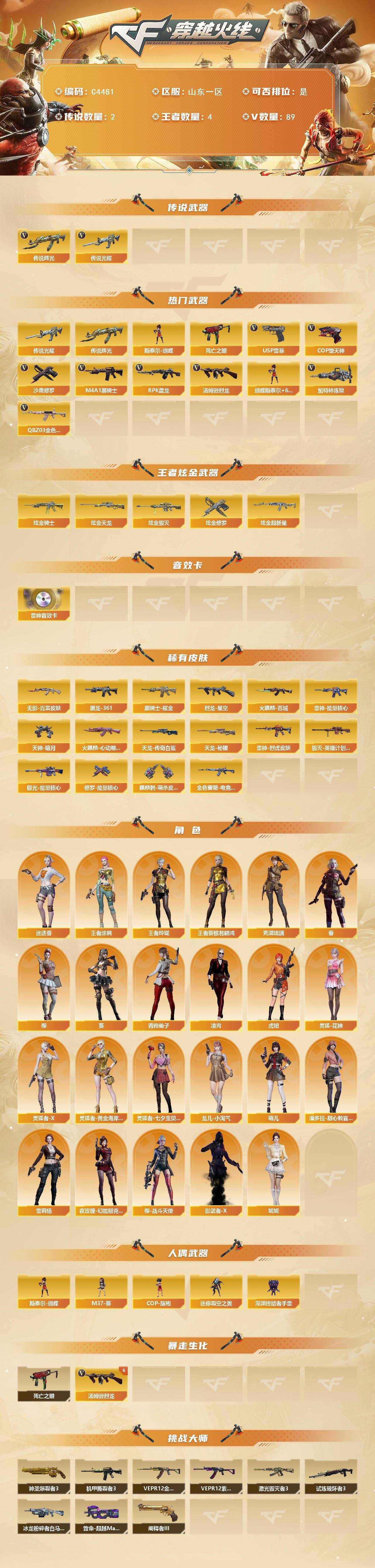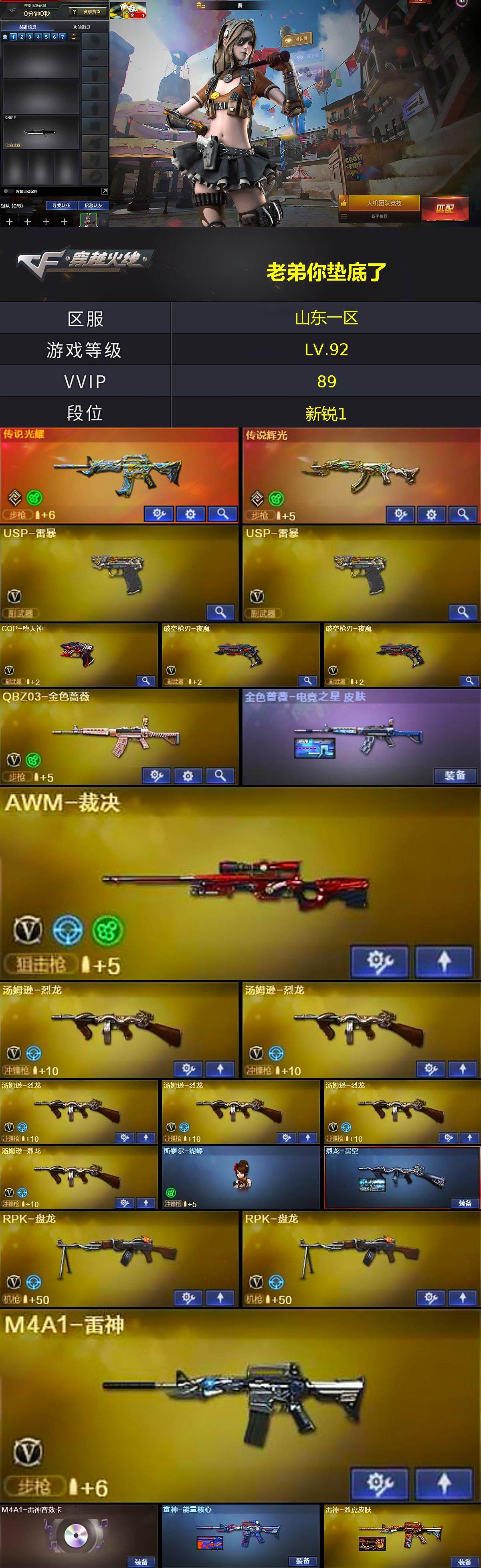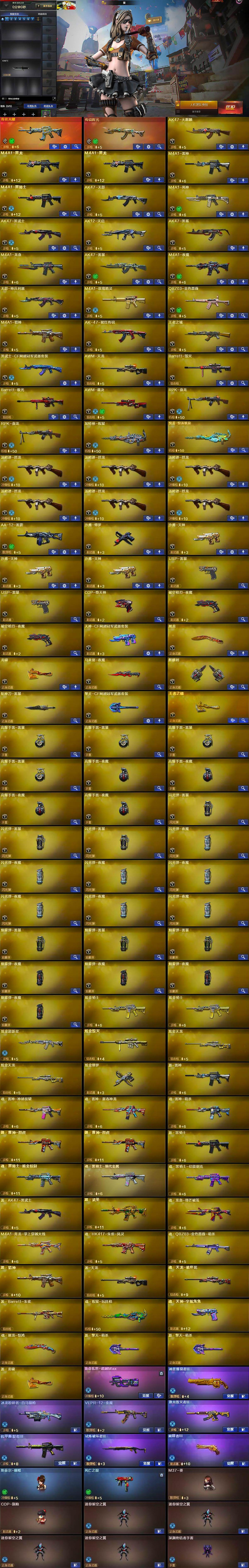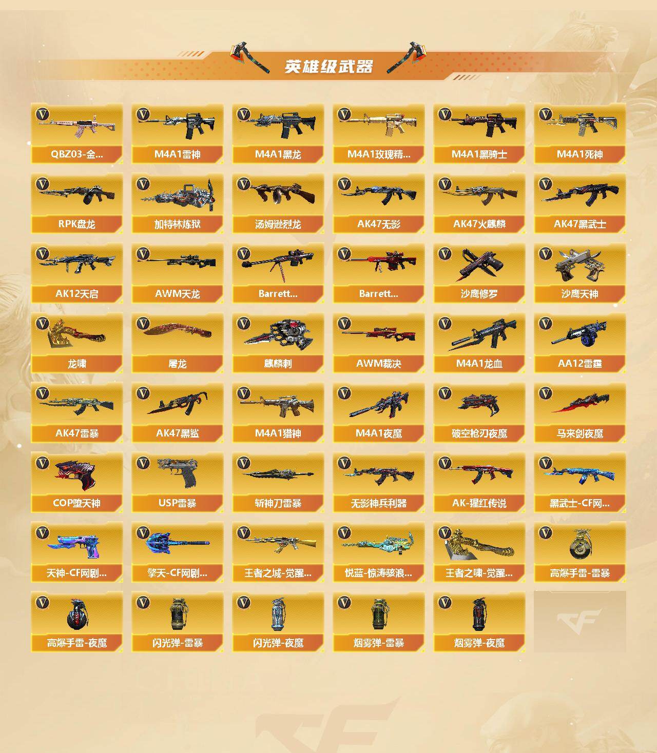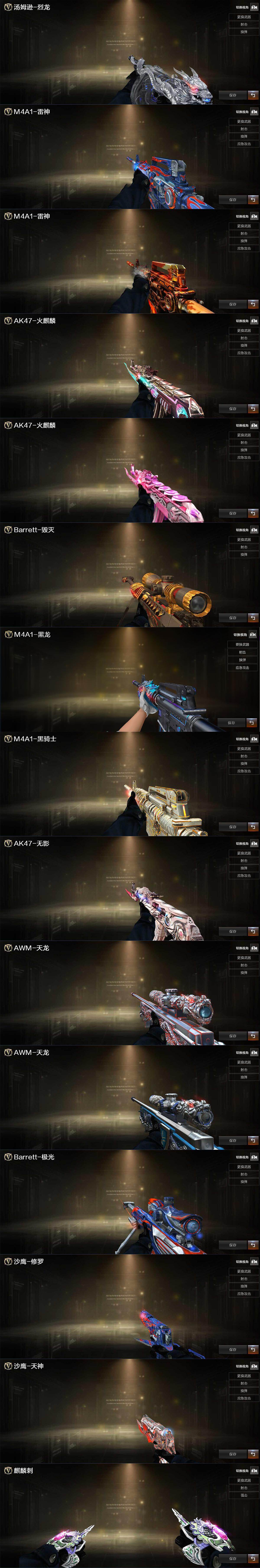 【热门武器】:传说光耀,传说辉光,QBZ03-金色蔷薇,死亡之眼,M4A1-黑骑士,汤姆逊-烈龙*6,RPK-盘龙*2,加特林-炼狱,斯泰尔-蝴蝶,USP-雷暴*2,COP-堕天神,沙鹰-修罗