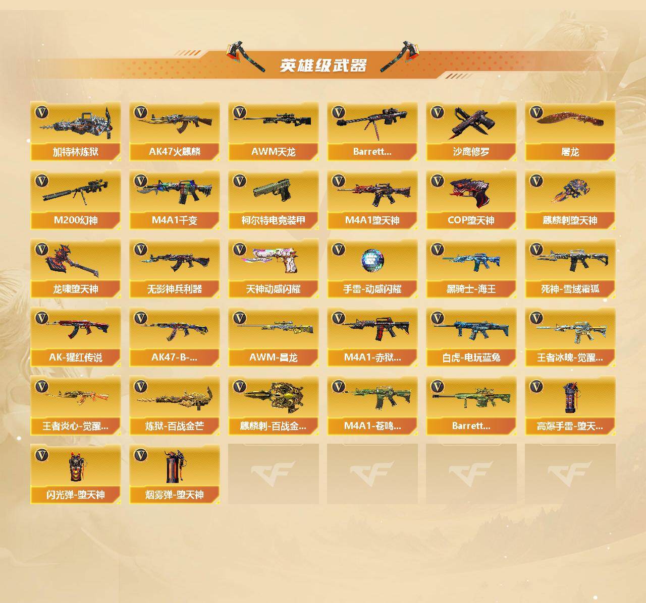 【热门武器】:QBZ03-金色蔷薇,M200-幻神,死亡之眼,白虎-电玩蓝兔,M4A1-黑骑士,RPK-盘龙*2,加特林-炼狱,COP-堕天神,沙鹰-修罗*5