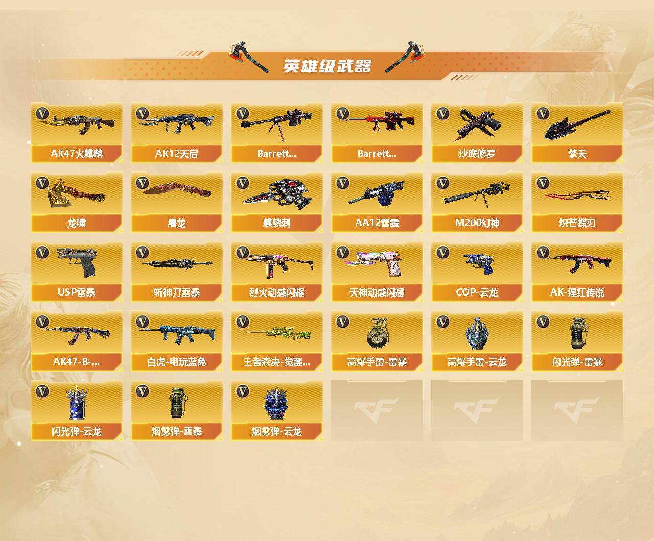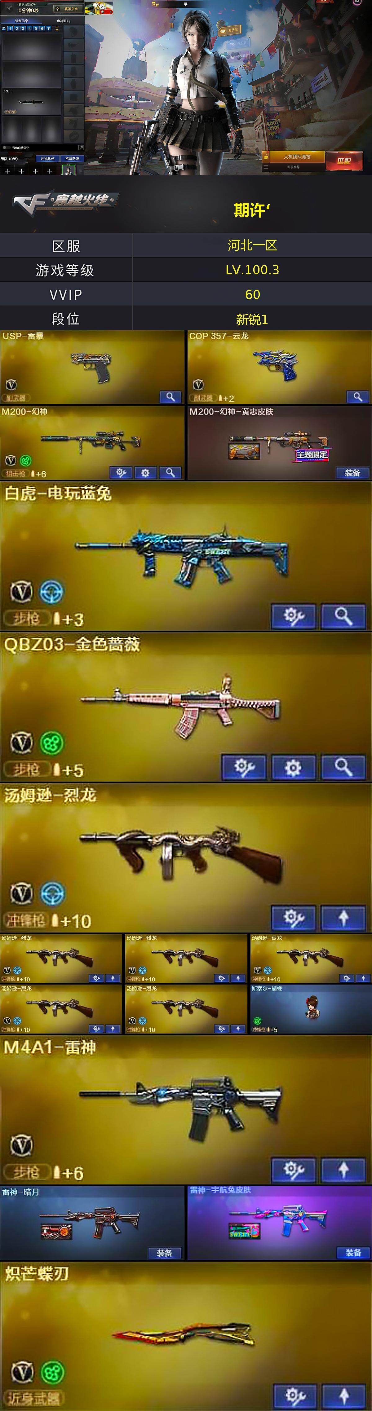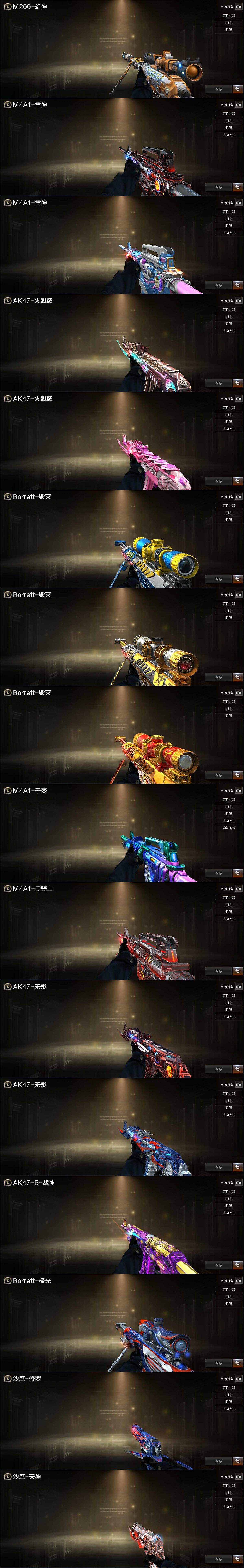 【热门武器】:QBZ03-金色蔷薇,M200-幻神,白虎-电玩蓝兔,M4A1-黑骑士,汤姆逊-烈龙*6,加特林-炼狱,斯泰尔-蝴蝶,MK5-炽火炎龙,USP-雷暴,沙鹰-修罗*3,炽芒蝶刃