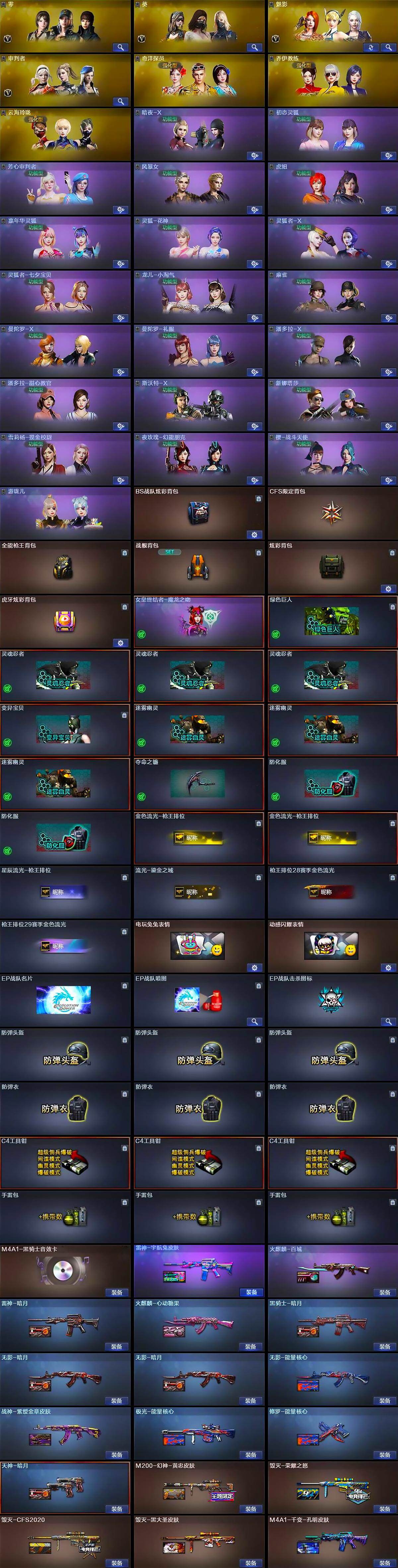【皮肤】:M200-幻神-黄忠皮肤,雷神-暗月,雷神-宇航兔皮肤,火麒麟-百城,火麒麟-心动糖果,毁灭-荣耀之怒,毁灭-CFS2020,毁灭-黑大圣皮肤,M4A1-千变-孔明皮肤,黑骑士-暗月,无影-暗月*2,无影