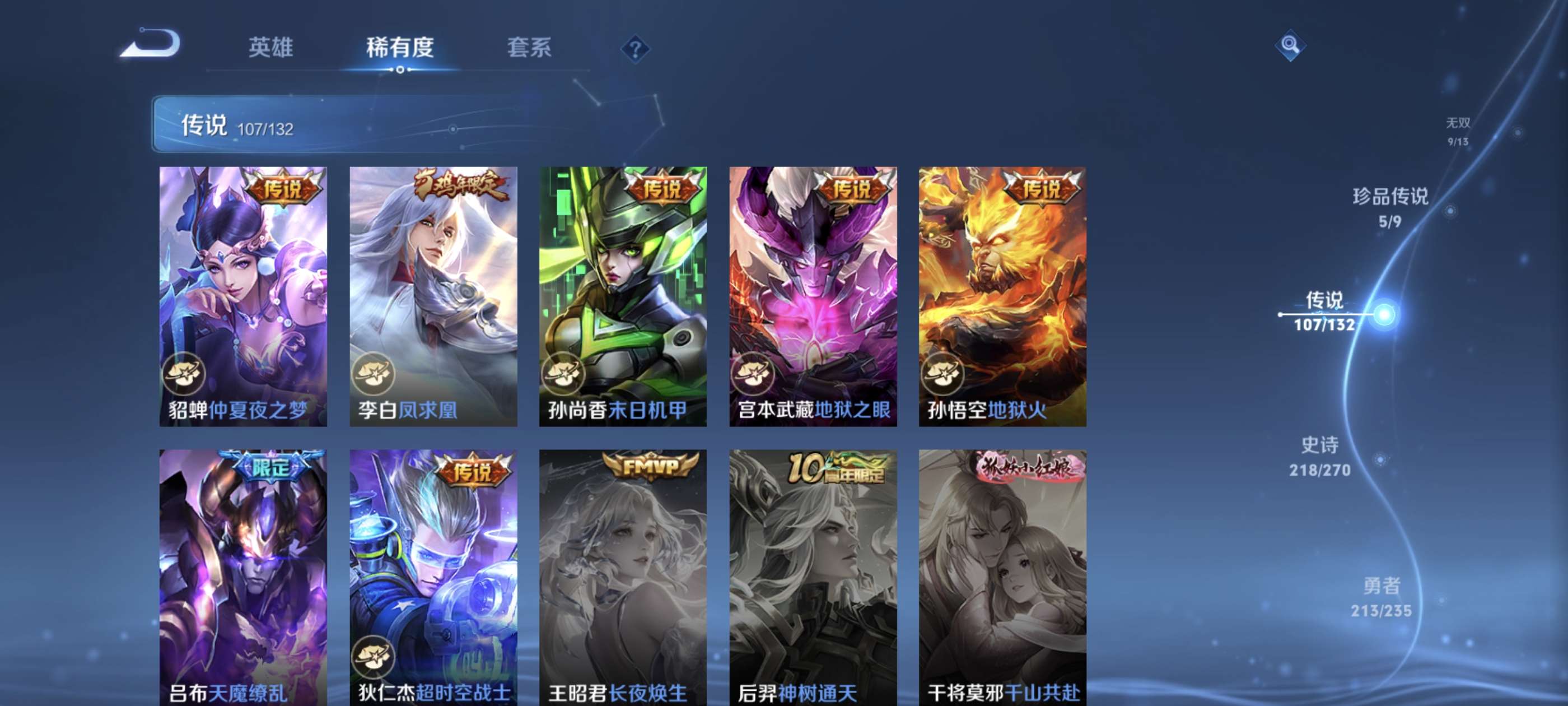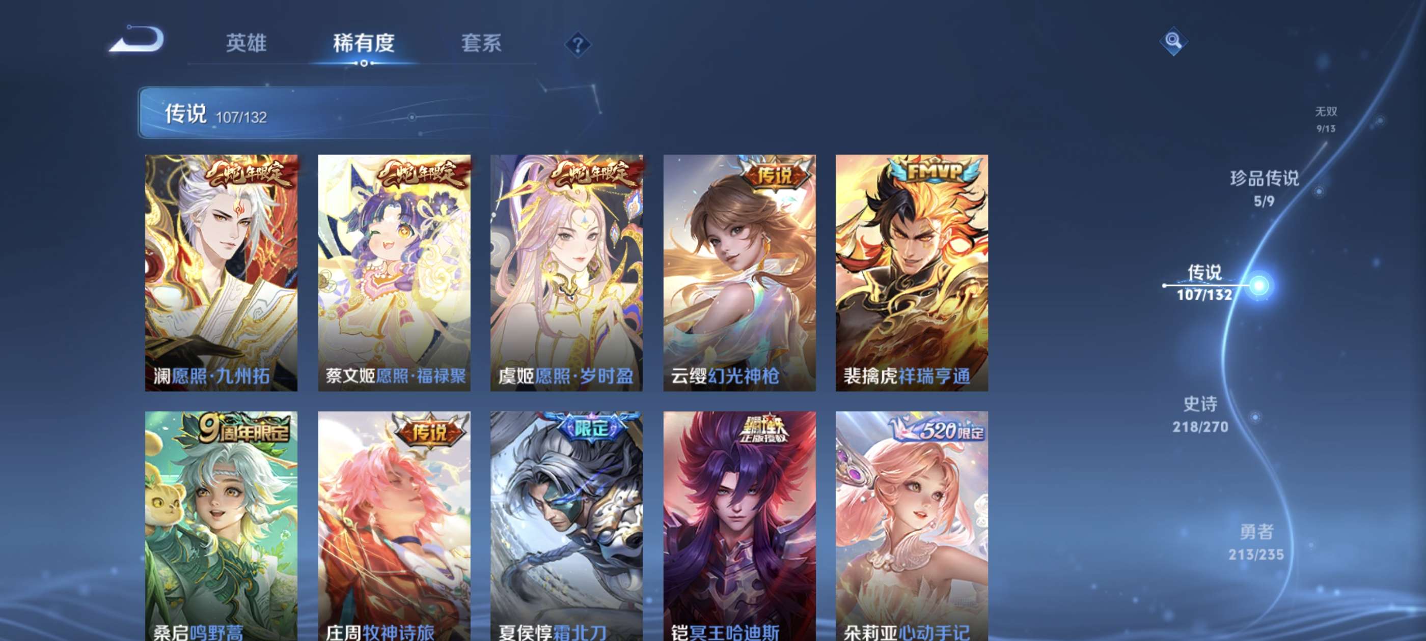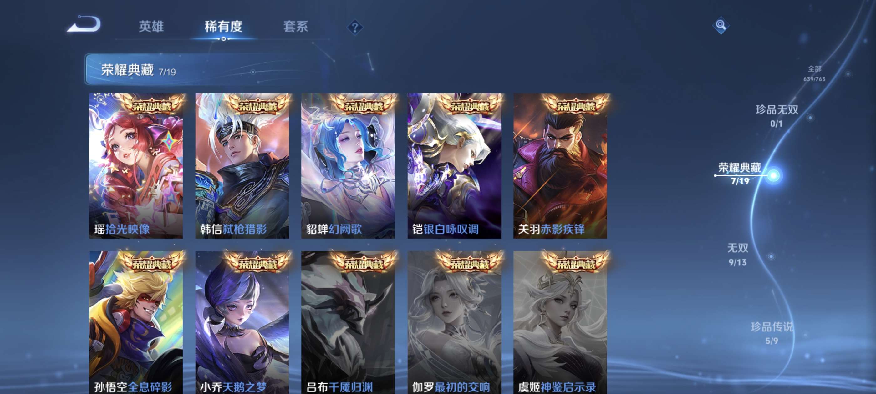 高质量贵族10!639皮肤!9无双!7荣耀典藏!5珍品传说!107传说!