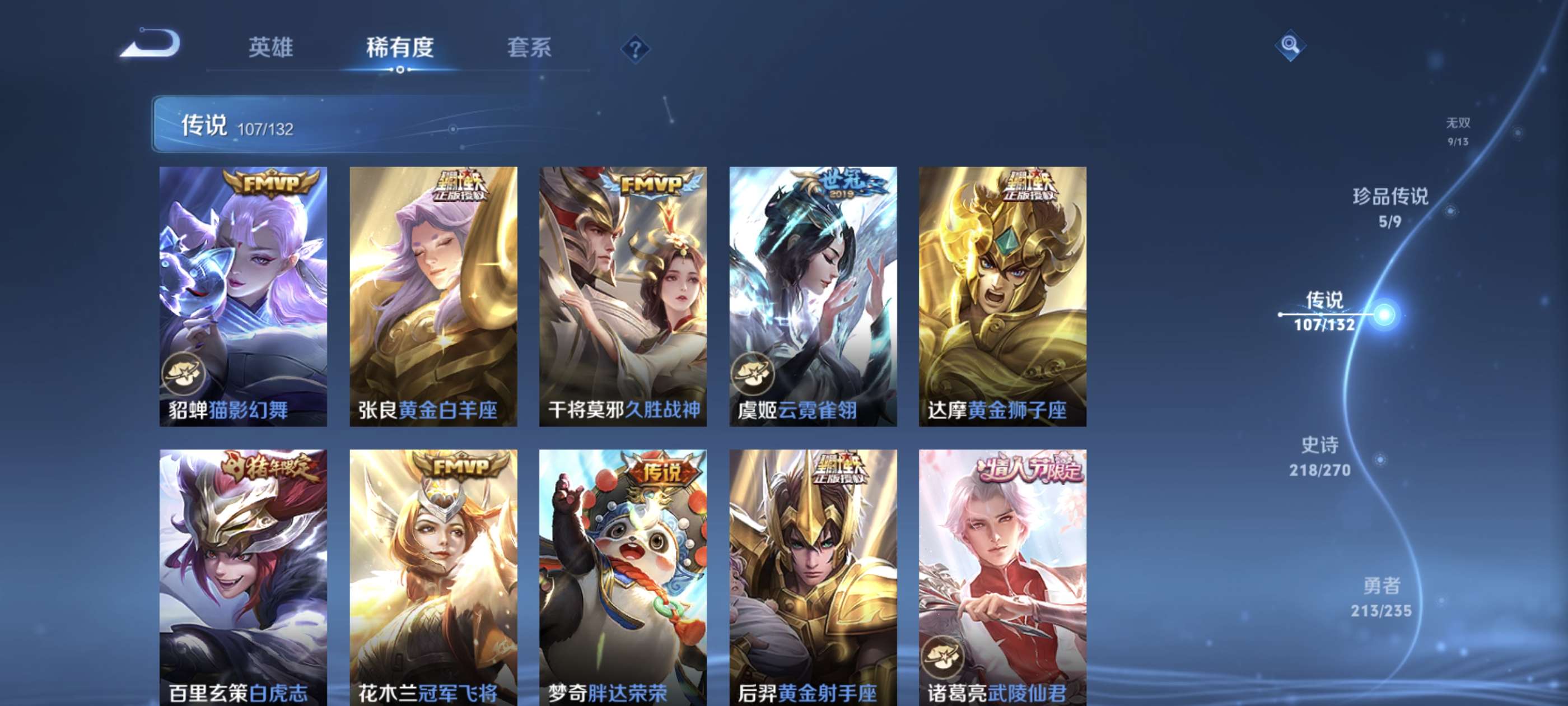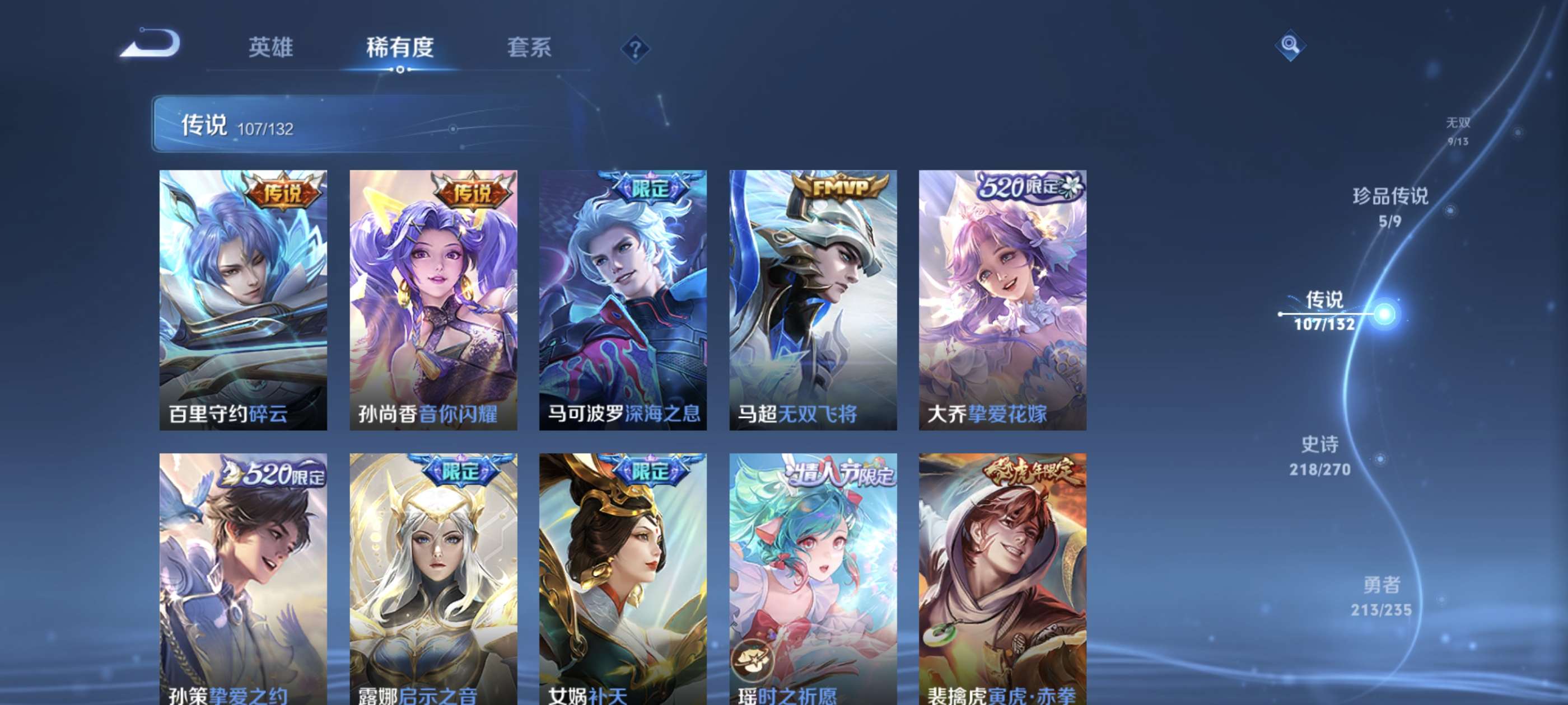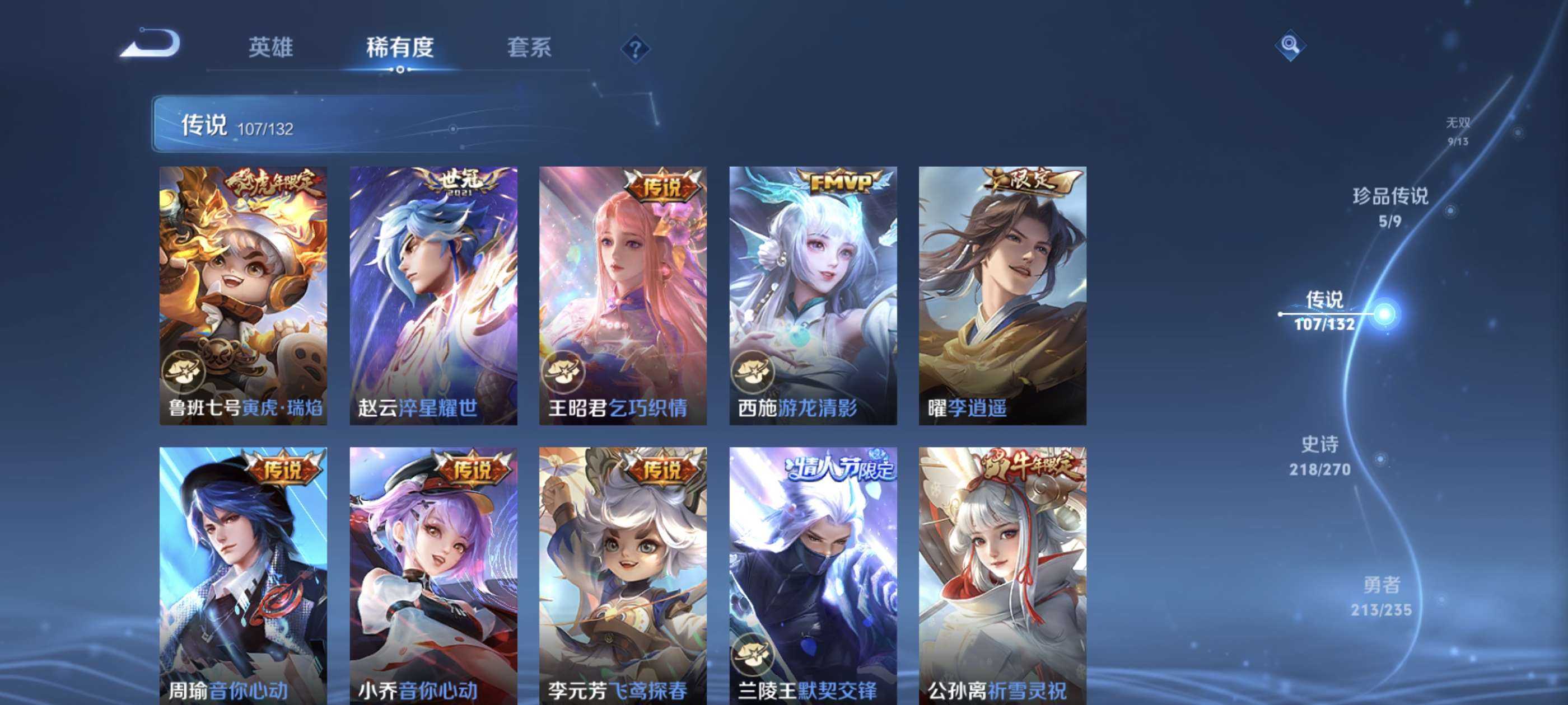 高质量贵族10!639皮肤!9无双!7荣耀典藏!5珍品传说!107传说!