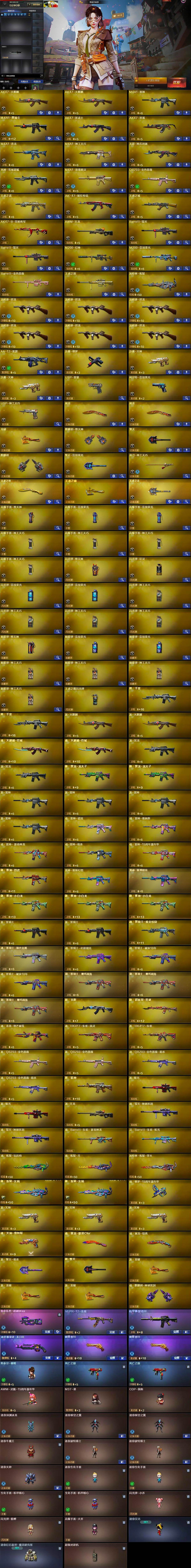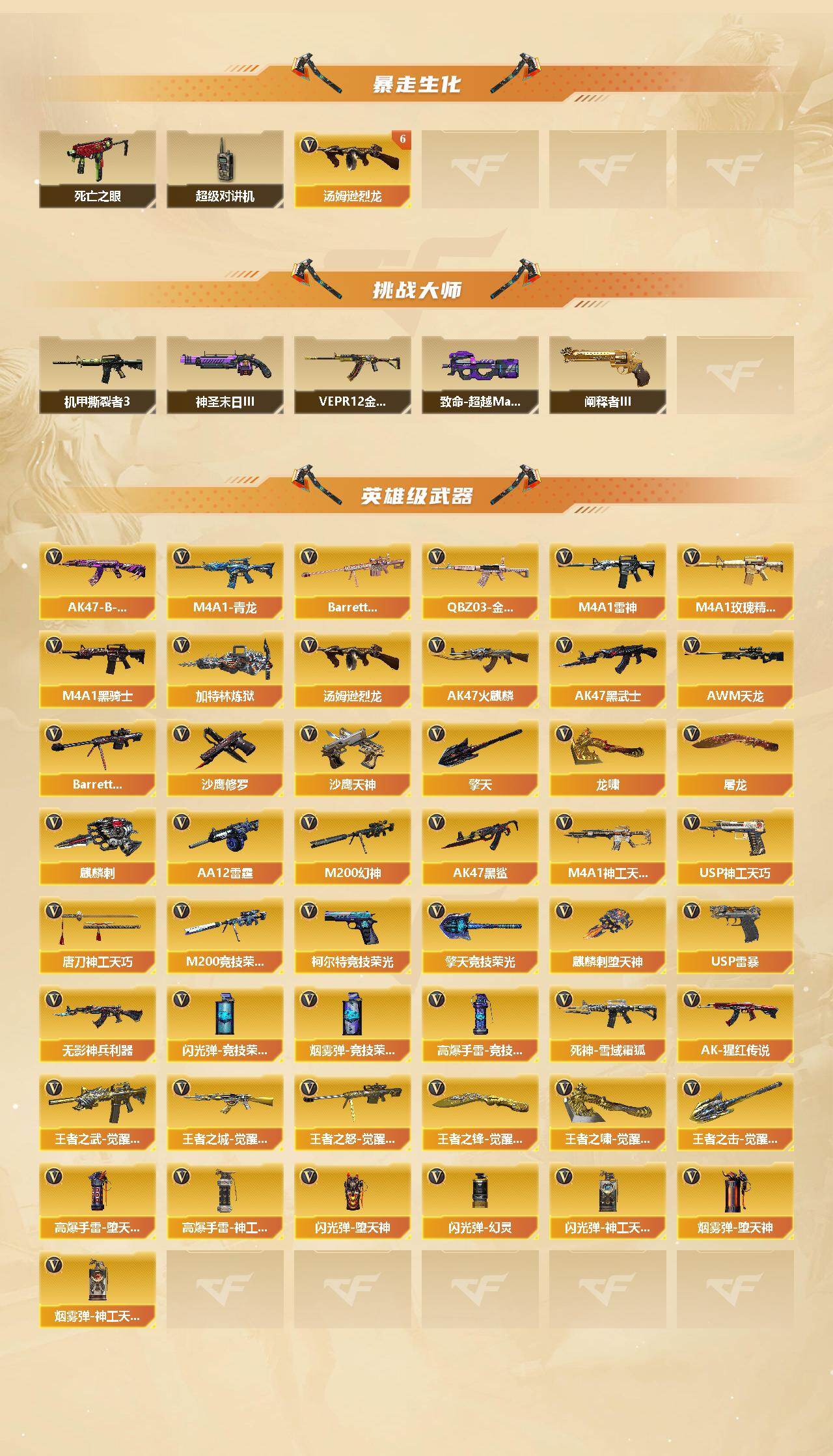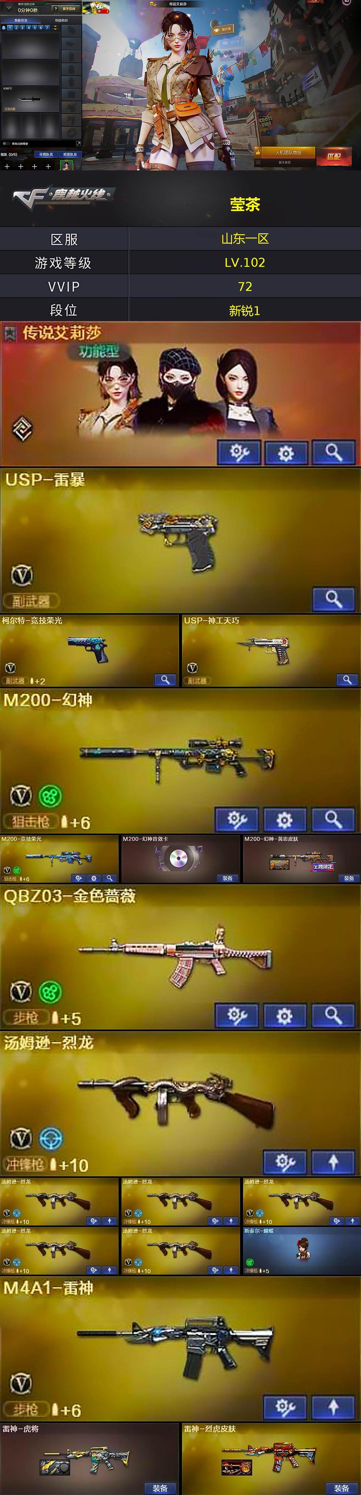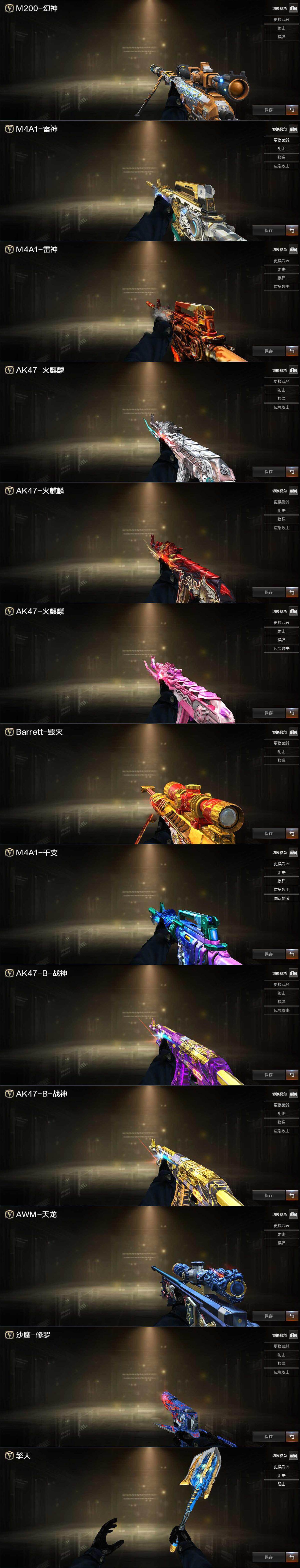 【热门武器】:QBZ03-金色蔷薇,M4A1-青龙,M200-幻神,M200-竞技荣光,死亡之眼*2,M4A1-黑骑士,汤姆逊-烈龙*6,加特林-炼狱,斯泰尔-蝴蝶,USP-雷暴,沙鹰-修罗,金刚伞
