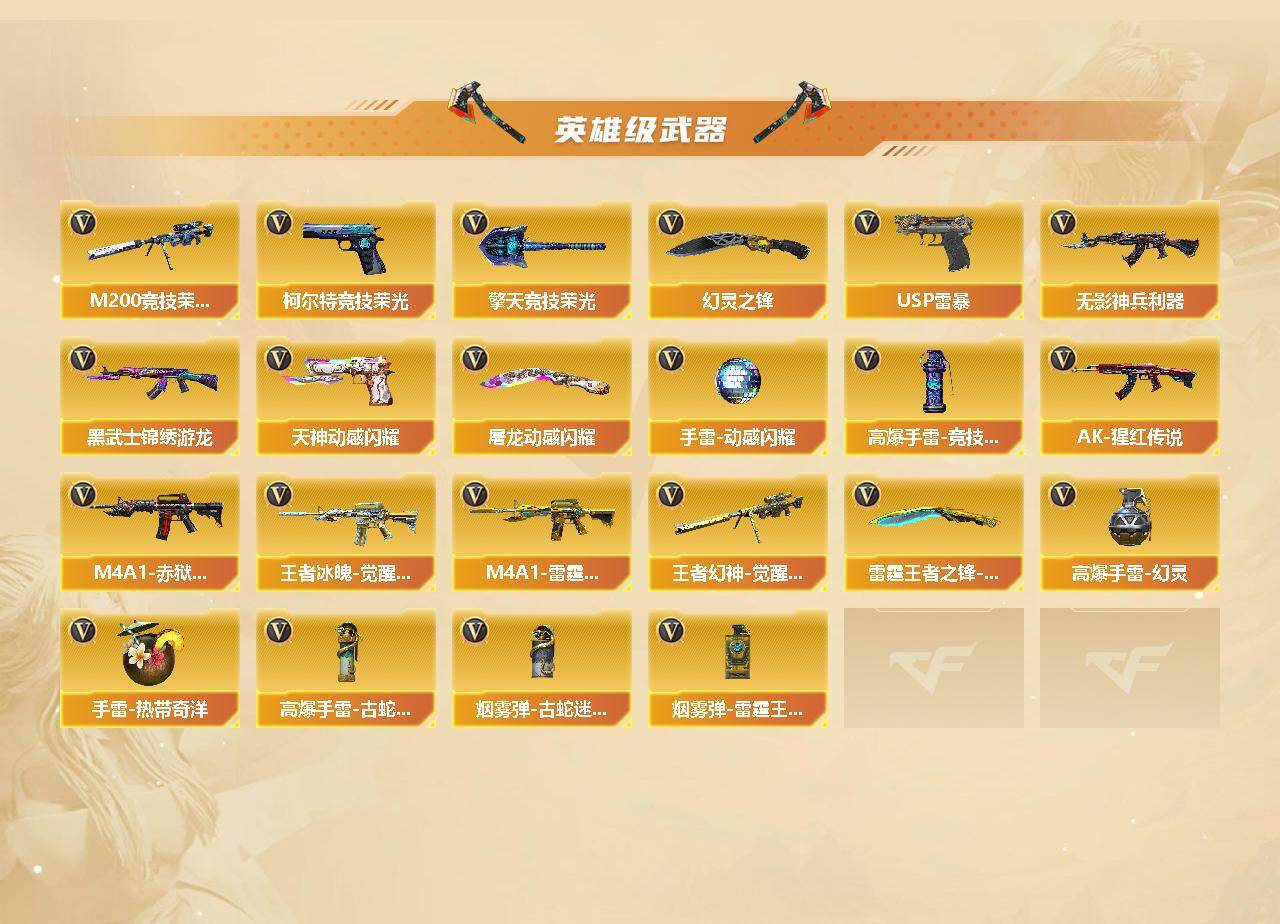 【热门武器】:传说圣灵,QBZ03-金色蔷薇,金色蔷薇-古蛇迷踪,修罗-古蛇迷踪,M200-竞技荣光,死亡之眼,汤姆逊-烈龙*6,斯泰尔-蝴蝶,USP-雷暴,沙鹰-修罗