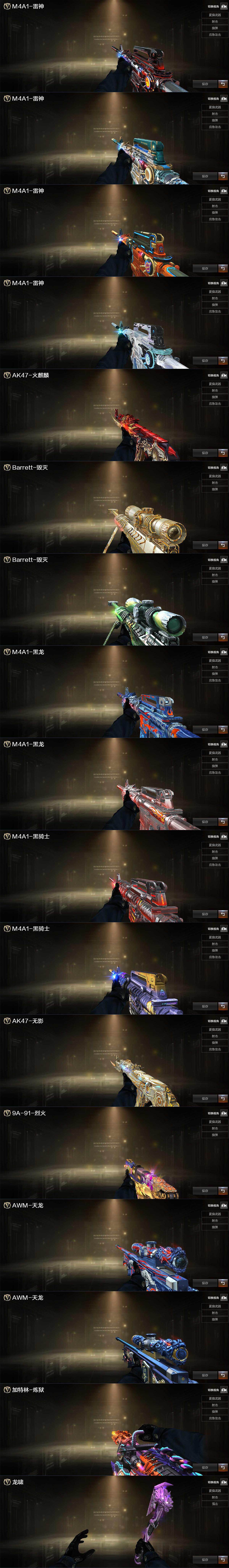 【热门武器】:QBZ03-金色蔷薇,M200-幻神,金色蔷薇-古蛇迷踪,修罗-古蛇迷踪,M4A1-黑骑士,汤姆逊-烈龙*6,加特林-炼狱,羊驼玩偶,沙鹰-修罗