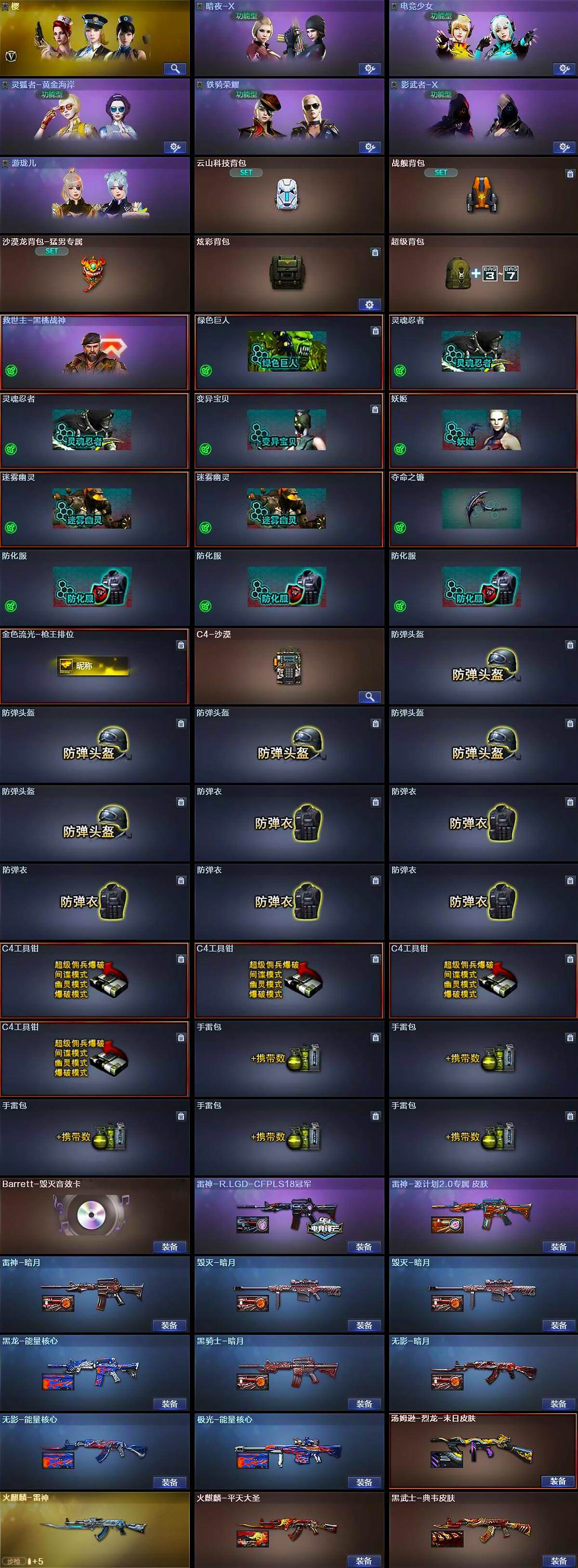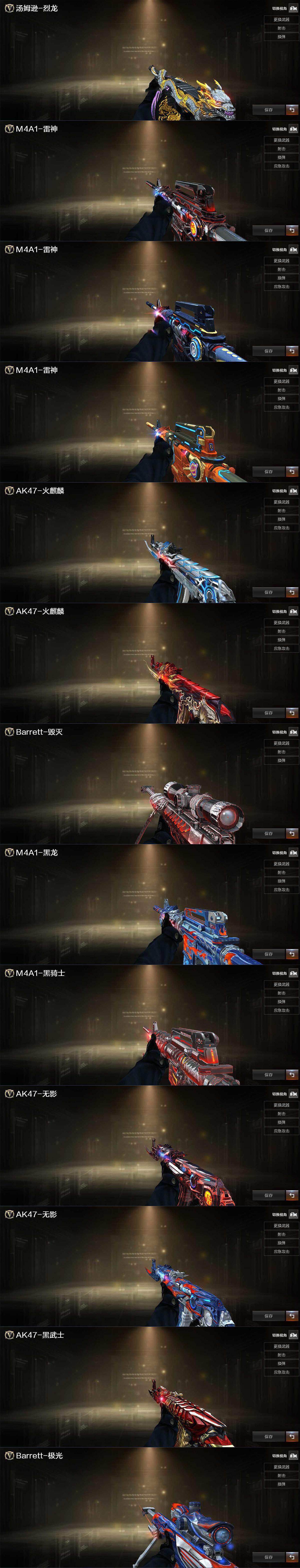 【热门武器】:QBZ03-金色蔷薇,M200-幻神,死亡之眼,M4A1-黑骑士,汤姆逊-烈龙*4,RPK-盘龙*3,加特林-炼狱*6,沙鹰-修罗*3