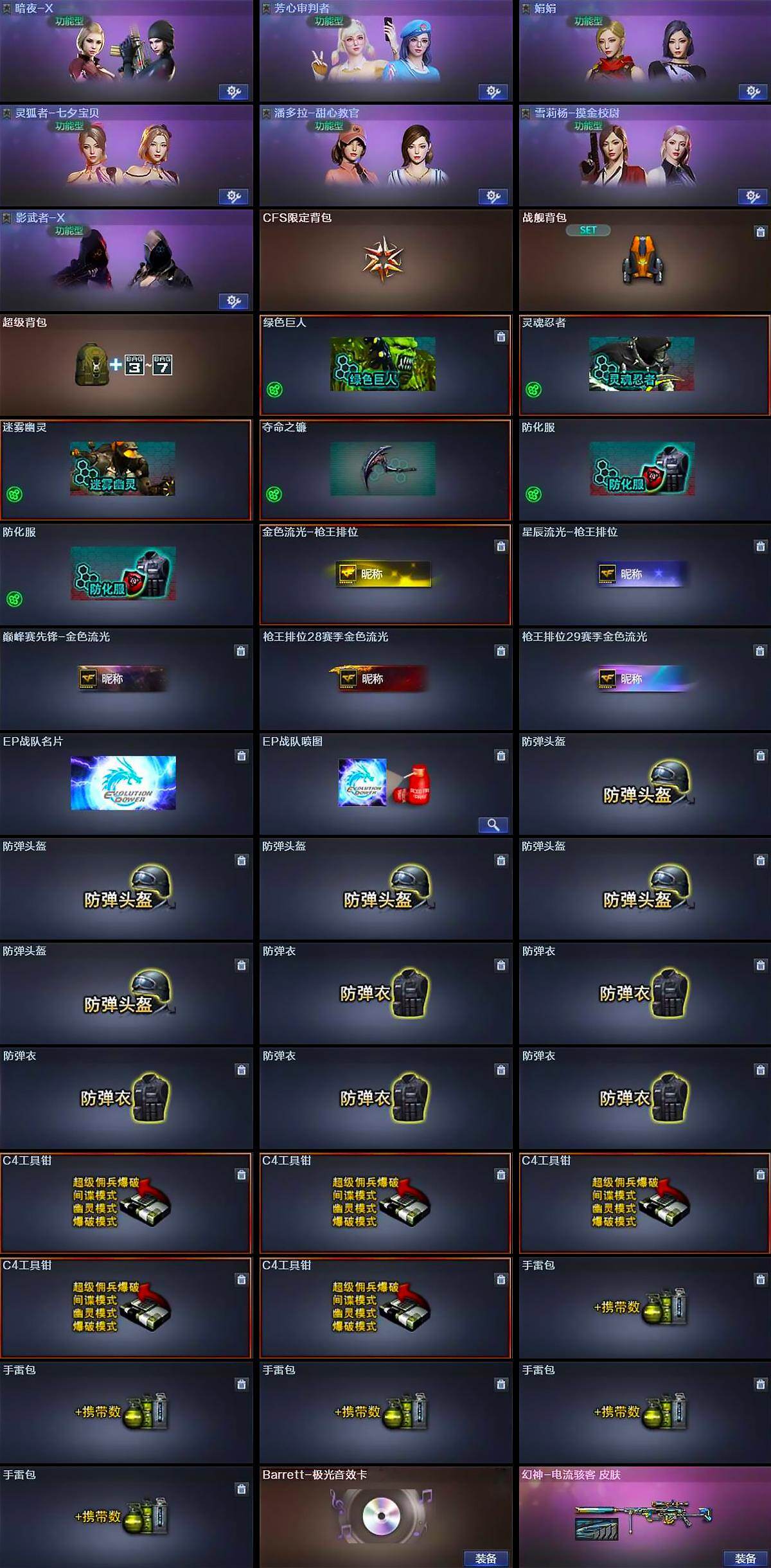 【道具】:CFS限定背包,战舰背包,超级背包,绿色巨人,灵魂忍者,迷雾幽灵,夺命之镰,防化服*2,金色流光-枪王排位,