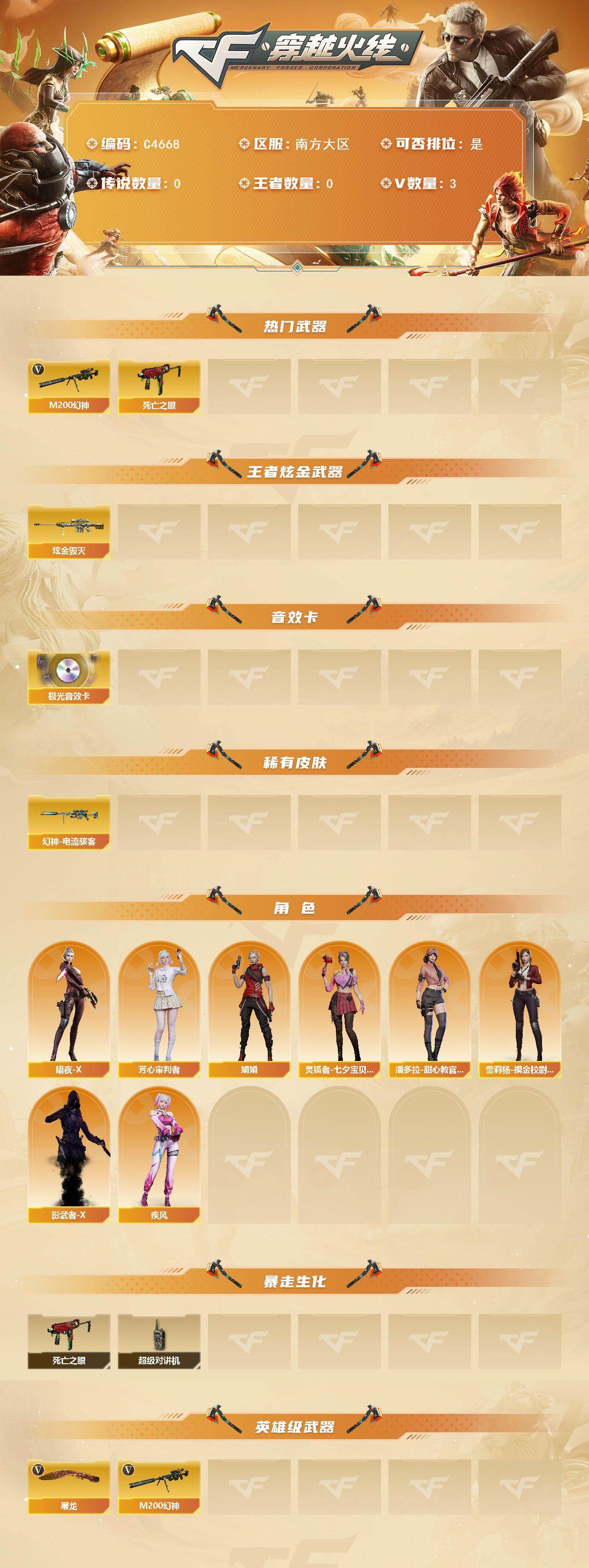 【C4668】南方大区-3V-0王者武器数-1炫金武器数