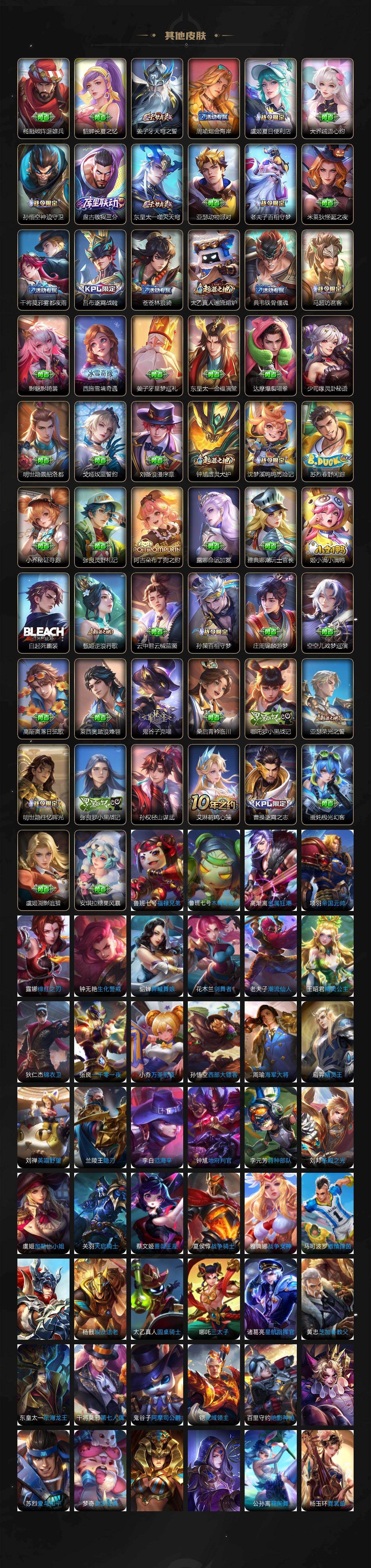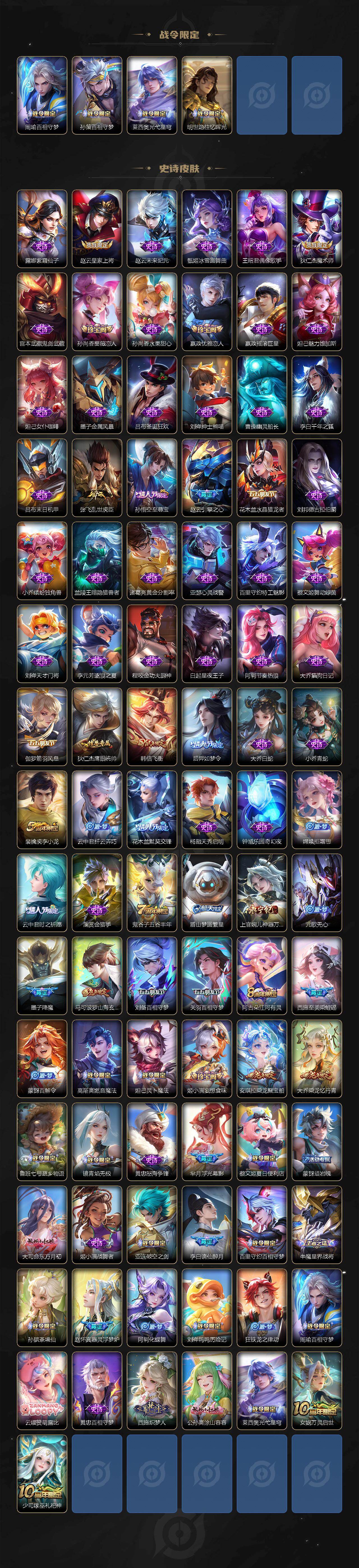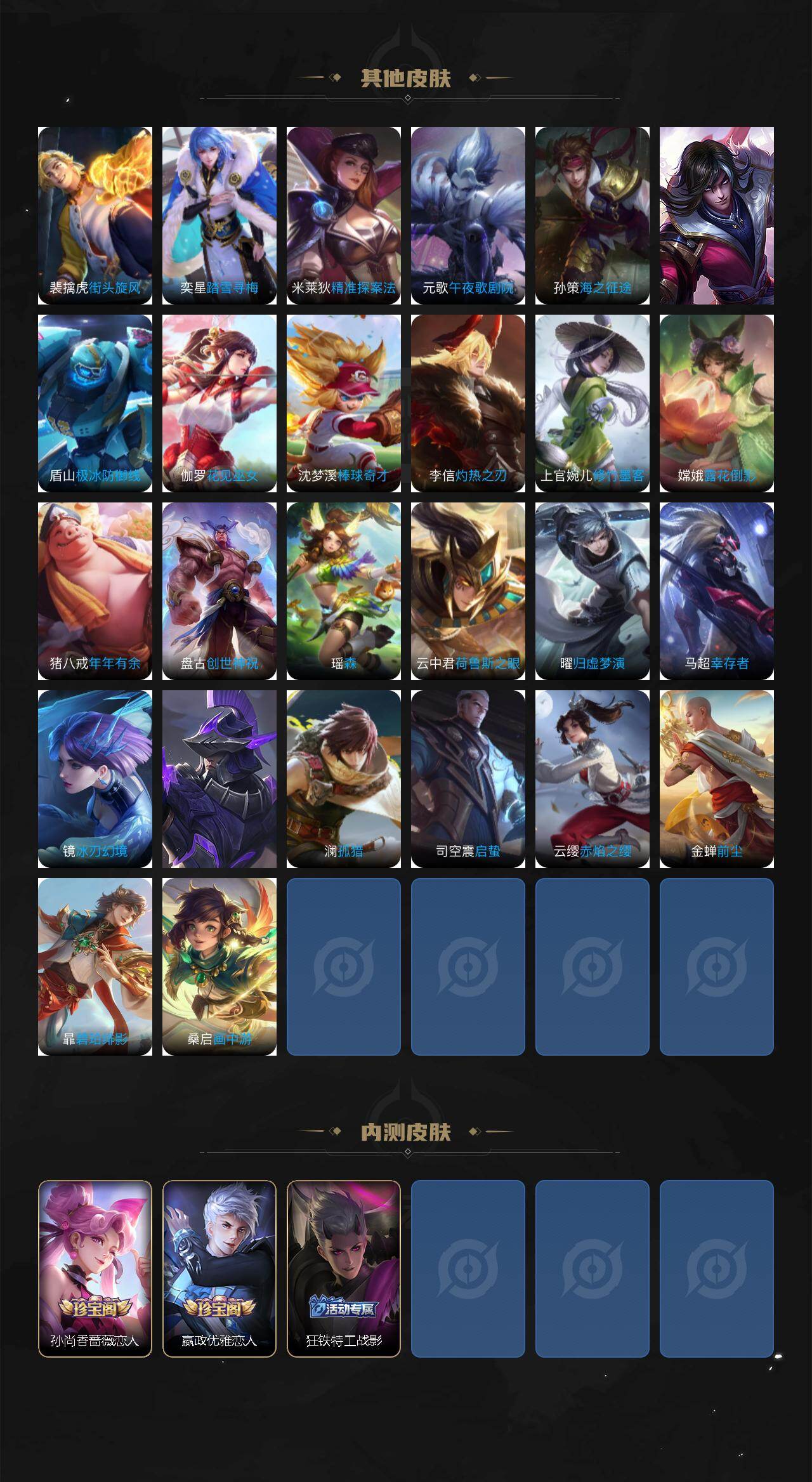 【传说皮肤】:后羿神树通天,司马懿九山相柳,妲己愿照众生和,澜愿照九州拓,云缨幻光神枪,桑启鸣野蒿,亚连落雪白狼,孙尚香乘龙
