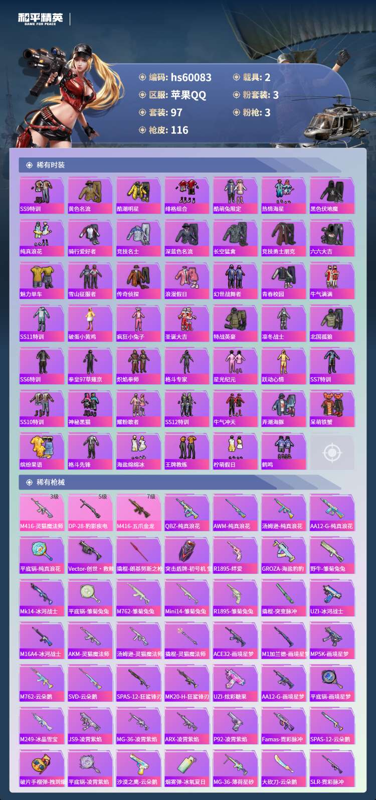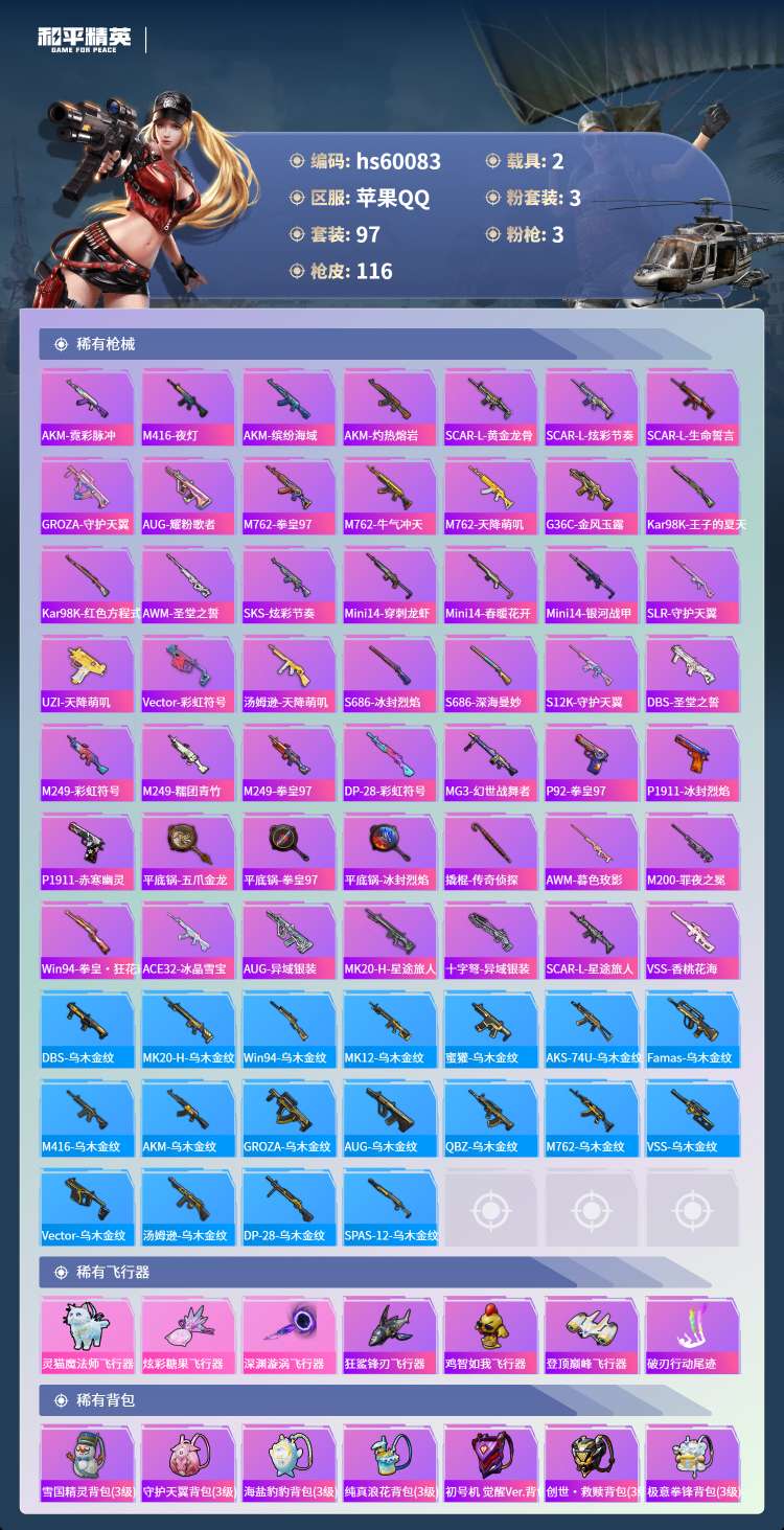 hs60083 苹果手Q-7王牌印记-1红装-3粉装-3特效枪-2载具-42603热力值-97套装-