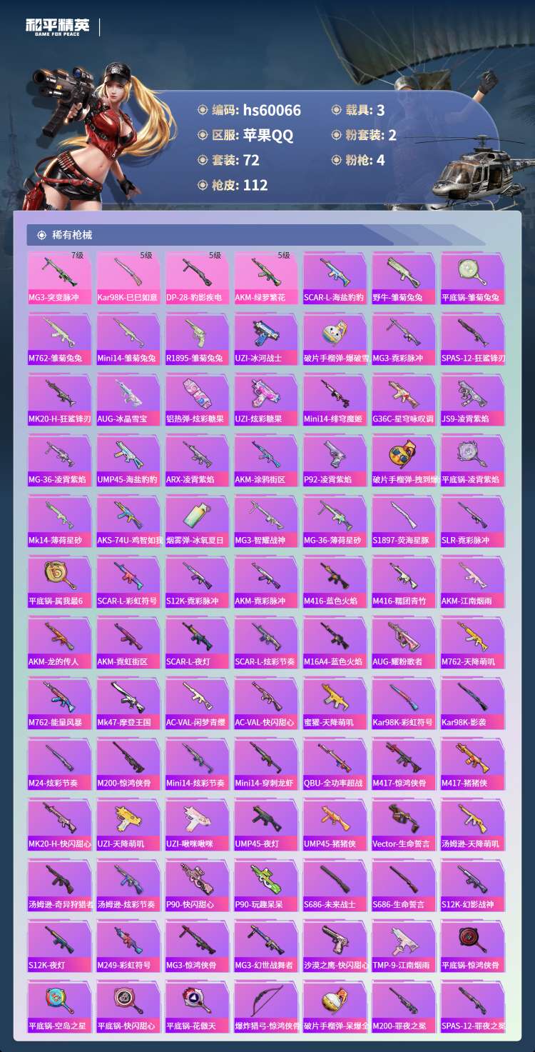 hs60066 苹果手Q-7王牌印记-2粉装-4特效枪-3载具-34595热力值-72套装-112枪
