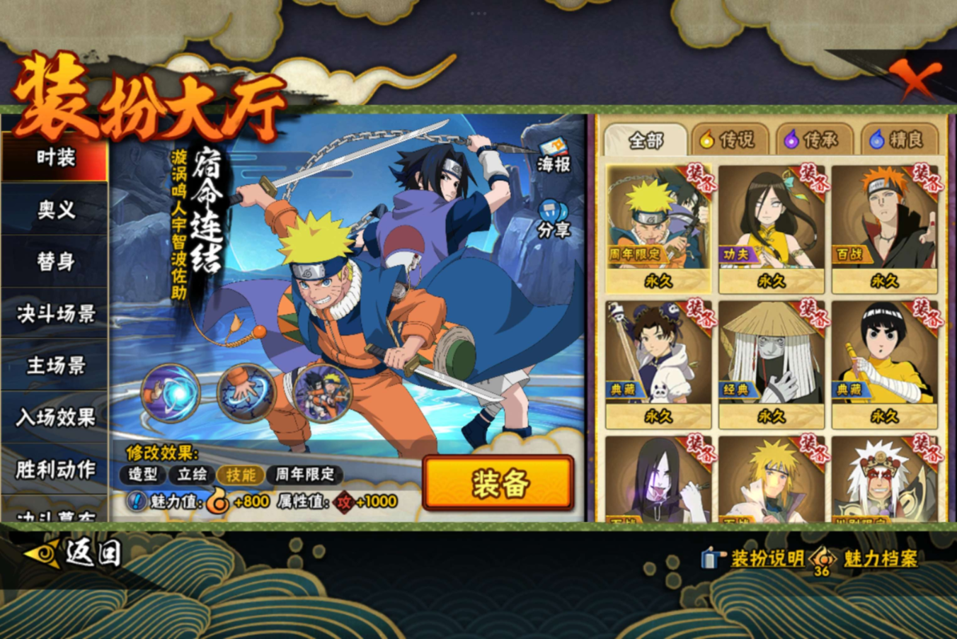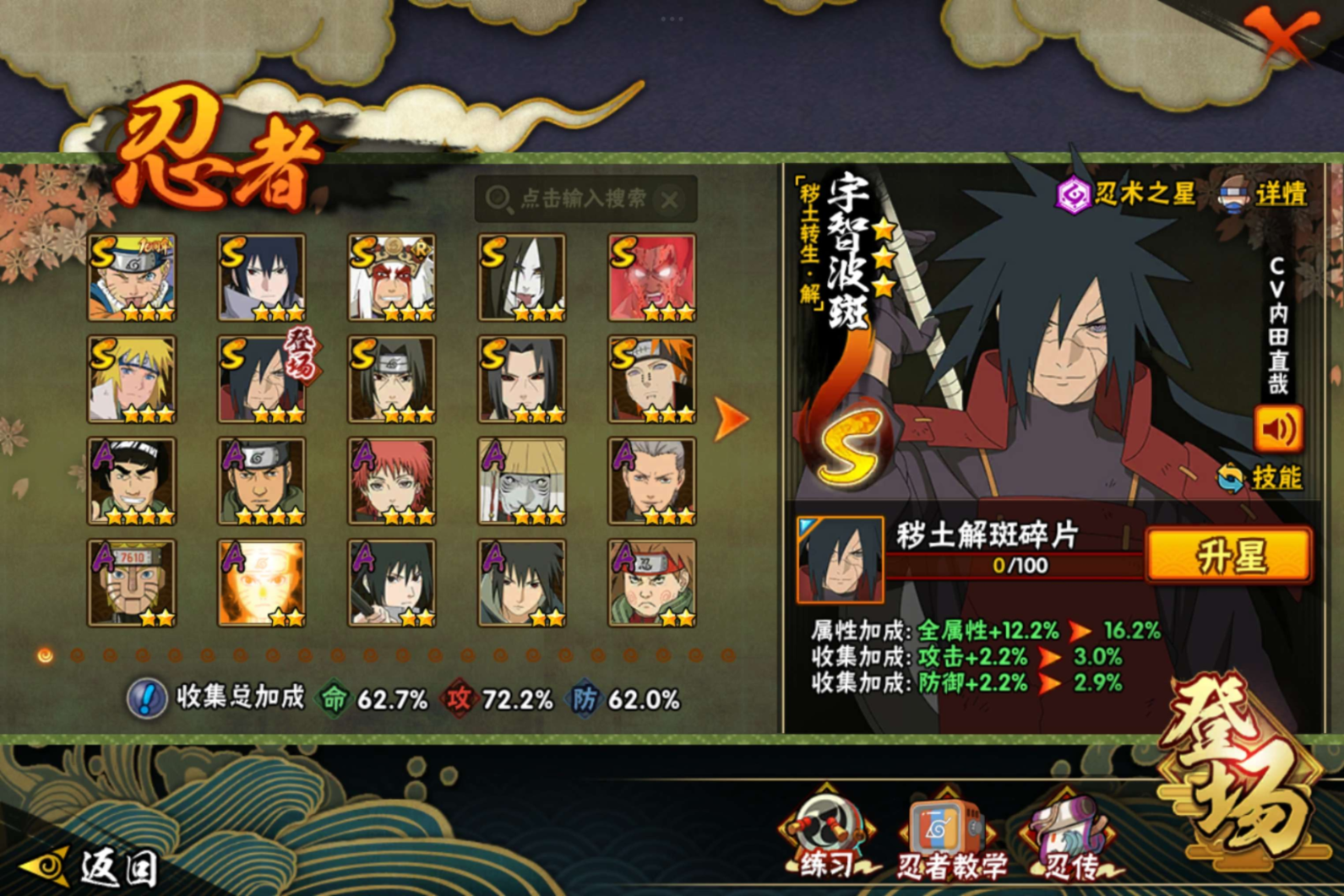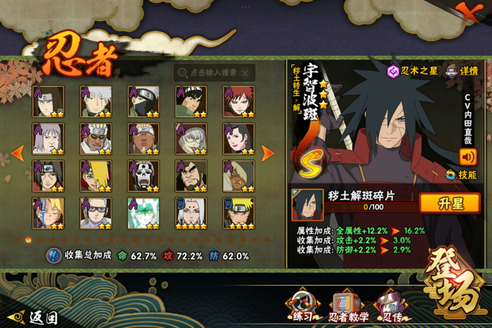 【S级忍者】迈特凯「死门」(3星),宇智波斑「秽土转生·解」(3星),宇智波佐助「永恒万花筒」(3星),自来也「舞之豪杰」(3星),宇智波鼬「秽土转生」(3星),宇智波鼬「须佐能乎」(3星),漩涡鸣人·宇智波佐助(3星),佩恩「天道」(3星),波风水门(3星),大蛇丸(3星),