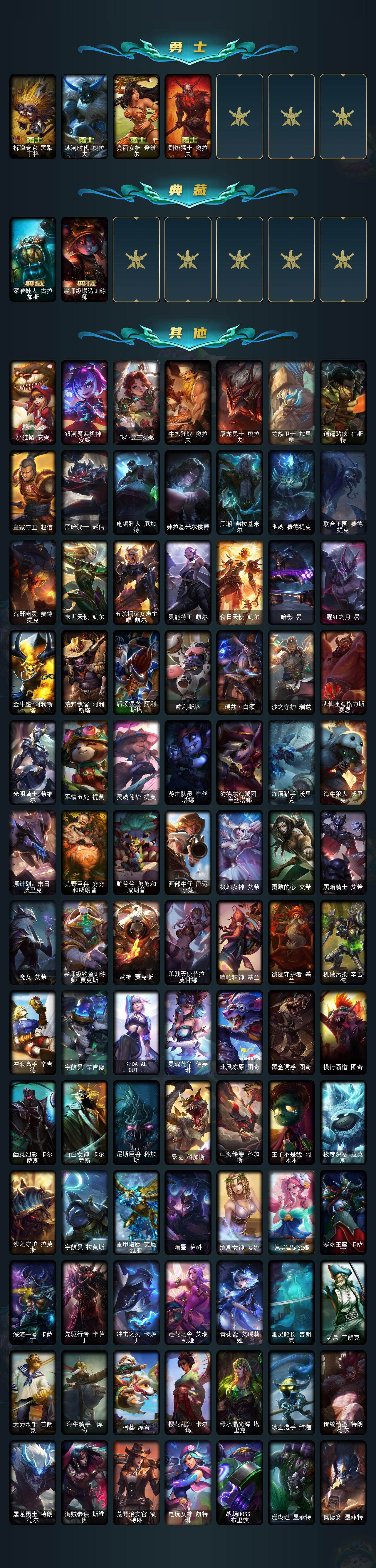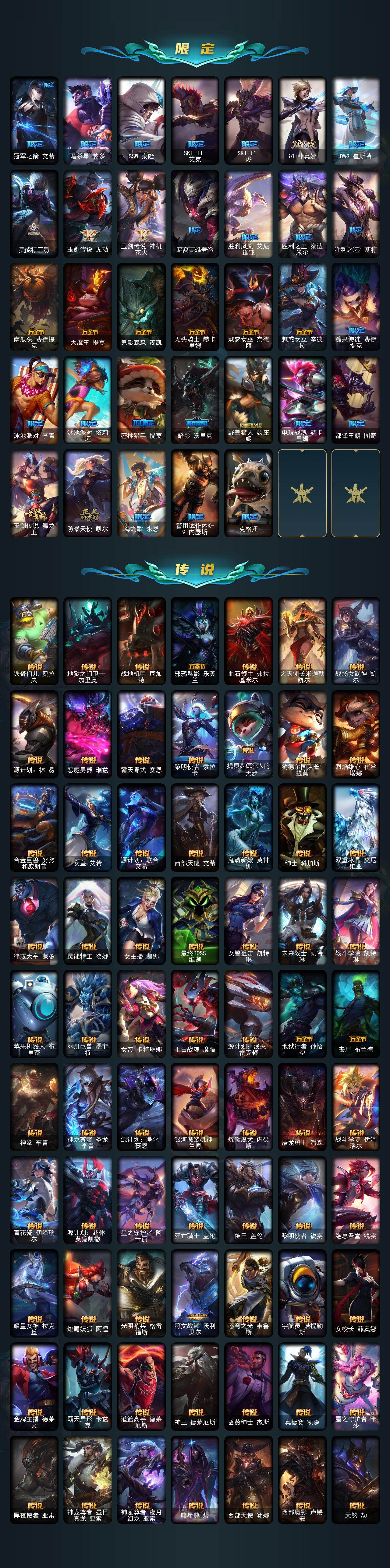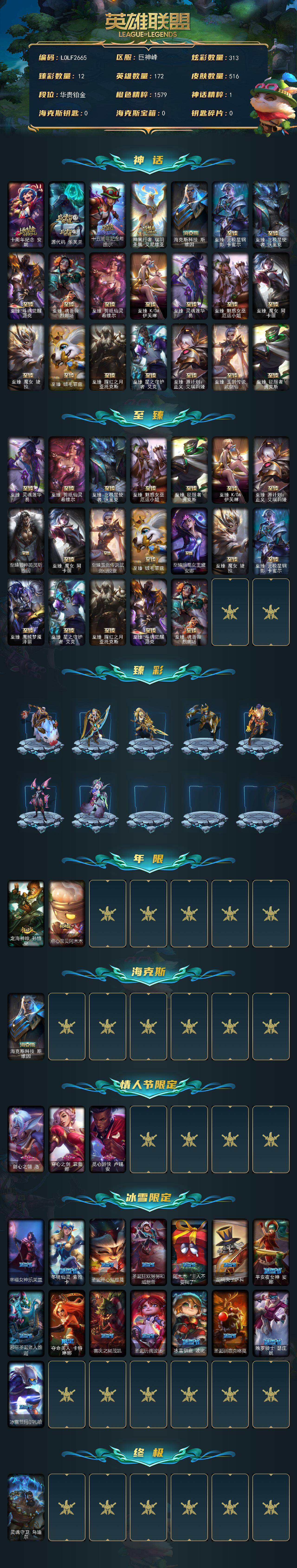 172英雄/516皮肤/1终极/24神话/55限定/12臻彩/313炫彩/78传说/78史诗