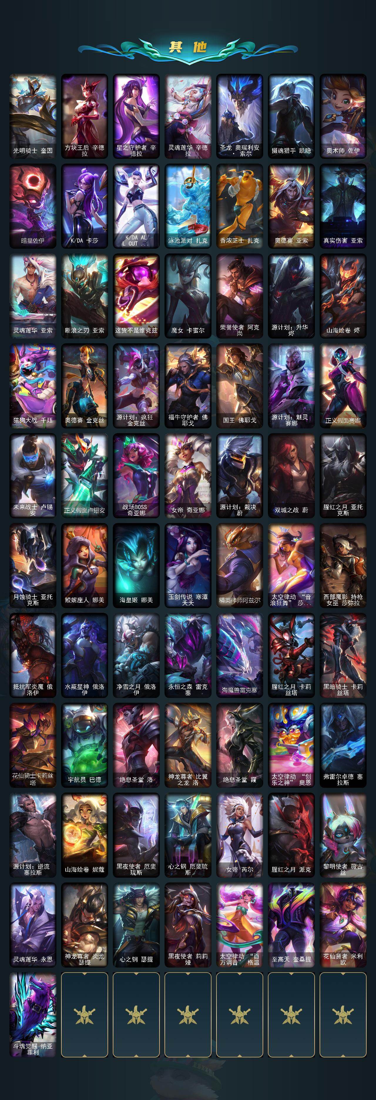【LOLF2665】172英雄/516皮肤/1终极/24神话/55限定/12臻彩/313炫彩/78传说/78史诗/铂金/十周年纪念安妮/源代码乐芙兰/十五周年纪念希维尔/神凰行者瑞羽圣凰艾尼维亚/海克斯科技斯维因/至臻征服者贾克斯/至臻北极星钢影卡蜜尔/至臻北极星使者沃里克/至臻斗魂觉醒派克/至臻魂蔷薇烈娜塔/至臻剪纸仙灵希维尔/至臻KDA伊芙琳/至臻灵魂莲华易/至臻魅惑女巫厄运小姐/至臻魔女阿卡丽/至臻魔女婕拉/至臻绒毛菲兹/至臻腥红之月亚托克斯/至臻星之守护者艾克/至臻源计划正义艾瑞莉娅/至