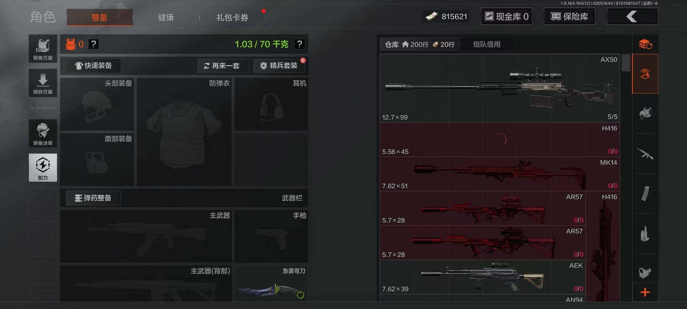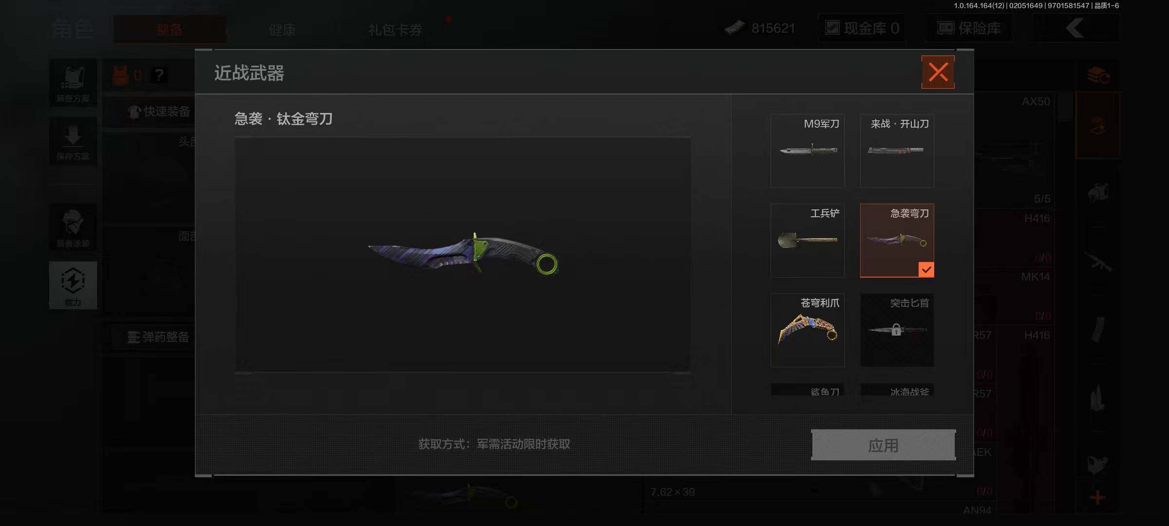 仓库价值(百万):8/柯恩币:815621/来战开山刀/工兵铲/急袭弯刀/苍穹利爪/告丧夜曲AUG/告丧夜曲AR57
