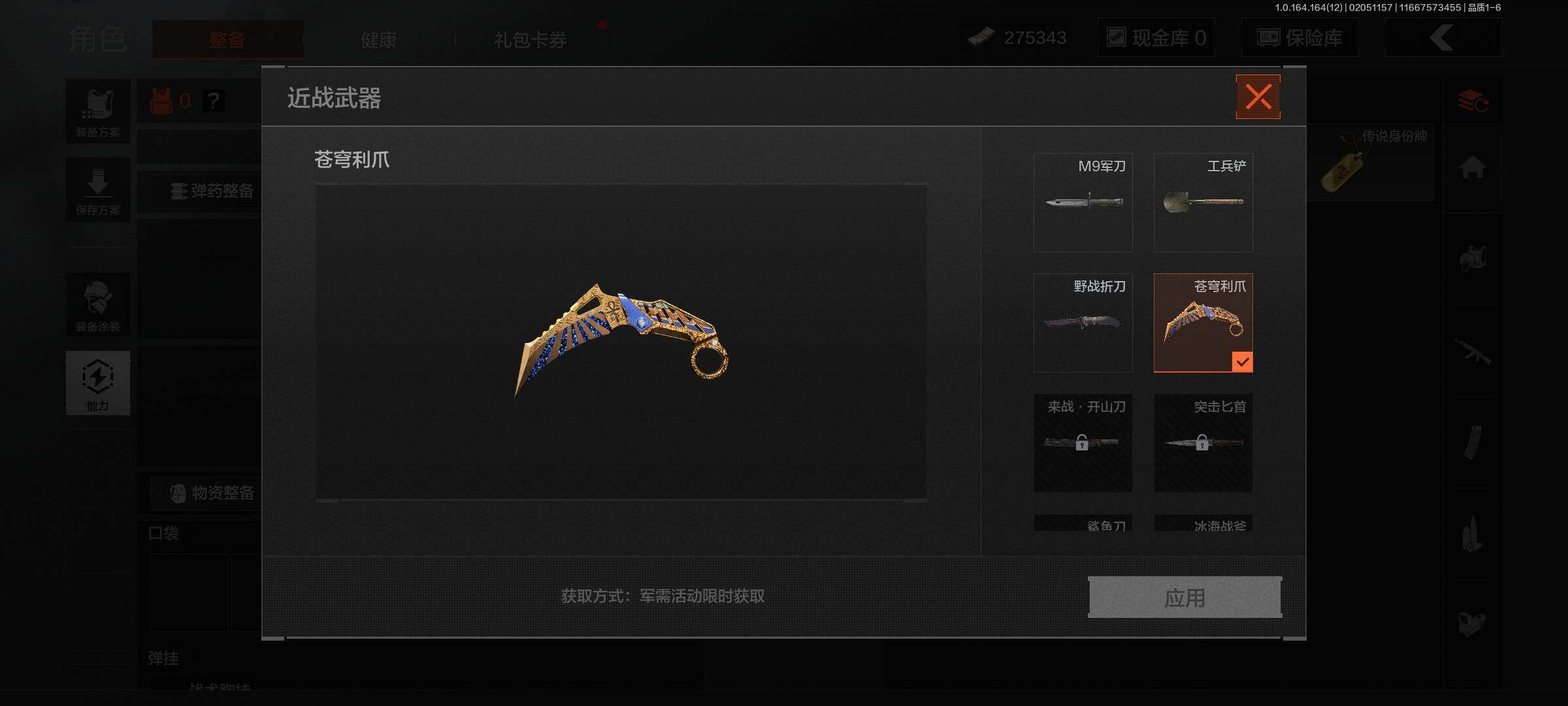 仓库价值(百万):0.2/柯恩币:4.9/苍穹利爪/工兵铲/野战折刀/告丧夜曲AUG/告丧夜曲AR57