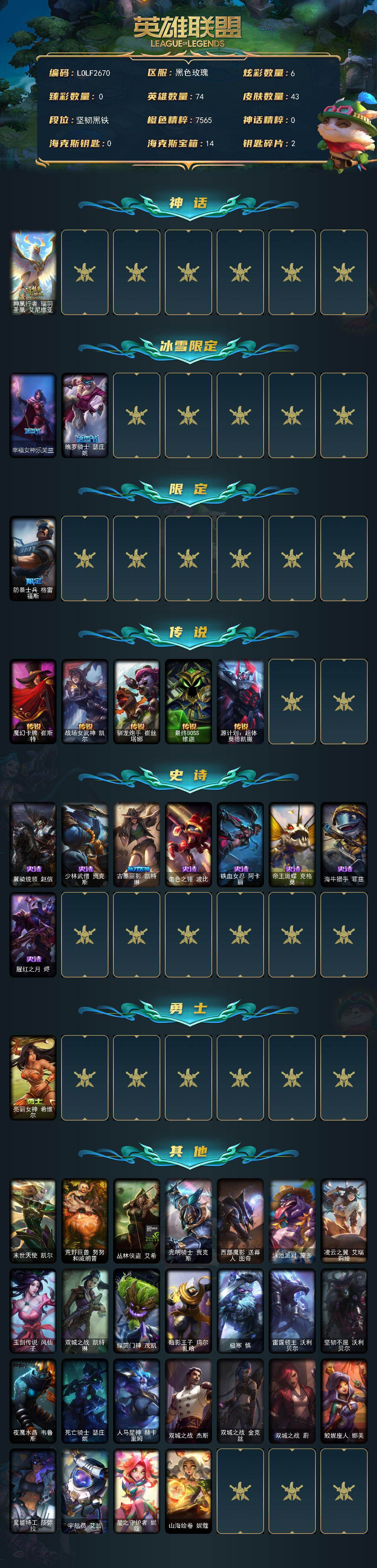 【LOLF2670】74英雄/43皮肤/1神话/3限定/6炫彩/5传说/8史诗/未定级/神凰行者瑞羽圣凰艾尼维亚/幸福女神乐芙兰/魄罗骑士瑟庄妮/防暴士兵格雷福斯/魔幻卡牌崔斯特/战场女武神凯尔/驯龙炮手崔丝塔娜/最终BOSS维迦/源计划超体莫德凯撒/翼骑统领赵信/少林武僧贾克斯/古墓丽影凯特琳/血色之锤波比/铁血女忍阿卡丽/帝王斑蝶克格莫/海牛猎手菲兹/腥红之月烬/亮丽女神希维尔/末世天使凯尔/荒野巨兽努努和威朗普/丛林侠盗艾希/光明骑士贾克斯/西部魔影送葬人图奇/泳池派对蒙多/凌云之翼艾瑞莉