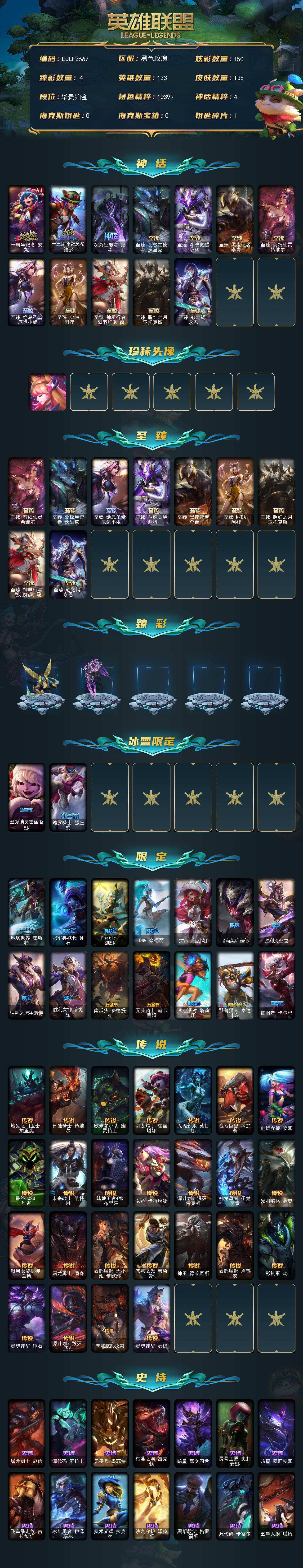 【LOLF2667】133英雄/135皮肤/12神话/17限定/4臻彩/150炫彩/25传说/16史诗/铂金账号等级:348/十周年纪念安妮/十五周年纪念希维尔/灰烬征服者潘森/至臻北极星使者沃里克/至臻斗魂觉醒萨科/至臻黑夜使者李青/至臻剪纸仙灵希维尔/至臻绝息圣堂厄运小姐/至臻KDA阿狸/至臻神凰行者烈羽焰凰霞/至臻腥红之月亚托克斯/至臻心之钢永恩/星守阿狸头像/冠军掠夺者卡兹克凯旋圣装/冠军之刃锐雯2016凯旋圣装/天煞劫恒星游历者/魔女阿卡丽虚荣/圣诞精灵崔丝塔娜/魄罗骑士瑟庄妮/地底世