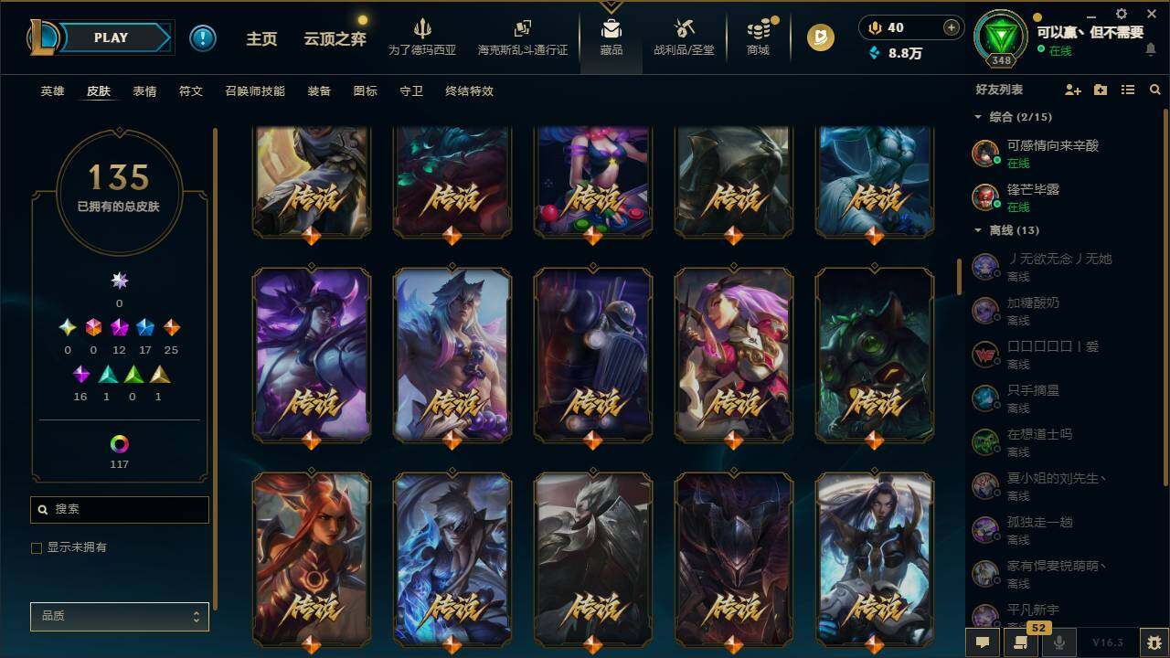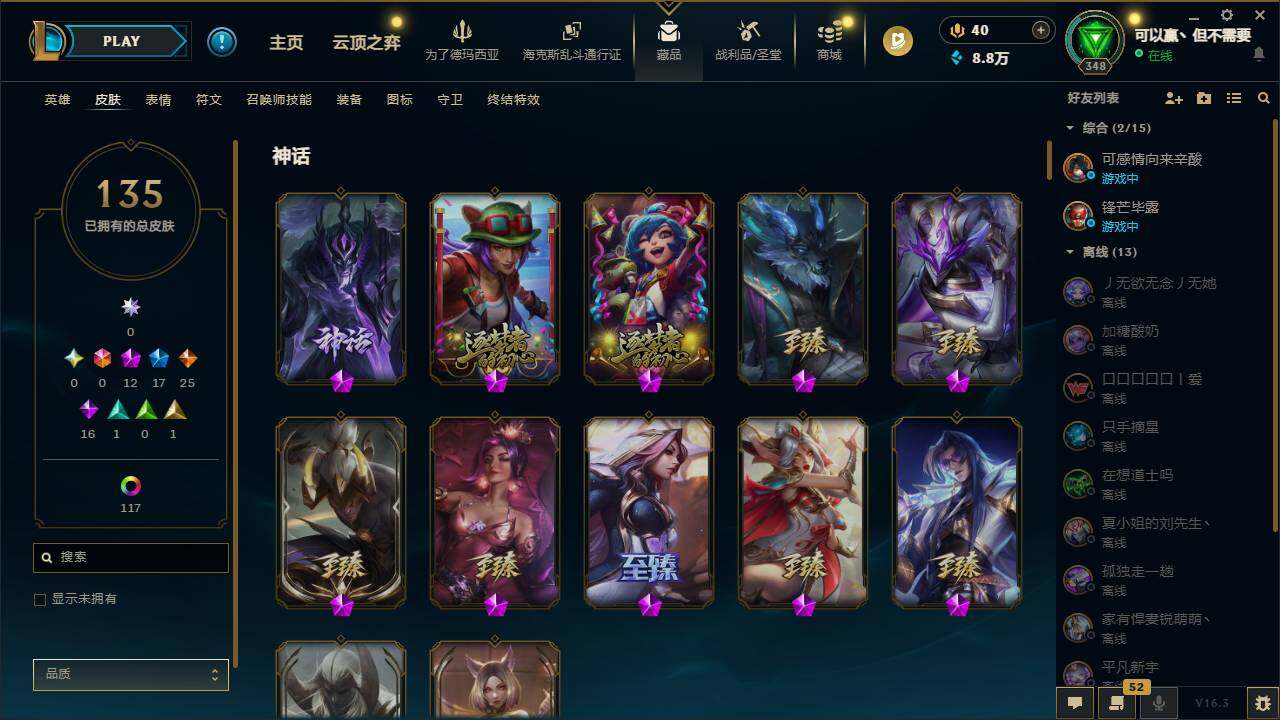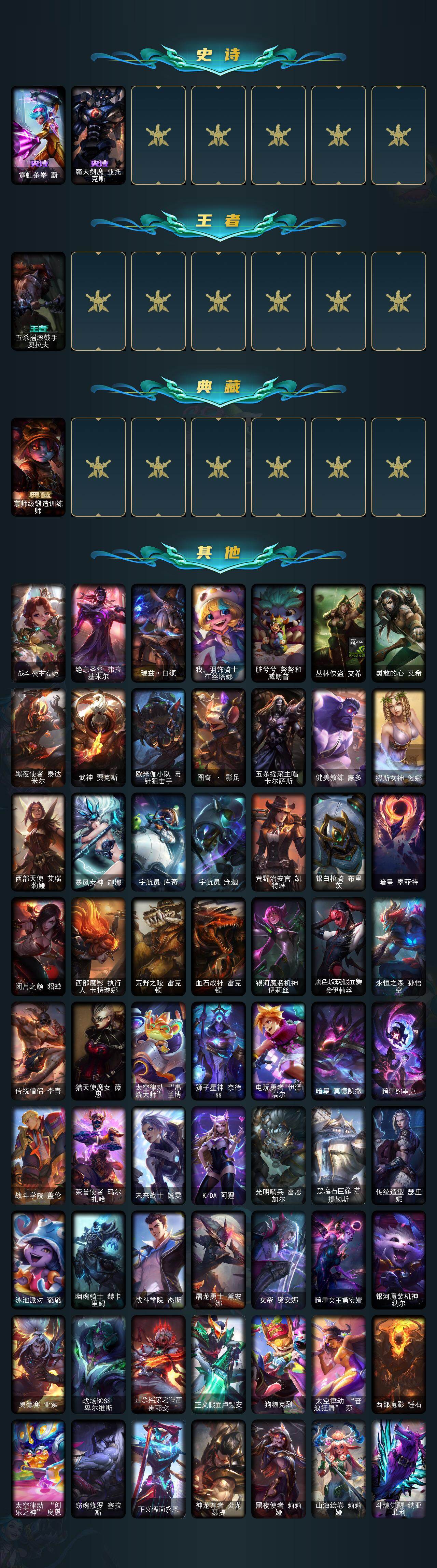 133英雄/135皮肤/12神话/17限定/4臻彩/150炫彩/25传说/16史诗
