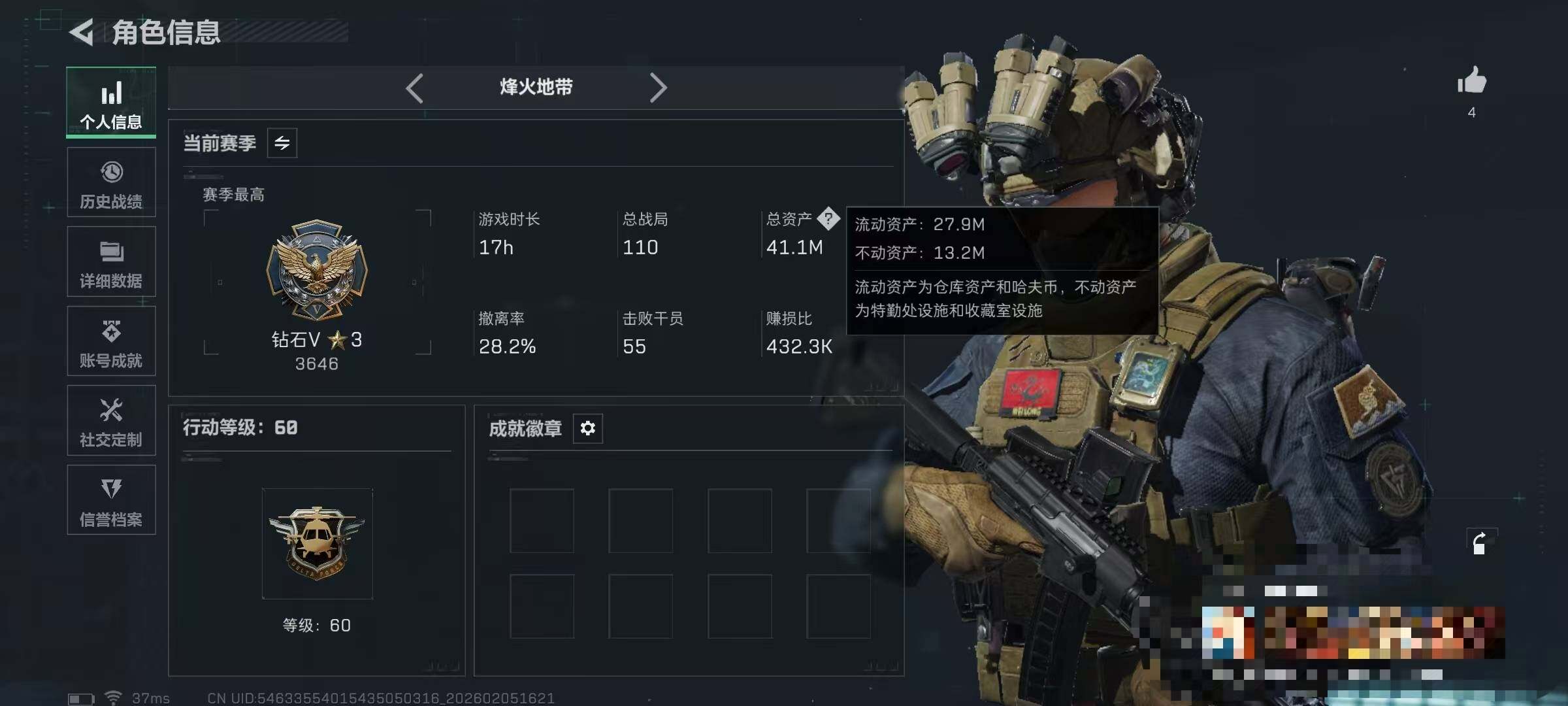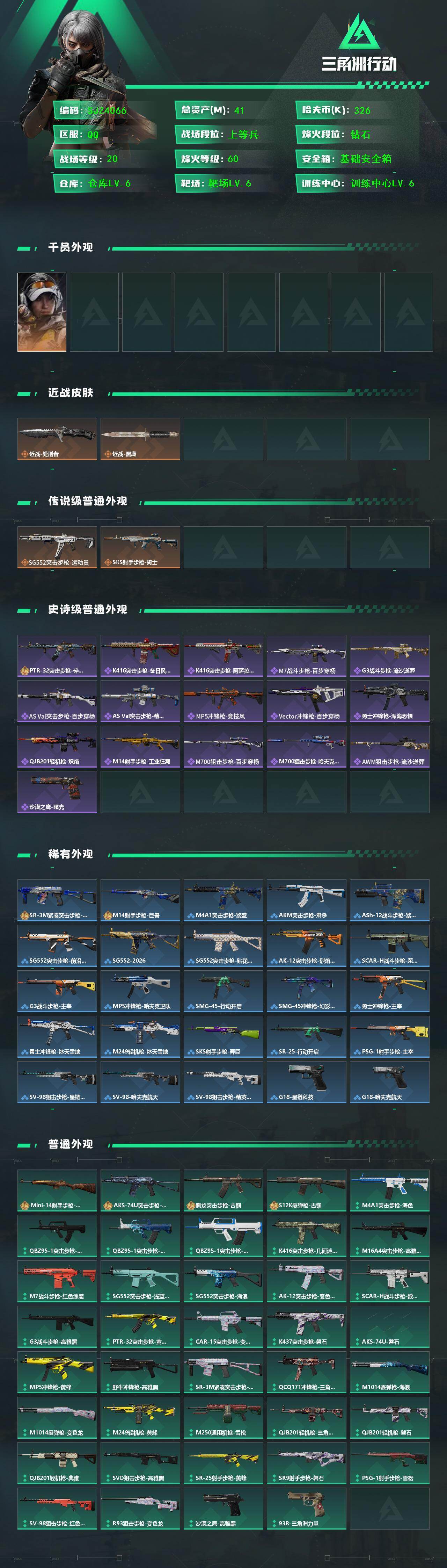 【SJZ4066】总资产(M):41M/哈夫币(K):326K/哈夫币(K):326K/传说枪皮数:2/全面战场等级:20_段位:上等兵/烽火地带等级:60_段位:钻石/非洲之心/露娜-金牌射手/近战-处刑者/近战-黑鹰/SG552突击步枪-运动员/SKS射手步枪-骑士/PTR-32突击步枪-碎冰行动/K416突击步枪-冬日风情/K416突击步枪-阿萨拉特攻/M7战斗步枪-百步穿杨/G3战斗步枪-流沙送葬/AS Val突击步枪-百步穿杨/AS Val突击步枪-精密维护/MP5冲锋枪-竞技风/Ve