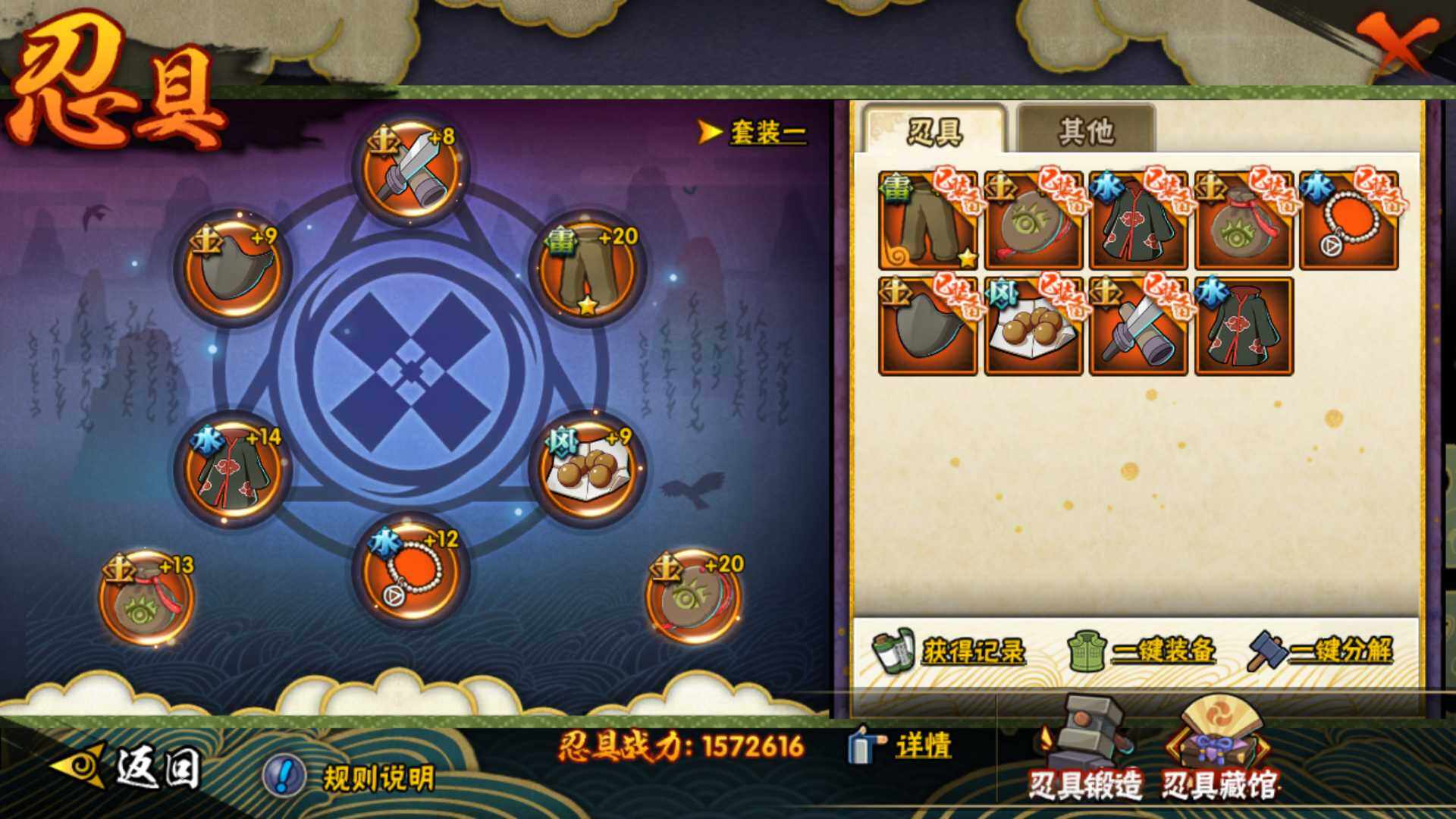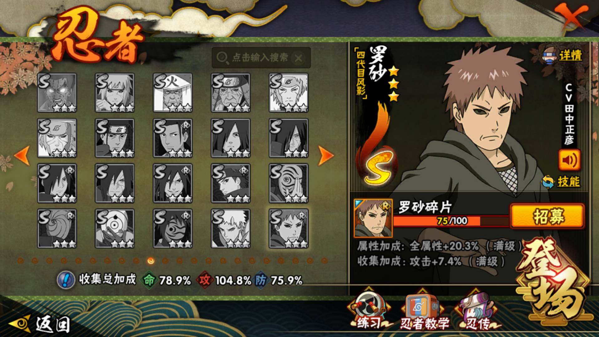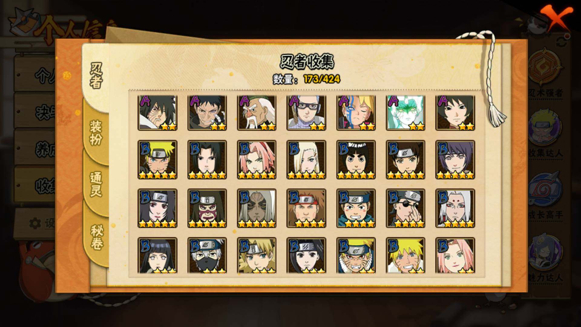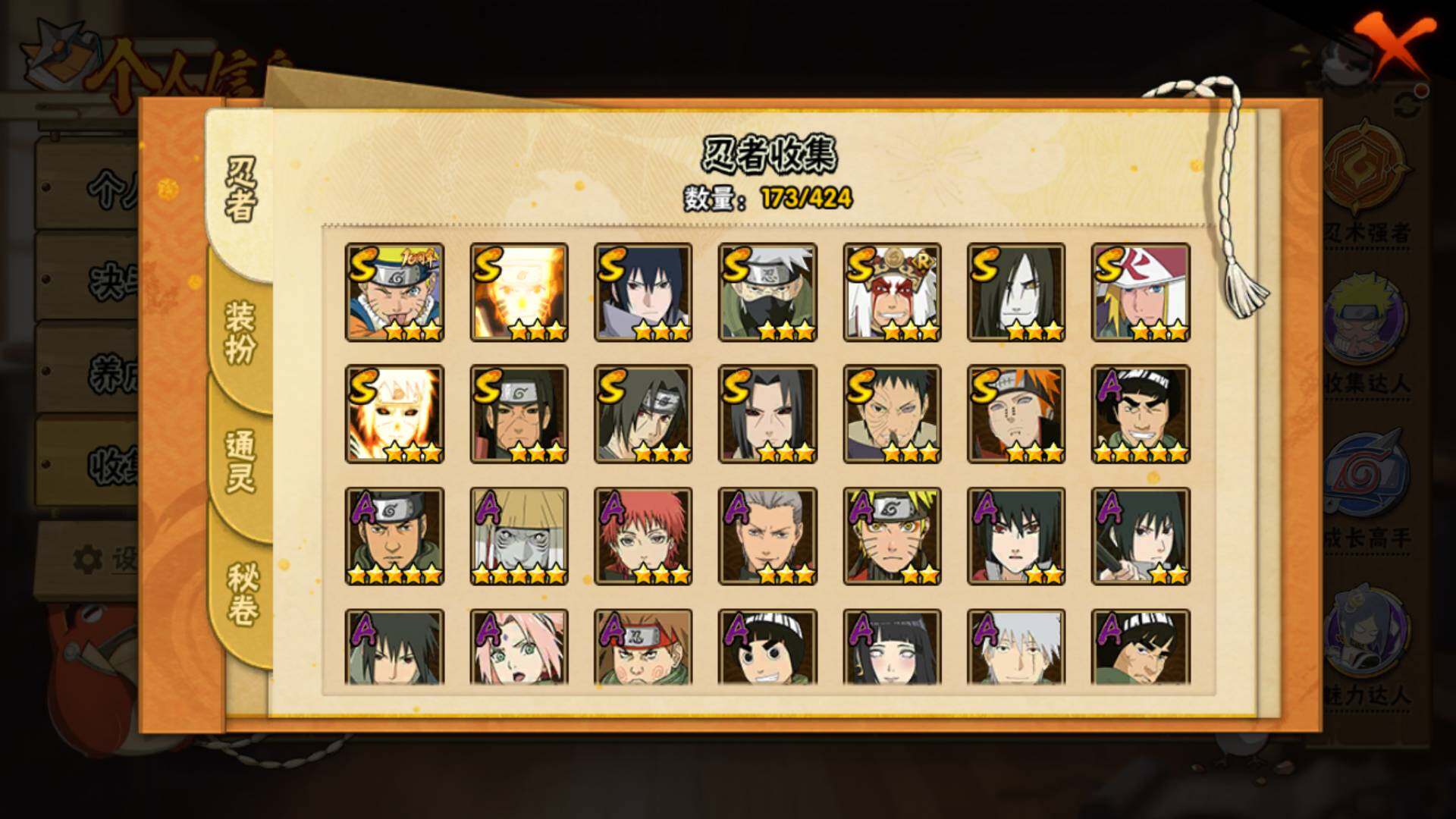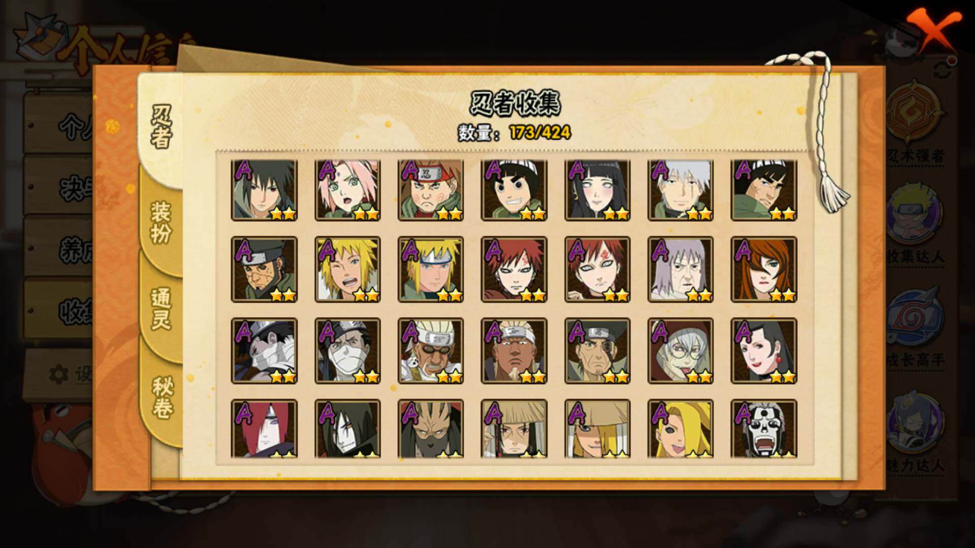 【S级忍者】:千手柱间「秽土转生」(3星),宇智波鼬「秽土转生」(3星),宇智波带土「忍界大战」(3星),宇智波鼬「须佐能乎」(3星),旗木卡卡西「须佐能乎」(3星),自来也「舞之豪杰」(3星),大蛇丸(3星),波风水门(3星),漩涡鸣人「九喇嘛连结」(3星),佩恩「天道」(3星),宇智波佐助「