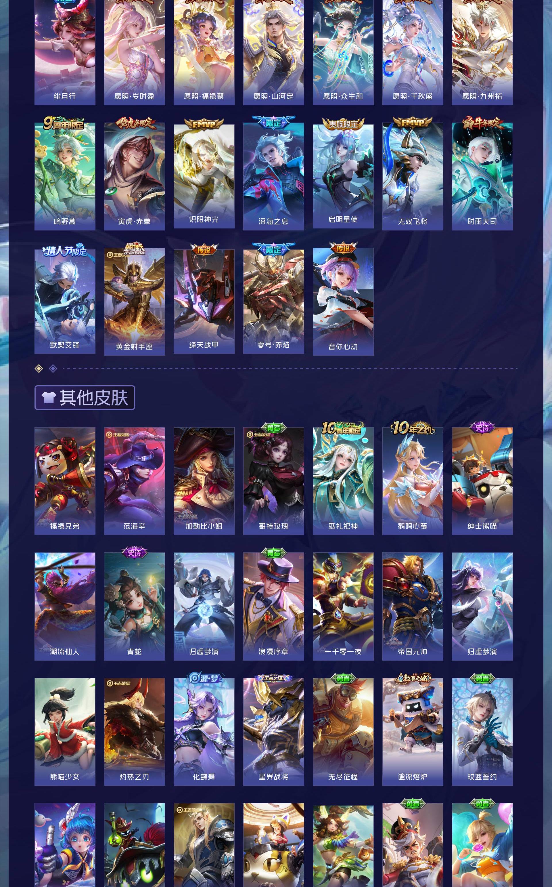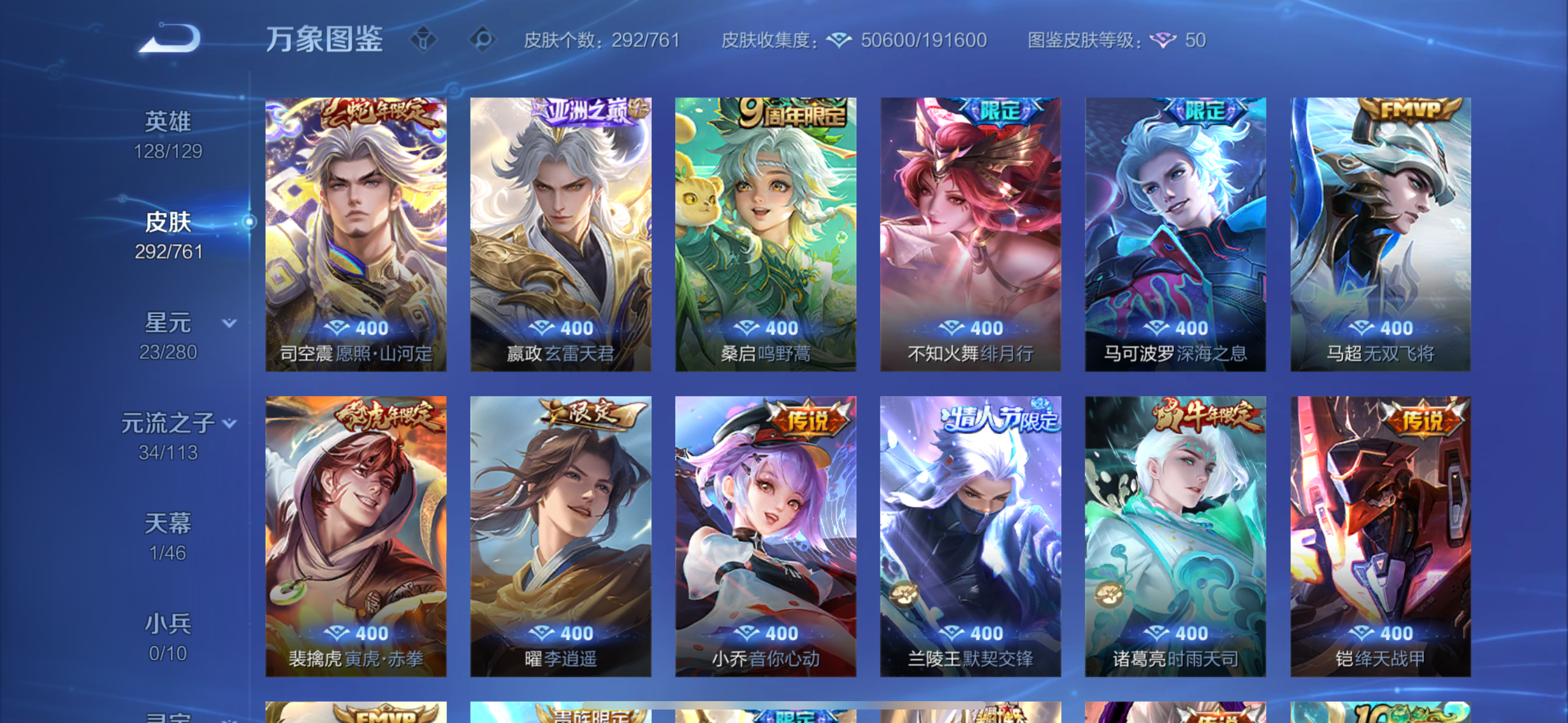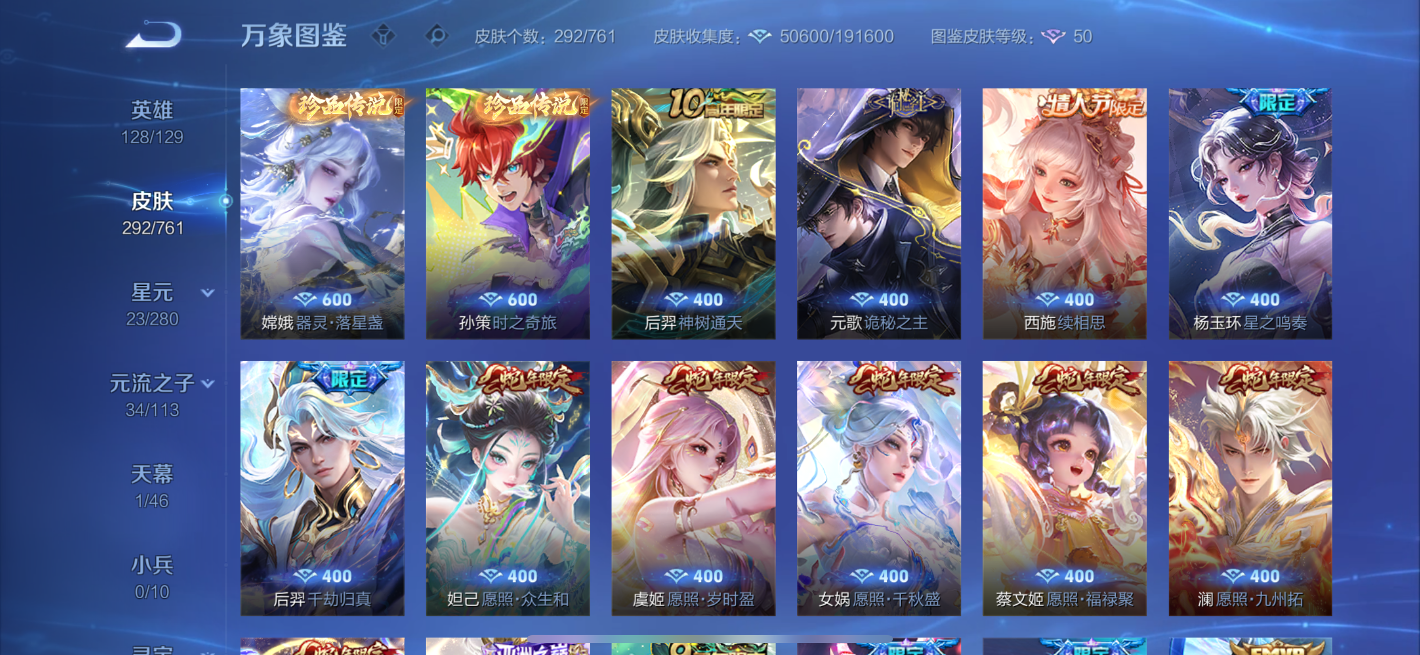 V9 皮肤292 英雄128 荣耀黄金 荣耀典藏2 无双皮肤4 珍品传说2 星传说2 传说27 其他皮肤263