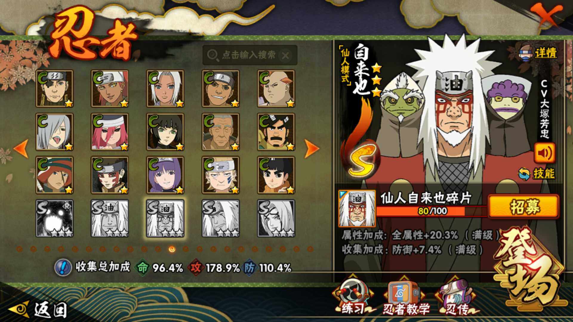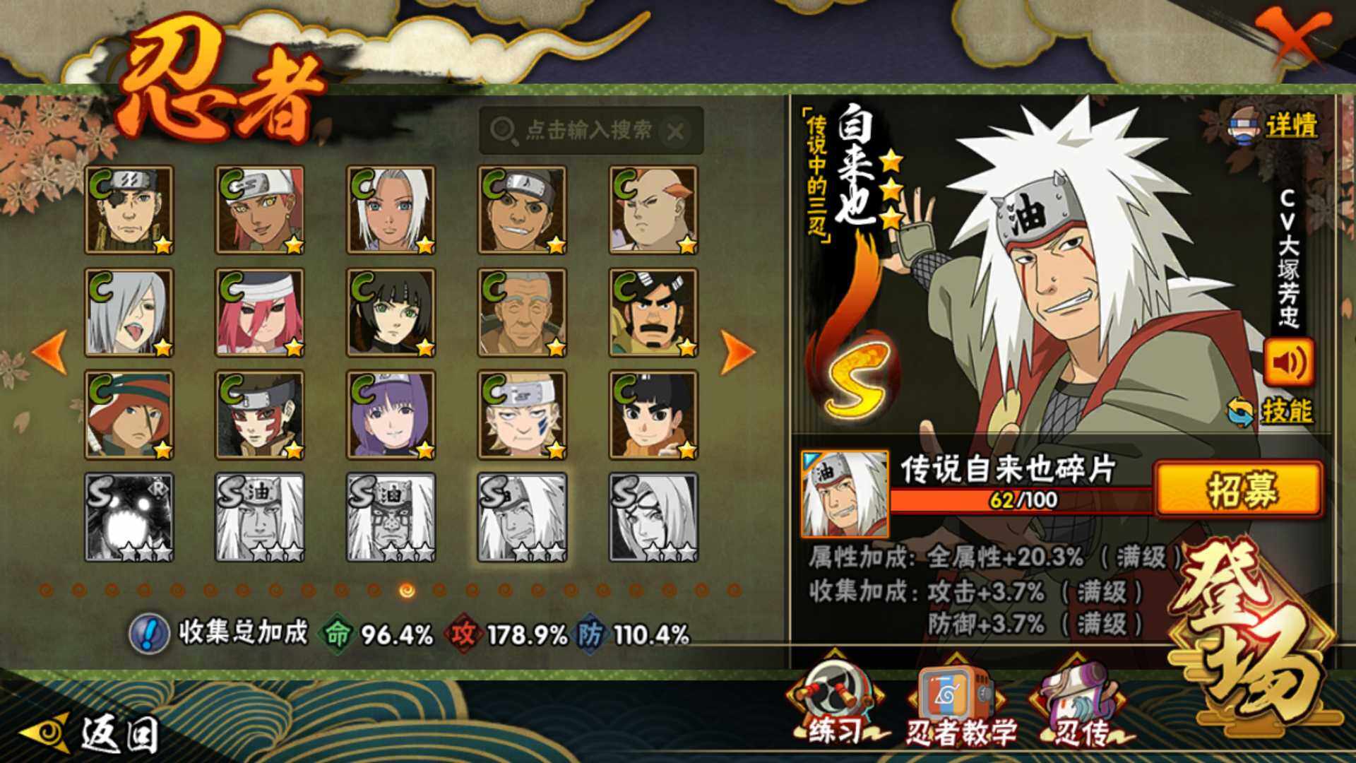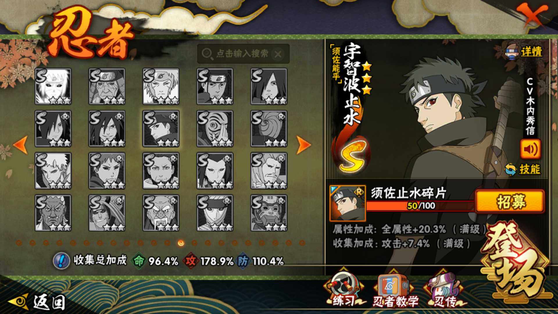 【S级忍者】:波风水门「秽土转生」(3星),千手扉间「秽土转生」(3星),千手柱间「秽土转生」(3星),宇智波鼬「秽土转生」(3星),宇智波斑「秽土转生」(3星),宇智波斑「秽土转生·解」(3星),大野木「忍界大战」(3星),春野樱「忍界大战」(3星)