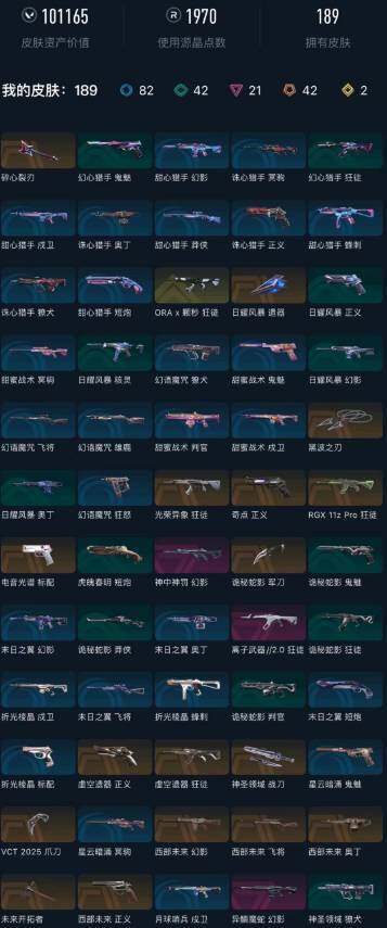 终极*42/传奇*2/卓越*21/皮肤*189/等级*235/段位:铂金/2023全球冠军赛套装/VCT 2025 赛季套装