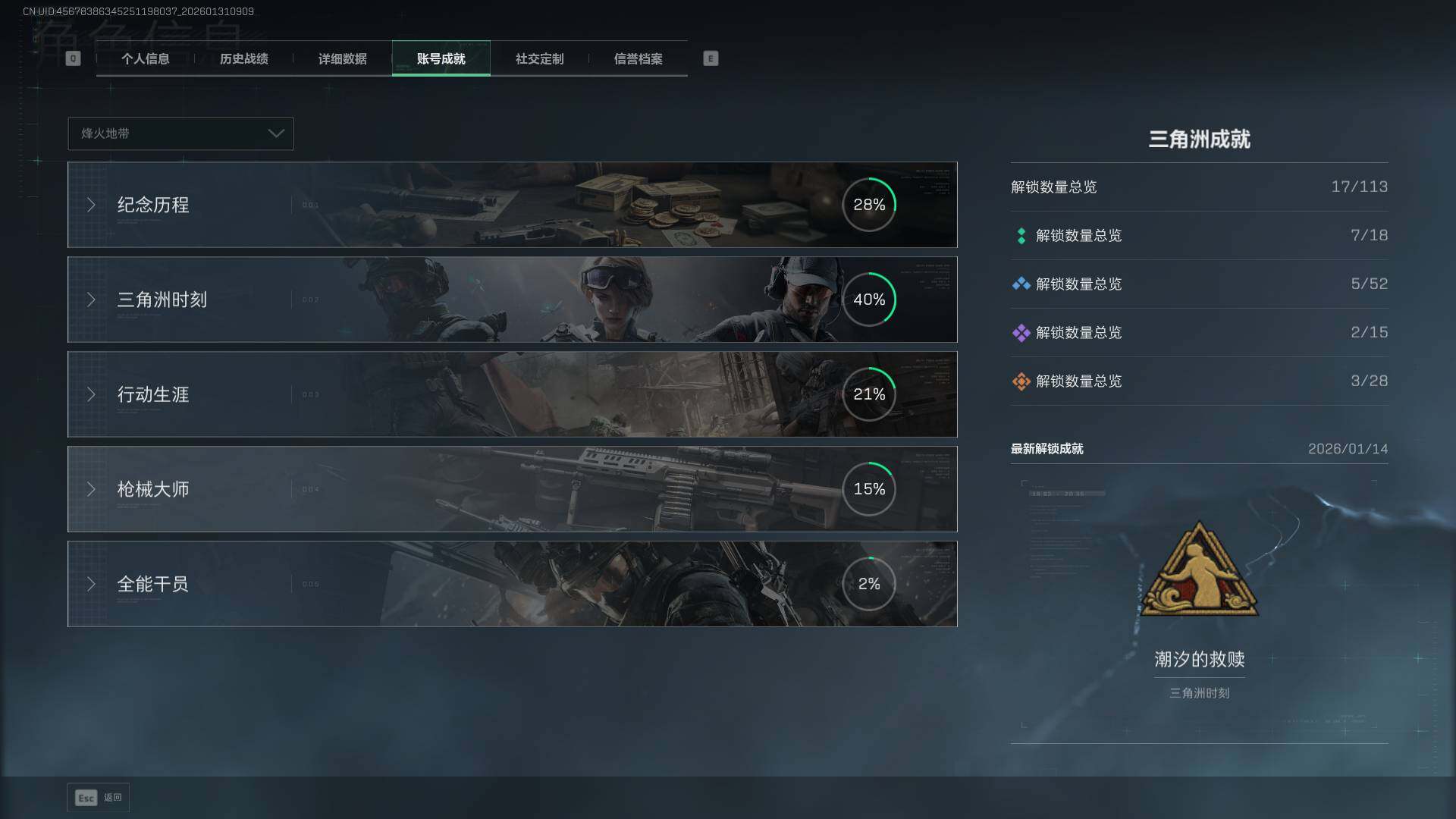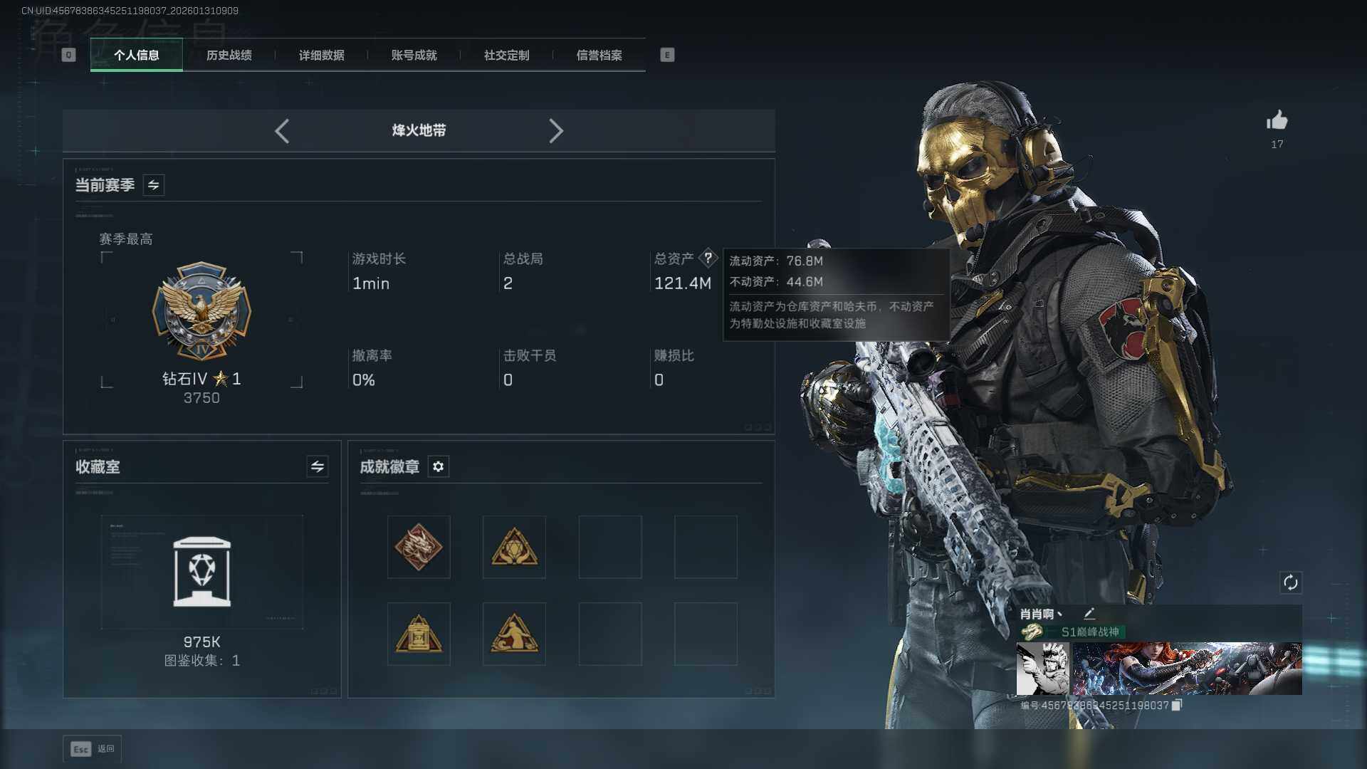 总资产(M):121M/哈夫币(K):2185K/传说枪皮数:10/全面战场等级:30_段位:上等兵/烽火地带等级:60_段位:钻石/