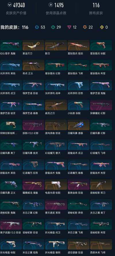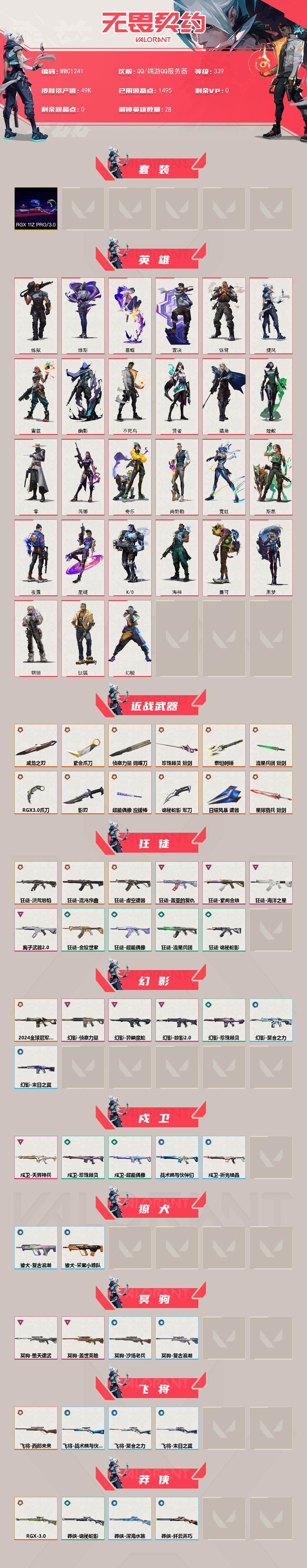 【WWC1241】终极*22/卓越*12/皮肤*116/等级*339/段位:未定级/RGX 11z Pro//3.0套装/幻棱/炼狱/维斯/暮蝶/钛狐/壹决/铁臂/捷风/雷兹/幽影/不死鸟/贤者/猎枭/蝰蛇/零/芮娜/奇乐/尚勃勒/霓虹/斯凯/夜露/星礈/K/O/海神/盖可/黑梦/钢锁/近战武器-侦察力量 蝴蝶刀/近战武器-紫金爪刀/近战武器-RGX 11z Pro//3.0 爪刀/近战武器-威龙之刃/近战武器-珍珠棘贝 短剑/近战武器-流星兵团 短剑/近战武器-超能偶像 应援棒/近战武器-泰坦