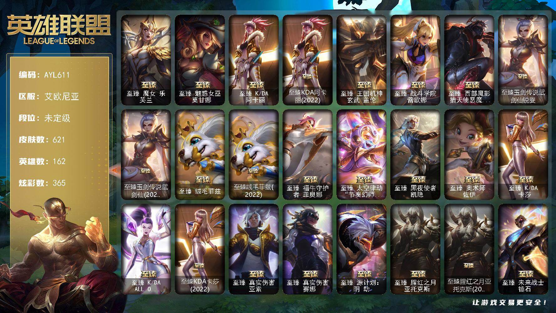 【LD4989】172英雄/527皮肤/23神话/54限定/13臻彩/119炫彩/49传说/125史诗/黄金/十周年纪念安妮/源代码乐芙兰/十五周年纪念希维尔/神凰行者瑞羽圣凰艾尼维亚/水晶圣骑塔莉娅/灰烬杀手塞拉斯/海克斯科技吉格斯/海克斯科技卡萨丁/海克斯科技雷克顿/海克斯科技玛尔扎哈/海克斯科技斯维因/至臻真实伤害赛娜/至臻至高天奎桑提/至臻海珀利安小队X09星环灵风迦娜/至臻幻灵战斗猫金克丝/至臻烈焰美人薇恩/至臻灵能特工伊泽瑞尔/至臻墨之影武者亚索/至臻未来战士卢锡安/至臻星之守护者辛