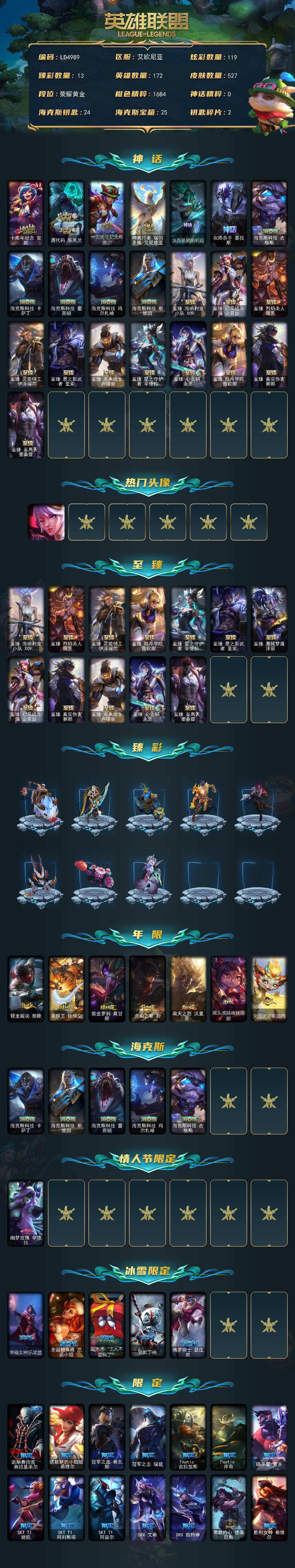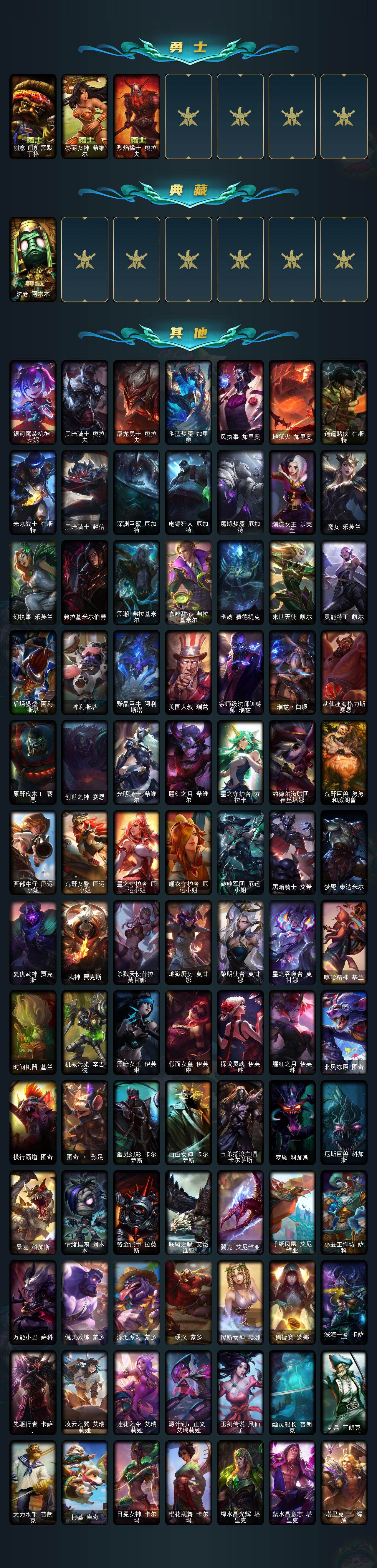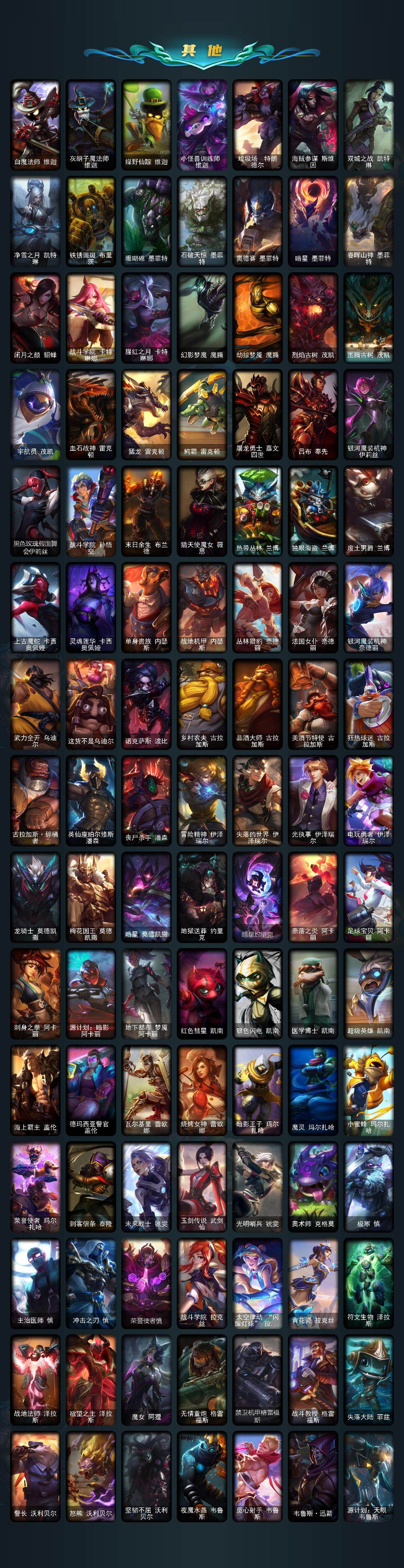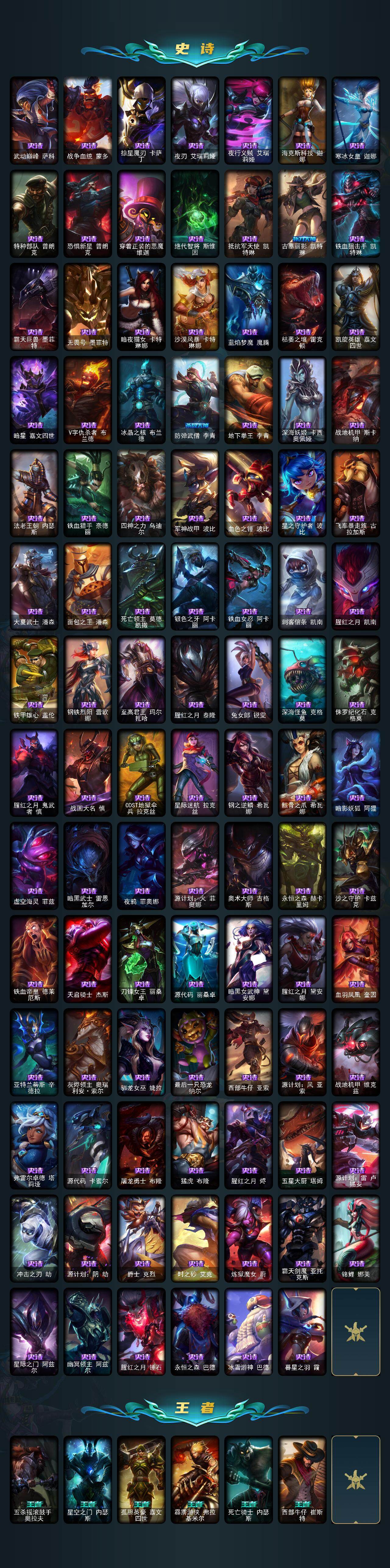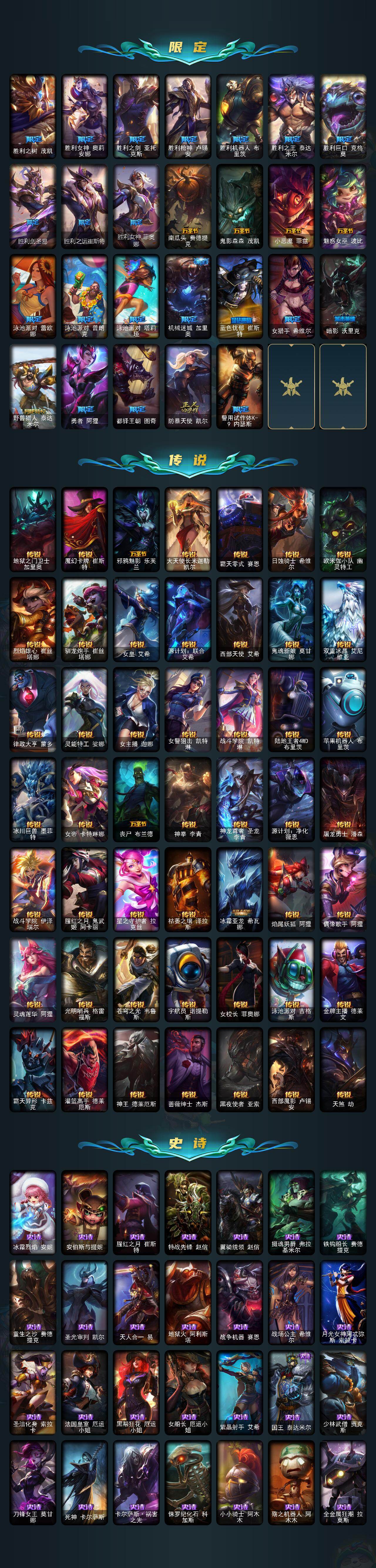 172英雄/527皮肤/23神话/54限定/13臻彩/119炫彩/49传说/125史诗/黄金/十周年纪念安妮/源代码乐芙兰/