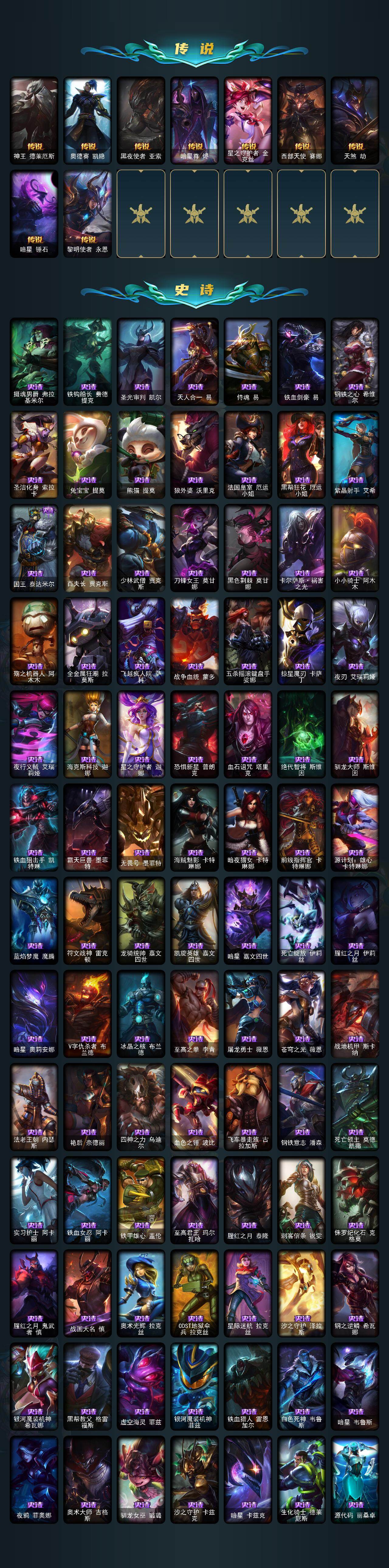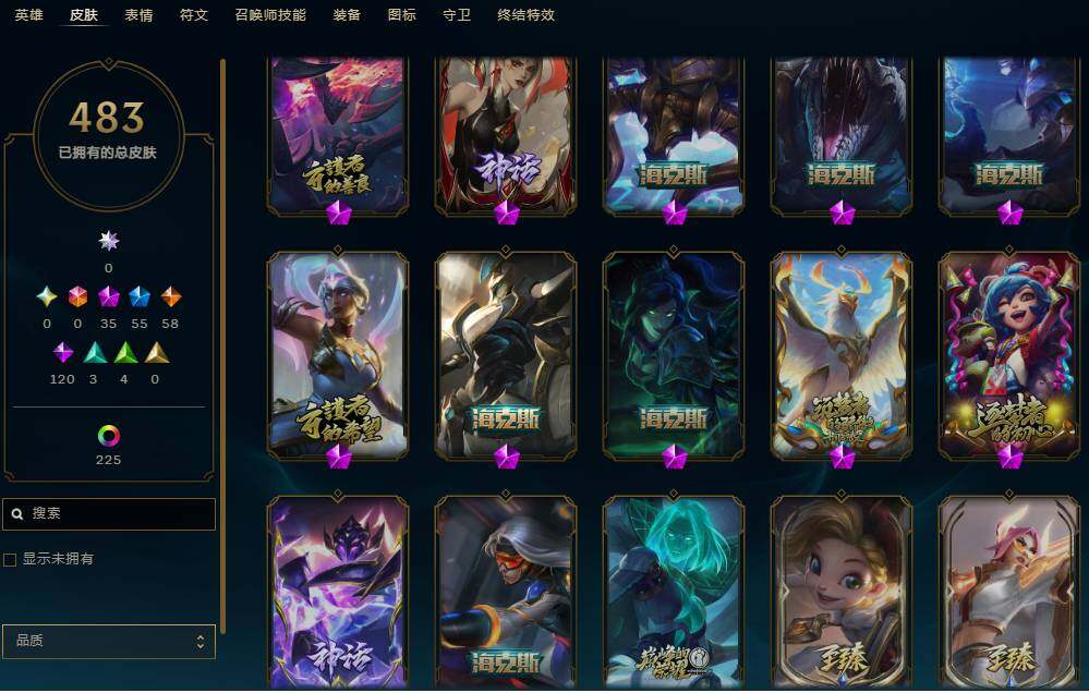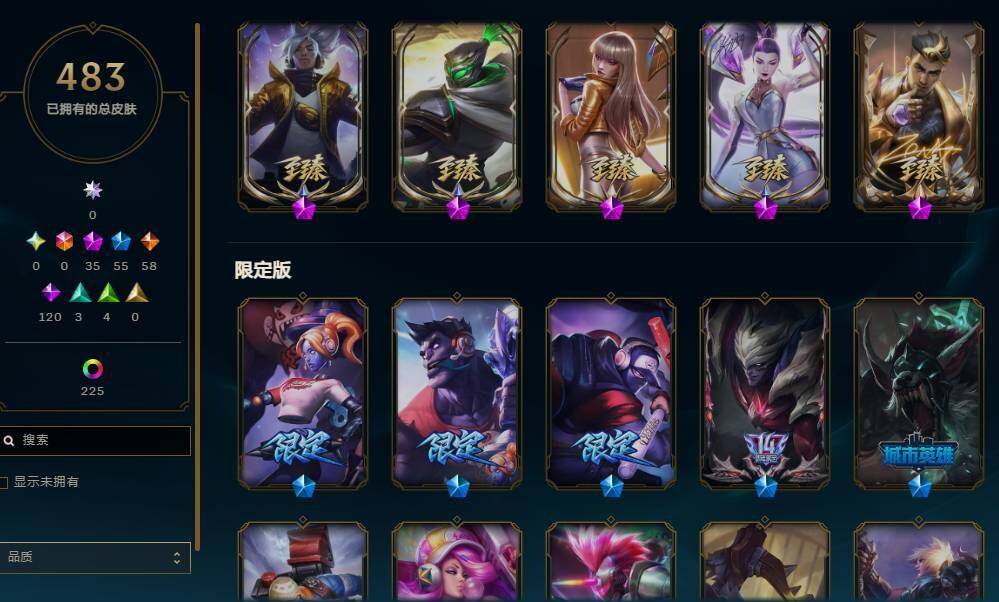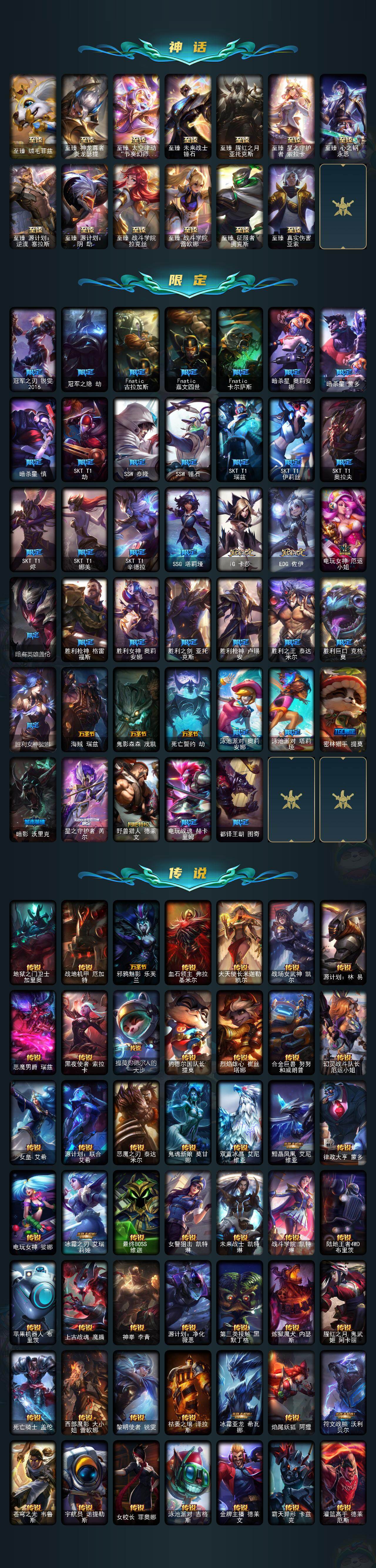 172英雄/483皮肤/35神话/55限定/18臻彩/270炫彩/58传说/120史诗/铂金/十周年纪念安妮/
