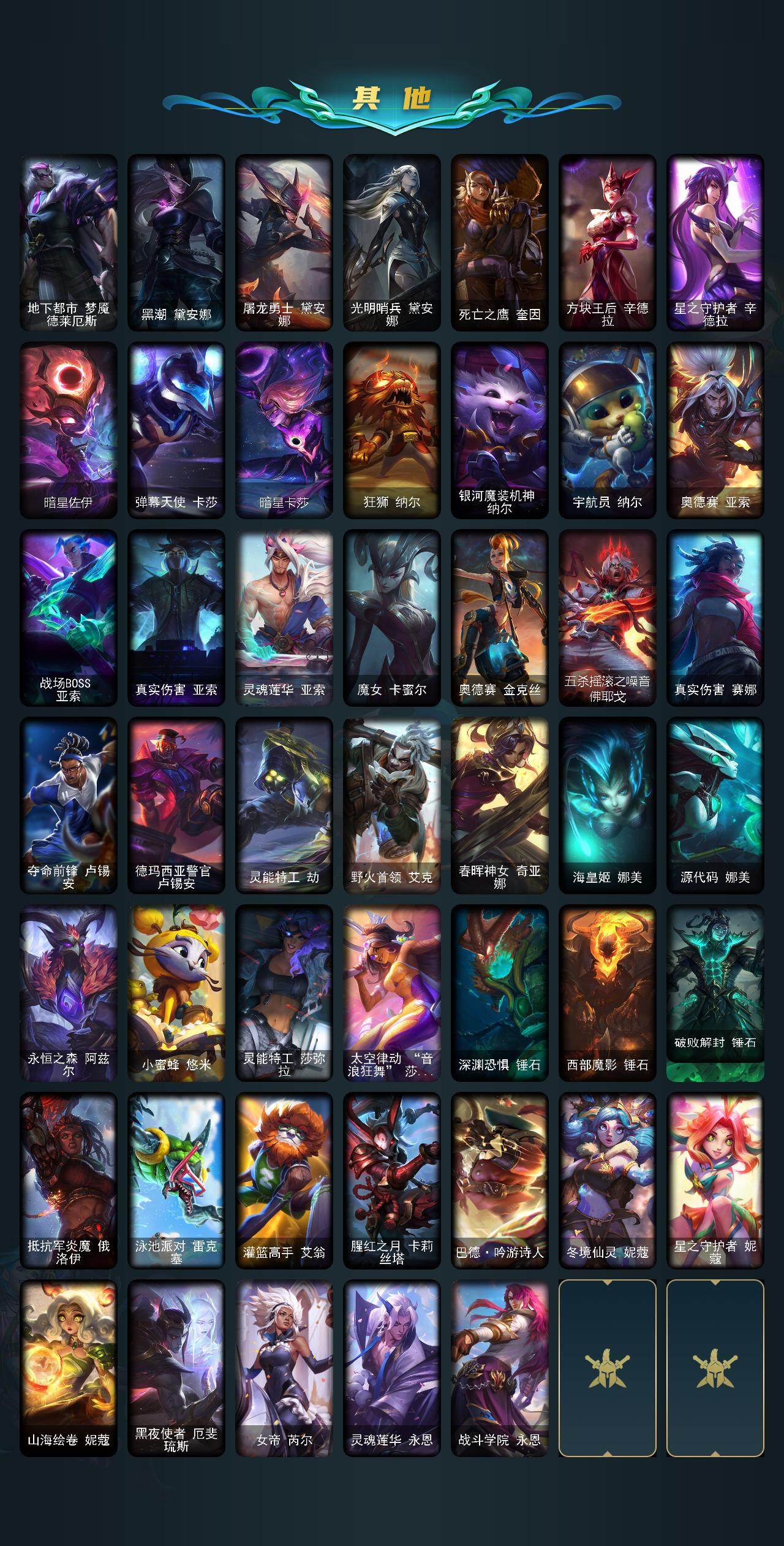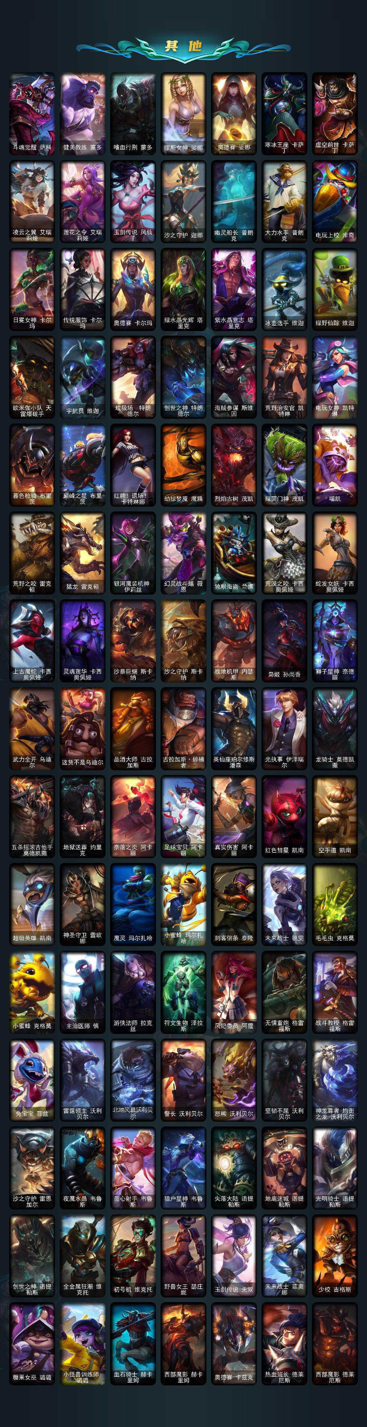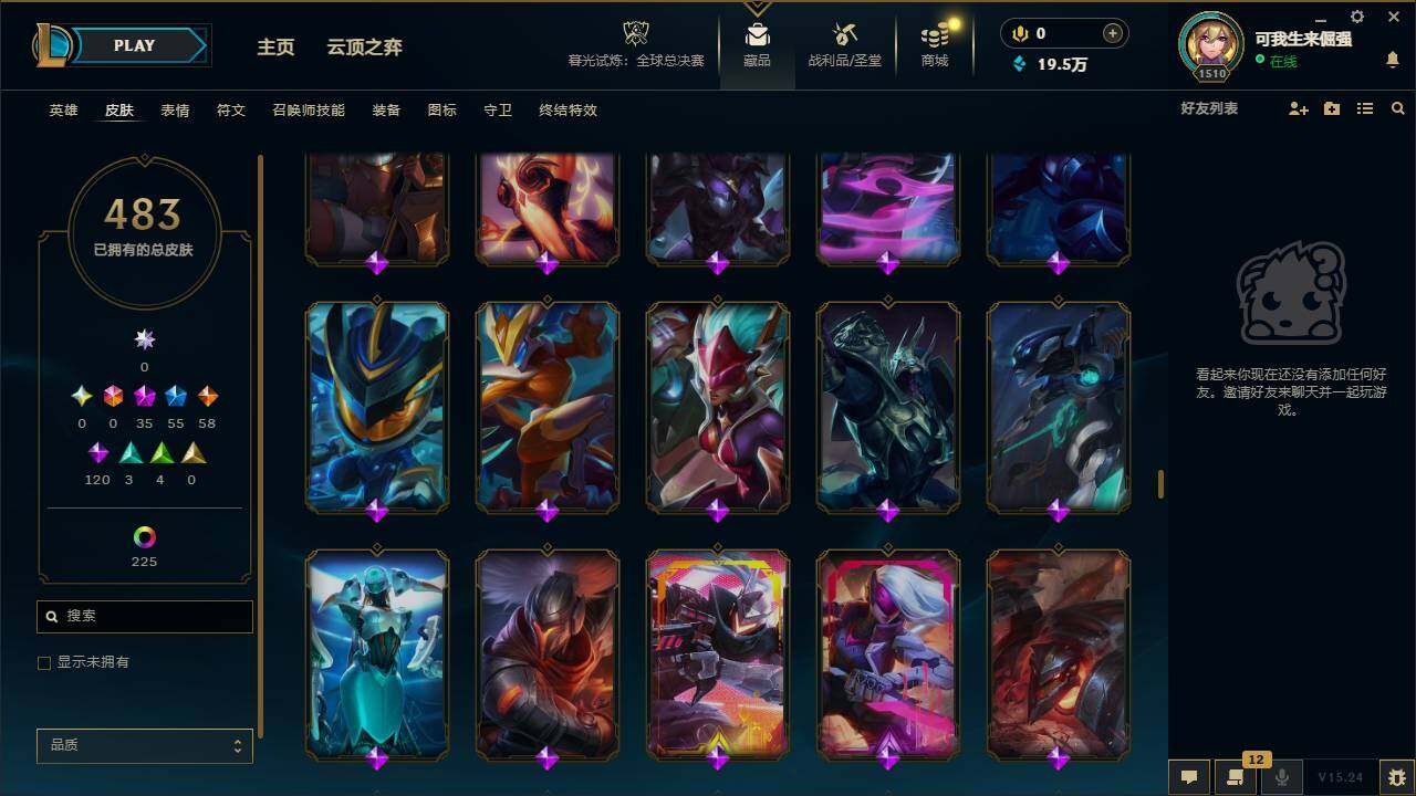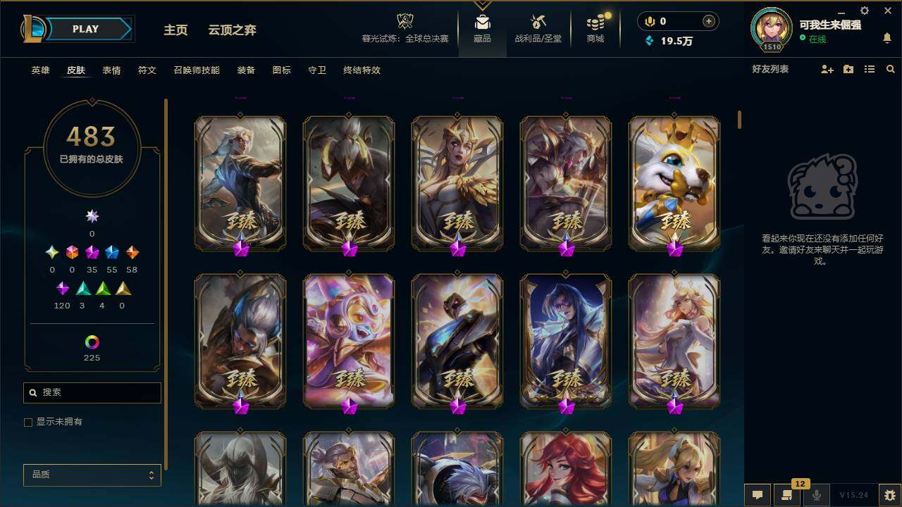 172英雄/483皮肤/35神话/55限定/18臻彩/270炫彩/58传说/120史诗/铂金/十周年纪念安妮/