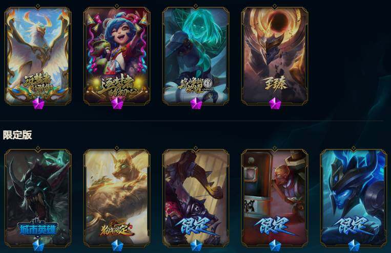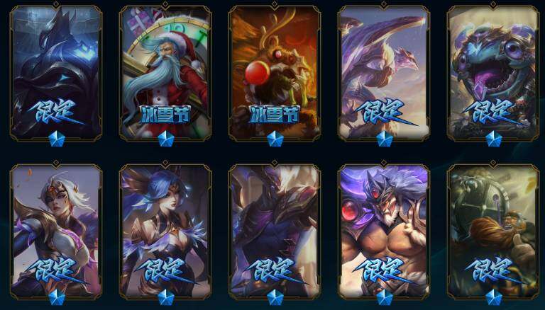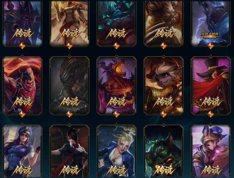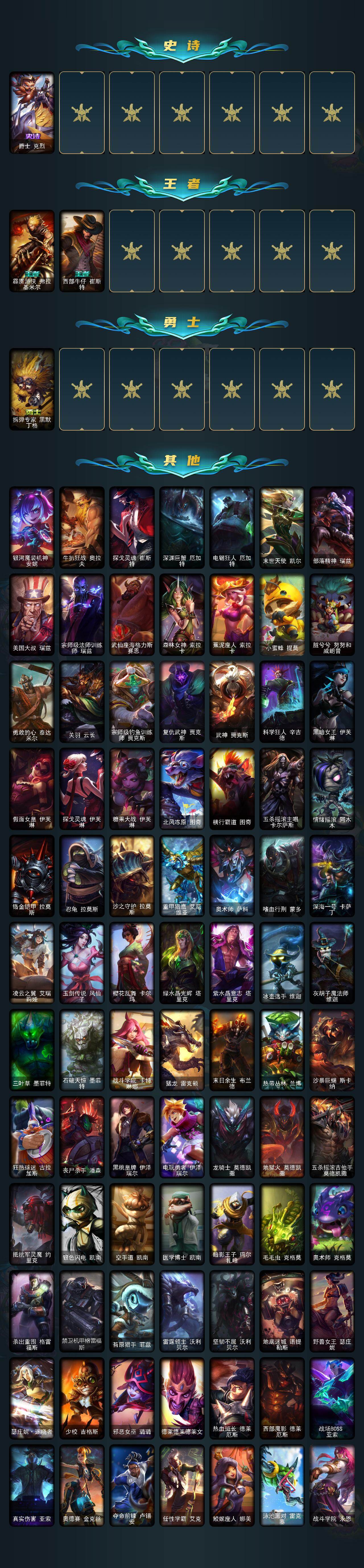 168英雄/171皮肤/4神话/15限定/1臻彩/48炫彩/21传说/43史诗/青铜/十周年纪念安妮/