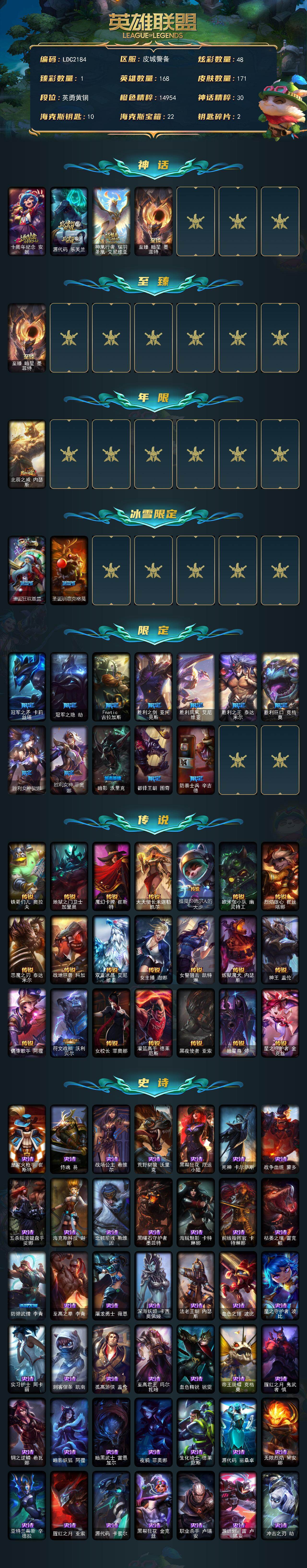 【LDC2184】168英雄/171皮肤/4神话/15限定/1臻彩/48炫彩/21传说/43史诗/青铜/十周年纪念安妮/源代码乐芙兰/神凰行者瑞羽圣凰艾尼维亚/至臻暗星墨菲特/冠军之刃锐雯2016凯旋圣装/北辰之威内瑟斯/圣诞狂欢基兰/圣诞驯鹿克格莫/冠军之矛卡莉丝塔/冠军之隐劫/Fnatic古拉加斯/胜利之剑亚托克斯/胜利凤凰艾尼维亚/胜利之王泰达米尔/胜利巨口克格莫/胜利女神娑娜/胜利女神菲奥娜/暗影沃里克/都铎王朝图奇/防暴士兵辛吉德/铁哥们儿奥拉夫/地狱之门卫士加里奥/魔幻卡牌崔斯特/大